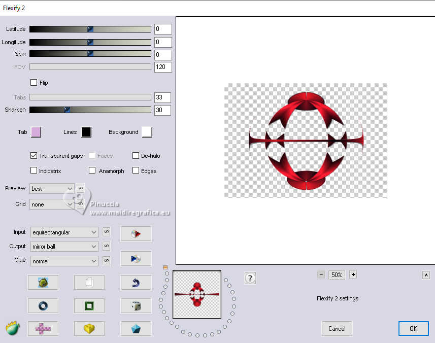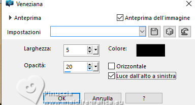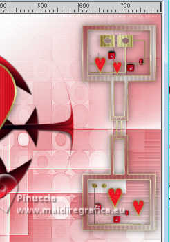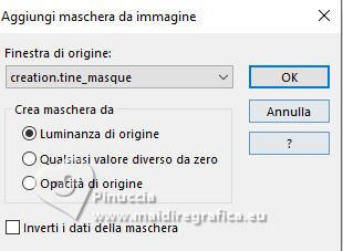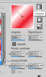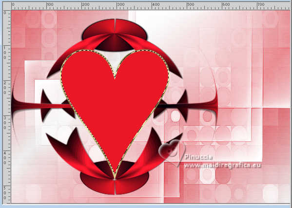 qui puoi trovare qualche risposta ai tuoi dubbi. Se l'argomento che ti interessa non è presente, ti prego di segnalarmelo. Per tradurre il tutorial ho usato PSPX9, ma può essere eseguito con ogni versione di PSP. Dalla versione X4, il comando Immagine>Rifletti è stato sostituito con Immagine>Capovolgi in orizzontale, e il comando Immagine>Capovolgi con Immagine>Capovolgi in verticale. Nelle versioni X5 e X6, le funzioni sono state migliorate rendendo disponibile il menu Oggetti. Con la nuova versione X7, sono tornati Rifletti/Capovolgi, ma con nuove differenze Vedi la scheda sull'argomento qui traduzione in francese qui Le vostre versioni quiOccorrente: ![]() (in questa pagina trovi i links ai siti dei creatori di tubes) Filtri: in caso di dubbi, ricorda di consultare la mia sezione filtri qui Flaming Pear - Flexify 2 qui ![]() se stai usando altri colori, sperimenta le modalità di miscelatura e opacità più adatte ai tuoi colori Nelle ultime versioni di PSP non c'è il gradiente di primo piano/sfondo (Corel_06_029) Puoi usare i gradienti delle versioni precedenti. Trovi qui i gradienti Corel X. ![]() Apri la maschera in PSP e minimizzala con il resto del materiale. Imposta il colore di primo piano con il colore bianco #ffffff, e il colore di sfondo con il colore rosso #eb1927. ![]() Passa il colore di primo piano a Gradiente di primo piano/sfondo, stile Lineare. ![]() 1. Apri una nuova immagine trasparente 800 x 550 pixels. ![]() Riempi l'immagine trasparente con il gradiente.2. Effetti>Effetti di trama>Veneziana - colore nero. ![]() 3. Livelli>Nuovo livello raster. Passa il colore di primo piano a Colore. Riempi il livello con il colore bianco di primo piano #ffffff.4. Livelli>Nuovo livello maschera>Da immagine. Apri il menu sotto la finestra di origine e vedrai la lista dei files aperti. Seleziona la maschera creation.tine_masque. ![]() Livelli>Unisci>Unisci gruppo. Cambia la modalità di miscelatura di questo livello in Filtra. Effetti>Effetti di bordo>Aumenta. 5. Apri frame-12-2025 ![]() Rimani su questa immagine: Effetti>Plugins>Flaming Pear - Flexify 2. ![]() 6. Modifica>Copia. Torna al tuo lavoro e vai a Modifica>Incolla come nuovo livello. 7. Immagine>Ridimensiona, al 130%, tutti i livelli non selezionato. ![]() Regola>Messa a fuoco>Metti a fuoco. Oggetti>Allinea>Sinistra. 8. Apri Hart-1 ![]() Modifica>Copia. Torna al tuo lavoro e vai a Modifica>Incolla come nuovo livello. Sposta il cuore al centro della sfera.9. Attiva lo strumento Bacchetta magica , sfumatura e tolleranza 0,![]() e clicca al centro del cuore per selezionarlo ![]() 10.Effetti>Effetti di trama>Veneziana - colore nero, orizzontale non selezionato. ![]() Mantieni selezionato. 11. Apri 792 ![]() Modifica>Copia. Torna al tuo lavoro e vai a Modifica>Incolla come nuovo livello. Posiziona il tube nella selezione.![]() Selezione>Inverti. Premi sulla tastiera il tasto CANC ![]() Selezione>Deseleziona. 12. Apri Vlinders ![]() Modifica>Copia. Torna al tuo lavoro e vai a Modifica>Incolla come nuovo livello. Scegli le farfalle (ciascuna sul proprio livello) e posizionale a tuo piacimento; per me![]() 13. Attiva il livello del cuore, Raster 3. Effetti>Effetti 3D>Sfalsa ombra, colore nero. ![]() 14. Apri il tube deco-1-14-2025 ![]() Modifica>Copia. Torna al tuo lavoro e vai a Modifica>Incolla come nuovo livello. Sposta il tube a destra.Tasto K per attivare lo strumento Puntatore ![]() Posizione X: 610,00 - Posizione Y: 27,00. ![]() Tasto M per deselezionare lo strumento. Effetti>Effetti 3D>Sfalsa ombra, con i settaggi precedenti. ![]() 15. Apri deco-mb14-2025 ![]() Modifica>Copia. Torna al tuo lavoro e vai a Modifica>Incolla come nuovo livello. Sposta il tube a destra, sul tube precedente.![]() Effetti>Effetti 3D>Sfalsa ombra, con i settaggi precedenti. ![]() 16. Immagine>Aggiungi bordatura, 2 pixels, simmetriche, colore scuro. Selezione>Seleziona tutto. Immagine>Aggiungi bordatura, 35 pixels, simmetriche, colore chiaro. 17. Effetti>Effetti 3D>Sfalsa ombra, con i settaggi precedenti. ![]() Selezione>Deseleziona. 18. Immagine>Aggiungi bordatura, 2 pixels, simmetriche, colore scuro. Firma il tuo lavoro su un nuovo livello. Livelli>Unisci>Unisci tutto e salva in formato jpg. Immagine di Pinterest ![]() ![]() Se hai problemi o dubbi, o trovi un link non funzionante, o anche soltanto per un saluto, scrivimi. |