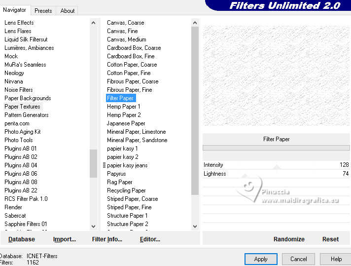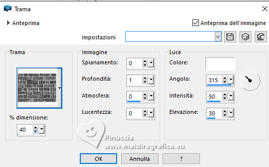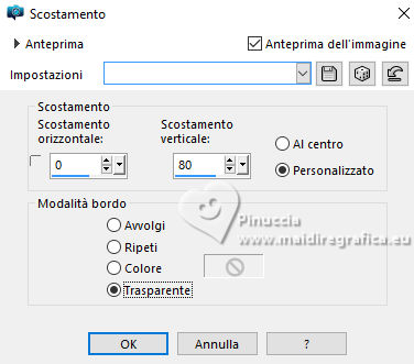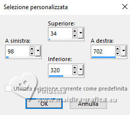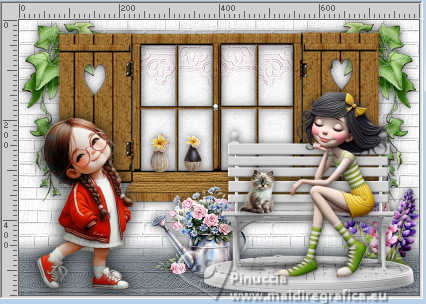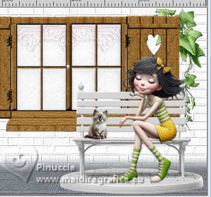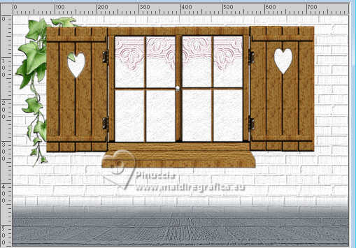 qui puoi trovare qualche risposta ai tuoi dubbi. Se l'argomento che ti interessa non è presente, ti prego di segnalarmelo. Per tradurre il tutorial ho usato PSPX9, ma può essere eseguito con ogni versione di PSP. Dalla versione X4, il comando Immagine>Rifletti è stato sostituito con Immagine>Capovolgi in orizzontale, e il comando Immagine>Capovolgi con Immagine>Capovolgi in verticale. Nelle versioni X5 e X6, le funzioni sono state migliorate rendendo disponibile il menu Oggetti. Con la nuova versione X7, sono tornati Rifletti/Capovolgi, ma con nuove differenze Vedi la scheda sull'argomento qui traduzione in francese qui Le vostre versioni quiOccorrente: ![]() I tubes vengono da Pinterest. La finestra è di Mieke. (in questa pagina trovi i links ai siti dei creatori di tubes) Filtri: in caso di dubbi, ricorda di consultare la mia sezione filtri qui Filters Unlimited 2.0 qui ![]() se stai usando altri colori, sperimenta le modalità di miscelatura e opacità più adatte ai tuoi colori ![]() 1. Apri una nuova immagine trasparente 800 x 550 pixels. ![]() 2. Imposta il colore di primo piano con il colore bianco #ffffff. Riempi l'immagine trasparente con il colore bianco.3. Effetti>Plugins>Filters Unlimited 2.0 - Paper Textures - Filter Paper, con i settaggi standard. ![]() 4. Livelli>Nuovo livello raster. Riempi il livello con il colore bianco.5. Effetti>Effetti di trama>Trama - seleziona la trama muro di mattoni o Corel_15_032. ![]() 6. Attiva lo strumento Selezione ![]() (non importa il tipo di selezione impostato, perchè con la selezione personalizzata si ottiene sempre un rettangolo) clicca sull'icona Selezione personalizzata ![]() e imposta i seguenti settaggi. ![]() Premi sulla tastiera il tasto CANC ![]() Selezione>Deseleziona. 7. Apri Kozijn-mb-2-png ![]() Modifica>Copia. Torna al tuo lavoro e vai a Modifica>Incolla come nuovo livello. 8. Effetti>Effetti di immagine>Scostamento. ![]() 9. Apri il tube tegels ![]() Modifica>Copia. Torna al tuo lavoro e vai a Modifica>Incolla come nuovo livello. Oggetti>Allinea>Inferiore. 10. Apri il tube Gordijn ![]() Modifica>Copia. Torna al tuo lavoro e vai a Modifica>Incolla come nuovo livello. Spostalo sulla finestraLivelli>Disponi>Sposta giù - 2 volte ![]() 11. Apri il tube Klimop ![]() Modifica>Copia. Torna al tuo lavoro e vai a Modifica>Incolla come nuovo livello. Spostalo nell'angolo in alto a sinistra della finestra.![]() 12. Livelli>Duplica. Immagine>Rifletti>Rifletti orizzontalmente (Immagine>Rifletti). 13. Apri il tube glas_raam_mb.psp ![]() Modifica>Copia. Torna al tuo lavoro e vai a Modifica>Incolla come nuovo livello. Sposta il tube sul riquadro della finestra.14. Apri il tube Bank ![]() Modifica>Copia. Torna al tuo lavoro e vai a Modifica>Incolla come nuovo livello. Livelli>Disponi>Porta in alto. Sposta il tube a destra15. Apri il tube pinterest.zit.png ![]() Modifica>Copia. Torna al tuo lavoro e vai a Modifica>Incolla come nuovo livello. Posiziona il tube sulla panchina.16. Apri il tube Poes ![]() Modifica>Copia. Torna al tuo lavoro e vai a Modifica>Incolla come nuovo livello. Sposta anche questo tube sulla panchina.![]() 17. Apri il tube Bloemen ![]() Modifica>Copia. Torna al tuo lavoro e vai a Modifica>Incolla come nuovo livello. Livelli>Disponi>Sposta giù e ripeti - deve trovarsi sotto il livello della panchina. ![]() Attiva il livello superiore. 18. Apri il tube raam-deco ![]() Modifica>Copia. Torna al tuo lavoro e vai a Modifica>Incolla come nuovo livello. Posiziona sul davanzale della finestra, o come preferisci.19. Apri il tube pinterest-908 ![]() Modifica>Copia. Torna al tuo lavoro e vai a Modifica>Incolla come nuovo livello. Posiziona il tube a sinistra, o come preferisci.20. Apri il tube gieter ![]() Modifica>Copia. Torna al tuo lavoro e vai a Modifica>Incolla come nuovo livello. Posiziona il tube a tuo piacimento, o vedi il mio esempio.Sposta il livello sotto il livello della panchina. ![]() 21. Applica ai tubes un effetto Sfalsa ombra a tua scelta, oppure usa questo: Effetti>Effetti 3D>Sfalsa ombra, colore nero. ![]() 22. Immagine>Aggiungi bordatura, 2 pixels, simmetriche, colore scuro, per il mio esempio nero. Immagine>Aggiungi bordatura, 25 pixels, simmetriche, colore chiaro, per il mio esempio bianco. Immagine>Aggiungi bordatura, 2 pixels, simmetriche, colore scuro, per il mio esempio nero. 23. Firma il tuo lavoro su un nuovo livello. Livelli>Unisci>Unisci tutto e salva in formato jpg. ![]() ![]() Se hai problemi o dubbi, o trovi un link non funzionante, o anche soltanto per un saluto, scrivimi. |