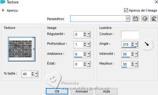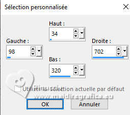 Pour traduire ce tutoriel j'ai utilisé PSPX9, mais il peut également être exécuté avec les autres versions. Suivant la version utilisée, vous pouvez obtenir des résultats différents. Depuis la version X4, la fonction Image>Miroir a été remplacée par Image>Renverser horizontalement, et Image>Renverser avec Image>Renverser verticalement. Dans les versions X5 et X6, les fonctions ont été améliorées par la mise à disposition du menu Objets. Dans la nouvelle version X7, nous avons à nouveau Miroir/Renverser, mais avec autres différences. Voir plus les détails à ce sujet ici Certaines dénominations ont changées entre les versions de PSP. Les plus frequentes dénominations utilisées: ![]() Traduction en italien ici Vos versions iciNécessaire pour réaliser ce tutoriel: ![]() (les liens des sites des tubeuses ici) Modules Externes consulter, si nécessaire, ma section de filtre ici Filters Unlimited 2.0 ici ![]() Si vous voulez utiliser vos propres couleurs, n'hésitez pas à changer le mode et l'opacité des calques ![]() 1. Ouvrir une nouvelle image transparente 800 x 550 pixels. ![]() 2. Placer en avant plan la couleur blanche #ffffff. Remplir l'image transparente avec la couleur blanche.3. Effets>Modules Externes>Filters Unlimited 2.0 - Paper Textures - Filter Paper, par défaut. ![]() 4. Calques>Nouveau calque raster. Remplir le calque avec la couleur blanche.5. Effets>Effets de textures>Texture - sélectionner la texture mur de briques ou Corel_15_032. ![]() 6. Activer l'outil Sélection ![]() (peu importe le type de sélection, parce que avec la sélection personnalisée vous obtenez toujours un rectangle), cliquer sur Sélection personnalisée ![]() et setter ces paramètres. ![]() Presser CANC sur le clavier ![]() Sélections>Désélectionner tout. 7. Ouvrir Kozijn-mb-2-png ![]() Édition>Copier. Revenir sur votre travail et Édition>Coller comme nouveau calque. 8. Effets>Effets d'image>Décalage ![]() 9. Ouvrir le tube tegels ![]() Édition>Copier. Revenir sur votre travail et Édition>Coller comme nouveau calque. Objets>Aligner>Bas. 10. Ouvrir le tube Gordijn ![]() Édition>Copier. Revenir sur votre travail et Édition>Coller comme nouveau calque. Déplacer le tube sur la fenêtre.Calques>Agencer>Déplacer vers le bas - 2 fois. ![]() 11. Ouvrir le tube Klimop ![]() Édition>Copier. Revenir sur votre travail et Édition>Coller comme nouveau calque. Déplacer le tube dans le coin en haut à gauche de la fenêtre.![]() 12. Calques>Dupliquer. Image>Miroir>Miroir horizontal (Image>Miroir). 13. Ouvrir le tube glas_raam_mb.psp ![]() Édition>Copier. Revenir sur votre travail et Édition>Coller comme nouveau calque. Move le tube sur le cadre de la fenêtre.14. Ouvrir le tube Bank ![]() Édition>Copier. Revenir sur votre travail et Édition>Coller comme nouveau calque. Calques>Agencer>Placer en haut de la pile. Déplacer le tube à droite.15. Ouvrir le tube pinterest.zit.png ![]() Édition>Copier. Revenir sur votre travail et Édition>Coller comme nouveau calque. Positionner le tube sur le banc.16. Ouvrir le tube Poes ![]() Édition>Copier. Revenir sur votre travail et Édition>Coller comme nouveau calque. Positionner également ce tube sur le banc.![]() 17. Ouvrir le tube Bloemen ![]() Édition>Copier. Revenir sur votre travail et Édition>Coller comme nouveau calque. Calques>Agencer>Déplacer vers le bas, et répéter - il doit se trouver sous le calque du banc. ![]() Vous positionner sur le calque du haut de la pile. 18. Ouvrir le tube raam-deco ![]() Édition>Copier. Revenir sur votre travail et Édition>Coller comme nouveau calque. Positionner le tube sur la fenêtre, ou à votre goût.19. Ouvrir le tube pinterest-908 ![]() Édition>Copier. Revenir sur votre travail et Édition>Coller comme nouveau calque. Déplacer le tube à gauche, ou à votre goˆt.20. Ouvrir le tube gieter ![]() Édition>Copier. Revenir sur votre travail et Édition>Coller comme nouveau calque. Positionner le tube à votre goût ou voir mon exemple.Déplacer ce calque au dessous du calque du banc. ![]() 21. Appliquer sur chaque tubes un effet Ombre portée à choix, ou utiliser ceci: Effets>Effets 3D>Ombre portée, couleur noire. ![]() 22. Image>Ajouter des bordures, 2 pixels, symétrique, couleur foncée, pour moi noir Image>Ajouter des bordures, 25 pixels, symétrique, couleur claire, pour moi blanc. Image>Ajouter des bordures, 2 pixels, symétrique, couleur foncée, pour moi noir 23. Signer votre travail sur un nouveau calque. Calques>Fusionner>Tous et enregistrer en jpg. ![]() ![]() Si vous avez des problèmes, ou des doutes, ou vous trouvez un link modifié, ou seulement pour me dire que ce tutoriel vous a plu, vous pouvez m'écrire. |