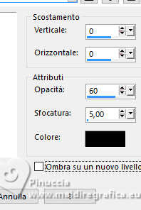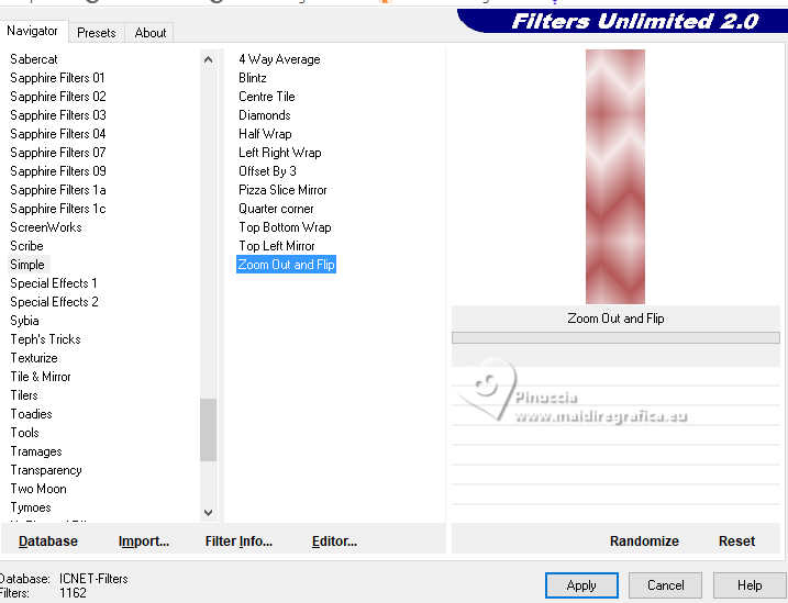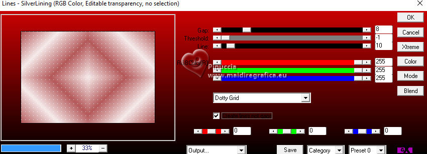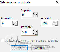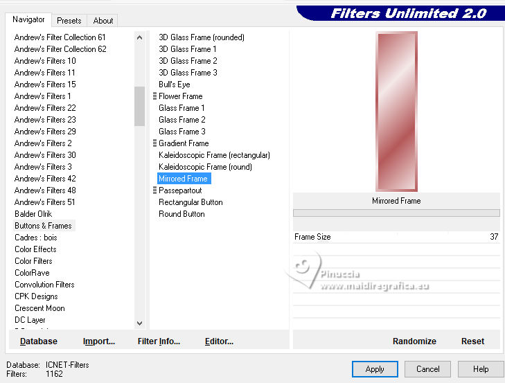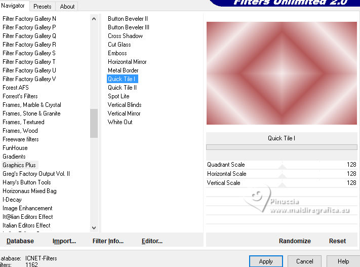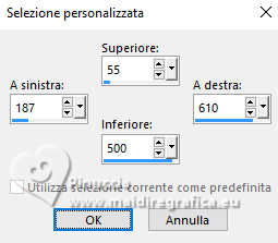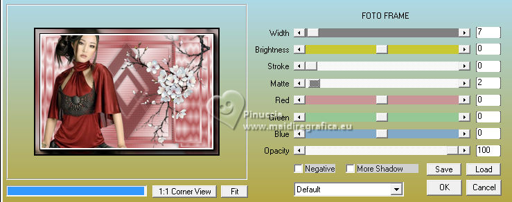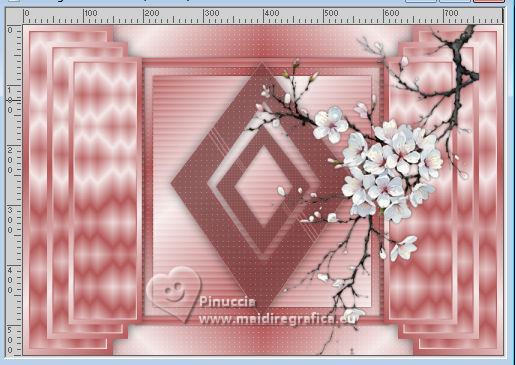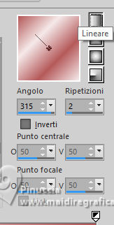 qui puoi trovare qualche risposta ai tuoi dubbi. Se l'argomento che ti interessa non è presente, ti prego di segnalarmelo. Per tradurre il tutorial ho usato PSPX9, ma può essere eseguito con ogni versione di PSP. Dalla versione X4, il comando Immagine>Rifletti è stato sostituito con Immagine>Capovolgi in orizzontale, e il comando Immagine>Capovolgi con Immagine>Capovolgi in verticale. Nelle versioni X5 e X6, le funzioni sono state migliorate rendendo disponibile il menu Oggetti. Con la nuova versione X7, sono tornati Rifletti/Capovolgi, ma con nuove differenze Vedi la scheda sull'argomento qui traduzione in francese qui Le vostre versioni quiOccorrente: ![]() (in questa pagina trovi i links ai siti dei creatori di tubes) Filtri: in caso di dubbi, ricorda di consultare la mia sezione filtri qui Filters Unlimited 2.0 qui Graphics Plus - Quick Tile I qui Simple - Zoom Out and Flip qui AP 01 [Innovations] - Lines SilverLining qui AAA Frames - Foto Frame qui I filtri Graphics Plus e Simple si possono usare da soli o importati in Filters Unlimited (come fare vedi qui) Se un filtro fornito appare con questa icona ![]() se stai usando altri colori, sperimenta le modalità di miscelatura e opacità più adatte ai tuoi colori Nelle ultime versioni di PSP non c'è il gradiente di primo piano/sfondo (Corel_06_029) Puoi usare i gradienti delle versioni precedenti. Trovi qui i gradienti Corel X. ![]() 1. Imposta il colore di primo piano con #f5e9e9, e il colore di sfondo con #b5595a. ![]() Passa il colore di primo piano a Gradiente di primo piano/sfondo, stile Lineare. ![]() 2. Apri una nuova immagine trasparente 800 x 550 pixels. ![]() Riempi l'immagine trasparente con il gradiente.3. Effetti>Plugins>Filters Unlimited 2.0 - Graphics Plus - Quick Tile I, con i settaggi standard. ![]() 4. Attiva lo strumento Selezione ![]() (non importa il tipo di selezione impostato, perchè con la selezione personalizzata si ottiene sempre un rettangolo) clicca sull'icona Selezione personalizzata ![]() e imposta i seguenti settaggi. ![]() 5. Livelli>Nuovo livello raster. Riempi il livello con il gradiente.6. Effetti>Plugins>Filters unlimited 2.0 - Buttons & Frames - Mirrored Frame, con i settaggi standard. ![]() 7. Selezione>Modifica>Contrai - 12 pixels. Effetti>Plugins>Filters Unlimited 2.0 - Simple - Zoom out and flip ![]() Ripeti l'Effetto una seconda volta. ![]() Selezione>Deseleziona. 8. Livelli>Duplica. Immagine>Ridimensiona, al 90%, tutti i livelli non selezionato. ![]() Ripeti Livelli>Duplica. Immagine>Ridimensiona, al 90%, tutti i livelli non selezionato. 9. Livelli>Unisci>Unisci giù. Modifica>Ripeti Unione livello sottostante. 10. Effetti>Effetti 3D>Sfalsa ombra, colore nero. ![]() 11. Livelli>Duplica. Immagine>Rifletti>Rifletti orizzontalmente (Immagine>Rifletti). 12. Attiva il livello Raster 1. Selezione personalizzata ![]() ![]() 13. Livelli>Nuovo livello raster. Riempi il livello con il colore scuro di sfondo.Effetti>Effetti di trama>Veneziana - colore bianco. ![]() 14. Selezione>Modifica>Contrai - 15 pixels. Premi sulla tastiera il tasto CANC ![]() Selezione>Modifica>Contrai - 15 pixels. Riempi la selezione con il gradiente.Effetti>Effetti di trama>Veneziana, con i settaggi precedenti. Selezione>Deseleziona. 15. Effetti>Effetti 3D>Sfalsa ombra, colore nero. ![]() 16. Attiva il livello raster 1. Effetti>Plugins>AP 01 [Innovations] - Lines SilverLining. ![]() 17. Apri deco-1-16 ![]() Modifica>Copia. Torna al tuo lavoro e vai a Modifica>Incolla come nuovo livello. Livelli>Disponi>Porta in alto. 18. Apri pinterest-38.png ![]() Modifica>Copia. Torna al tuo lavoro e vai a Modifica>Incolla come nuovo livello. Sposta il tube in alto a destra, vedi il mio esempio.![]() Effetti>Effetti 3D>Sfalsa ombra, con i settaggi precedenti. ![]() 19. Apri Yvonne_vrouw_113_9_oktober_2009.png ![]() Modifica>Copia. Torna al tuo lavoro e vai a Modifica>Incolla come nuovo livello. Sposta il tube a tuo piacimento.Effetti>Effetti 3D>Sfalsa ombra, a scelta. 20. Livelli>Unisci>Unisci tutto. Effetti>Plugins>AAA Frames - Foto Frame. ![]() 21. Immagine>Aggiungi bordatura, 35 pixels, simmetriche, colore chiaro. Immagine>Aggiungi bordatura, 2 pixels, simmetriche, colore scuro. 22. Firma il tuo lavoro su un nuovo livello. Livelli>Unisci>Unisci tutto e salva in formato jpg. Per il tube di questo esempio grazie Virginia. ![]() ![]() Se hai problemi o dubbi, o trovi un link non funzionante, o anche soltanto per un saluto, scrivimi. |