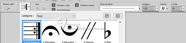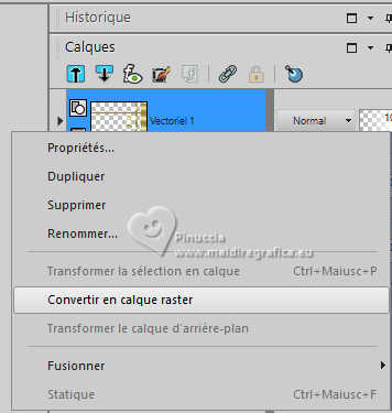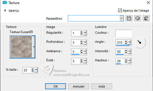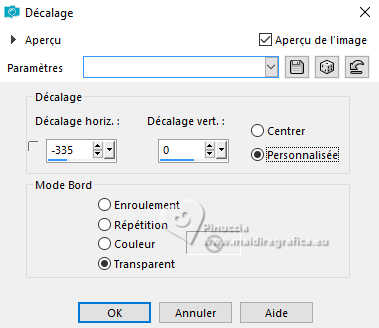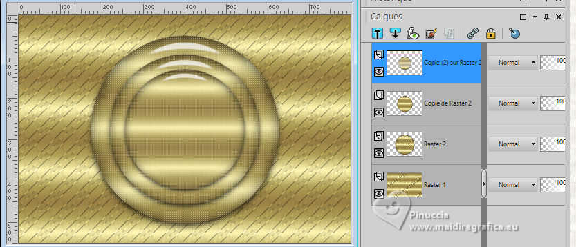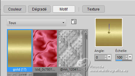 Pour traduire ce tutoriel j'ai utilisé PSPX9, mais il peut également être exécuté avec les autres versions. Suivant la version utilisée, vous pouvez obtenir des résultats différents. Depuis la version X4, la fonction Image>Miroir a été remplacée par Image>Renverser horizontalement, et Image>Renverser avec Image>Renverser verticalement. Dans les versions X5 et X6, les fonctions ont été améliorées par la mise à disposition du menu Objets. Dans la nouvelle version X7, nous avons à nouveau Miroir/Renverser, mais avec autres différences. Voir plus les détails à ce sujet ici Certaines dénominations ont changées entre les versions de PSP. Les plus frequentes dénominations utilisées: ![]() Traduction en italien ici Vos versions iciNécessaire pour réaliser ce tutoriel: ![]() (les liens des sites des tubeuses ici) Modules Externes in caso di dubbi, ricorda di consultare la mia sezione filtri qui Alien Skin Eye Candy 5 Impact - Glass ici AP 01 [Innovations] - Lines SilverLining ici ![]() Si vous voulez utiliser vos propres couleurs, n'hésitez pas à changer le mode et l'opacité des calques Dans les plus récentes versions de PSP, vous ne trouvez pas le dégradé d'avant plan/arrière plan ou Corel_06_029. Vous pouvez utiliser le dégradés des versions antérieures. Ici le dossier Dégradés de CorelX. ![]() Placer la texture Textuur-Susan09 dans le dossier Textures. Placer la sélection dans le dossier Sélections. Placer les formes Start_ repeat.PspShape dans le dossier Formes Predefinies. Ouvrir le motif or Gold(17) dans PSP et le minimiser avec le reste du matériel. Placer en avant plan la couleur #c0c0c0 et en arrière plan la couleur #000000. ![]() Préparer en avant plan un dégradé de premier plan/arrière plan, style Linéaire. ![]() Préparer la couleur d'arrière plan avec le motif or Gold(17) ![]() Ce tutoriel, comme les premiers tutoriels créés par Mieke entre 2017 et 2020, a été réécrit et adapté aux nouvelles versions de PSP. Dans cette version, les couleurs et les dégradés ne seront pas utilisés. Seul le motif doré sera utilisé. 1. Ouvrir une nouvelle image transparente 800 x 550 pixels. ![]() Remplir l'image transparente avec le motif or.2. Effets>Effets de textures>Texture - sélectionner la texture Textuur-Susan09 ![]() 3. Calques>Nouveau calque raster. Sélections>Charger/Enregistrer une sélection>Charger à partir du disque. Chercher et charger la sélection MB-17-1.PspSelection ![]() Remplir la sélection avec le motif or.4. Effets>Modules Externes>Alien Skin Eye Candy 5 Impact - Glass. Sélectionner le preset Clear et ok. ![]() Sélections>Désélectionner tout. 5. Effets>Modules Externes>AP 01 [Innovations] - Lines SilverLining. ![]() 6. Calques>Dupliquer. Image>Redimensionneer, à 80%, redimensionner tous les calques décoché. Répéter Calques>Dupliquer. Image>Redimensionneer, à 80%, redimensionner tous les calques décoché. Encore une fois Calques>Dupliquer. Image>Redimensionneer, à 80%, redimensionner tous les calques décoché. Et vous avez 3 calques ![]() Calques>Fusionner>Fusionner le calque de dessous - 2 fois. 7. Effets>Effets 3D>Ombre portée, couleur noire. ![]() 8. Activer l'outil Forme predefinie ![]() Ouvrir le menu des formes et sélectionner la forme X EndRepeat avec ces réglages: Anticrénelage et Création vector cochés - style de ligne Plein - largeur 1 ![]() Avec le motif or, tracer la forme sur toute la toile, du coin supérieur gauche au coin inférieur droit. ![]() Touche droite de la souris sur le calque Vectoriel et sélectionner Convertir en calque Raster. ![]() Effets>Effets de bords>Accentuer davantage. 9. Calques>Dupliquer. Image>Miroir>Miroir horizontal (Image>Miroir). Calques>Fusionner>Fusionner le calque de dessous. Effets>Effets 3D>Ombre portée, comme précédemment. ![]() 10. Ouvrir deco-17-1 ![]() Édition>Copier. Revenir sur votre travail et Édition>Coller comme nouveau calque. Sélections>Sélectionner tout. Sélections>Flottante Sélections>Statique. Remplir avec le motif or.Sélections>Désélectionner tout. 11. Objets>Aligner>Gauche. Effets>Effets de bords>Accentuer. 12. Ouvrir deco-17-2 ![]() Édition>Copier. Revenir sur votre travail et Édition>Coller comme nouveau calque. 13. Effets>Effets d'image>Décalage ![]() 14. Calques>Fusionner>Fusionner le calque de dessous. Effets>Effets 3D>Ombre portée, comme précédemment. ![]() 15. Calques>Dupliquer. Image>Miroir>Miroir horizontal (Image>Miroir). 16. Ouvrir le tube pinterest-1de8 ![]() Édition>Copier. Revenir sur votre travail et Édition>Coller comme nouveau calque. Positionner le tube à votre goût.17. Image>Ajouter des bordures, 1 pixels, symétrique, couleur noire. Sélections>Sélectionner tout. Image>Ajouter des bordures, 35 pixels, symétrique, couleur claire. 18. Sélections>Inverser. Calques>Nouveau calque raster. Remplir le calque avec le motif or.Réduire l'opacité de ce calque à 40%. 19. Sélections>Inverser. Effets>Effets 3D>Ombre portée, comme précédemment. ![]() Sélections>Désélectionner tout. 20. Signer votre travail sur un nouveau calque. Calques>Fusionner>Tous et enregistrer en jpg. Image de Pinterest ![]() ![]() Si vous avez des problèmes, ou des doutes, ou vous trouvez un link modifié, ou seulement pour me dire que ce tutoriel vous a plu, vous pouvez m'écrire. |