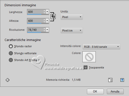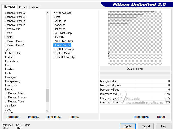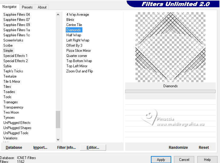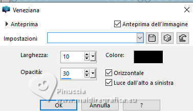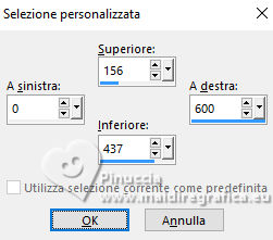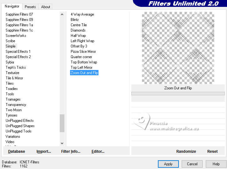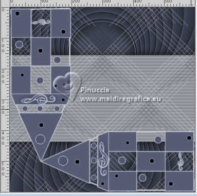 qui puoi trovare qualche risposta ai tuoi dubbi. Se l'argomento che ti interessa non è presente, ti prego di segnalarmelo. Per tradurre il tutorial ho usato PSPX9, ma può essere eseguito con ogni versione di PSP. Dalla versione X4, il comando Immagine>Rifletti è stato sostituito con Immagine>Capovolgi in orizzontale, e il comando Immagine>Capovolgi con Immagine>Capovolgi in verticale. Nelle versioni X5 e X6, le funzioni sono state migliorate rendendo disponibile il menu Oggetti. Con la nuova versione X7, sono tornati Rifletti/Capovolgi, ma con nuove differenze Vedi la scheda sull'argomento qui traduzione in francese qui Le vostre versioni quiOccorrente: ![]() (in questa pagina trovi i links ai siti dei creatori di tubes) Filtri: in caso di dubbi, ricorda di consultare la mia sezione filtri qui Filters Unlimited 2.0 qui Simple - Quarter Corner, Diamonds, Zoom out and flip qui Flaming Pear - Flexify 2 qui I filtri Simple si possono usare da soli o importati in Filters Unlimited (come fare vedi qui) Se un filtro fornito appare con questa icona ![]() se stai usando altri colori, sperimenta le modalità di miscelatura e opacità più adatte ai tuoi colori ![]() 1. Imposta il colore di primo piano con #414656, e il colore di sfondo con #a3a6af. ![]() 2. Apri una nuova immagine trasparente 600 x 600 pixels. ![]() Riempi l'immagine trasparente con il colore scuro del tube #414656.3. Apri deco-1 ![]() Modifica>Copia. Torna al tuo lavoro e vai a Modifica>Incolla come nuovo livello. 4. Livelli>Duplica. Immagine>Rifletti>Rifletti verticalmente (Immagine>Capovolgi) Immagine>Rifletti>Rifletti orizzontalmente (Immagine>Rifletti) Livelli>Unisci>Unisci giù. 5. Effetti>Plugins>Filters Unlimited 2.0 - Simple - Quarter corner. ![]() Effetti>Plugins>Filters Unlimited 2.0 - Simple - Diamonds. ![]() Effetti>Plugins>Filters Unlimited 2.0 - Simple - Zoom out and flip. ![]() Abbassa l'opacità di questo livello al 36%. 6. Attiva il livello Raster 1. Attiva lo strumento Selezione ![]() (non importa il tipo di selezione impostato, perchè con la selezione personalizzata si ottiene sempre un rettangolo) clicca sull'icona Selezione personalizzata ![]() e imposta i seguenti settaggi. ![]() Selezione>Innalza selezione a livello. 7. Effetti>Effetti di trama>Veneziana - colore nero. ![]() 8. Effetti>Effetti 3D>Sfalsa ombra, colore nero. ![]() Selezione>Deseleziona. 9. Effetti>Plugins>Flaming Pear - Flexify 2. ![]() Effetti>Effetti di bordo>Aumenta di più. 10. Livelli>Nuovo livello raster. Selezione personalizzata , con i settaggi precedenti![]() Riempi la selezione con il colore chiaro di sfondo #a3a6af.11. Effetti>Effetti di trama>Veneziana, con i settaggi precedenti. ![]() Selezione>Deseleziona. 12. Effetti>Effetti 3D>Sfalsa ombra, con i settaggi precedenti. ![]() 13. Apri deco-pij13 ![]() Modifica>Copia. Torna al tuo lavoro e vai a Modifica>Incolla come nuovo livello. Livelli>Disponi>Porta in alto. Sposta il tube nell'angolo in basso a destra.Livelli>Duplica. Immagine>Ruota per gradi - 90 gradi a sinistra ![]() Sposta questo tube nell'angolo in alto a sinistra(una punta contro l'altra) ![]() 14. Apri il tube printerest-28 ![]() Modifica>Copia. Torna al tuo lavoro e vai a Modifica>Incolla come nuovo livello. Posiziona correttamente il tube.15. Effetti>Effetti 3D>Sfalsa ombra, colore nero. ![]() 16. Immagine>Aggiungi bordatura, 2 pixels, simmetriche, colore chiaro. Selezione>Seleziona tutto. Immagine>Aggiungi bordatura, 40 pixels, simmetriche, colore scuro. Effetti>Effetti 3D>Sfalsa ombra, colore nero. ![]() 17. Selezione>Inverti. Effetti>Effetti di trama>Veneziana, con i settaggi precedenti. ![]() Selezione>Deseleziona. Immagine>Aggiungi bordatura, 2 pixels, simmetriche, colore scuro. 18. Firma il tuo lavoro su un nuovo livello. Livelli>Unisci>Unisci tutto e salva in formato jpg. Per i tubes di questi esempi grazie Riet ![]() Wieske ![]() ![]() Se hai problemi o dubbi, o trovi un link non funzionante, o anche soltanto per un saluto, scrivimi. |