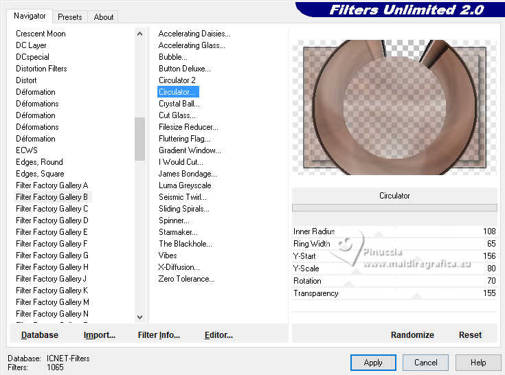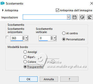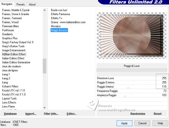 qui puoi trovare qualche risposta ai tuoi dubbi. Se l'argomento che ti interessa non è presente, ti prego di segnalarmelo. Per tradurre il tutorial ho usato PSPX9, ma può essere eseguito con ogni versione di PSP. Dalla versione X4, il comando Immagine>Rifletti è stato sostituito con Immagine>Capovolgi in orizzontale, e il comando Immagine>Capovolgi con Immagine>Capovolgi in verticale. Nelle versioni X5 e X6, le funzioni sono state migliorate rendendo disponibile il menu Oggetti. Con la nuova versione X7, sono tornati Rifletti/Capovolgi, ma con nuove differenze Vedi la scheda sull'argomento qui traduzione in francese qui Le vostre versioni quiOccorrente: ![]() (in questa pagina trovi i links ai siti dei creatori di tubes) ![]() in caso di dubbi, ricorda di consultare la mia sezione filtri qui Filters Unlimited 2.0 qui Italian Editors Effect - Raggi di luce qui Filter Factory Gallery B - Circulator qui I filtri Italian Editors e Factory Gallery si possono usare da soli o importati in Filters Unlimited (come fare vedi qui) Se un filtro fornito appare con questa icona ![]() se stai usando altri colori, sperimenta le modalità di miscelatura e opacità più adatte ai tuoi colori ![]() 1. Imposta il colore di primo piano con #eeded1, e il colore di sfondo con #967a65. ![]() 2. Apri achtergrond.jpg ![]() Questa immagine sarà la base del tuo lavoro. 3. Livelli>Duplica. Immagine>Ridimensiona, al 90%, tutti i livelli non selezionato. ![]() 4. Livelli>Duplica. Chiudi questo livello e attiva il livello sottostante dell'originale. ![]() 5. Effetti>Plugins>Filters Unlimited 2.0 - Italian Editors Effect - Raggi di luce. ![]() 6. Riapri e attiva il livello superiore. Effetti>Plugins>Filters Unlimited 2.0 - Filter Factory Gallery B - Circulator, con i settaggi standard. ![]() 7. Immagine>Ridimensiona, al 90%, tutti i livelli non selezionato. ![]() Di nuovo Immagine>Ridimensiona, all'86%, tutti i livelli non selezionato. ![]() 8. Apri deco-1-282.png ![]() Modifica>Copia. Torna al tuo lavoro e vai a Modifica>Incolla come nuovo livello. Lascialo come sta. 9. Apri deco-2-282.png ![]() Modifica>Copia. Torna al tuo lavoro e vai a Modifica>Incolla come nuovo livello. 10. Effetti>Effetti di immagine>Scostamento. ![]() 11. Aprire il tube principale kind-20 ![]() Modifica>Copia. Torna al tuo lavoro e vai a Modifica>Incolla come nuovo livello. Personalizza il tube a tuo piacimento. Spostalo a sinistra o dove preferisci.12. Firma il tuo lavoro e salva in formato jpg. Per i tubes di questi esempi grazie Brunette ![]() Taylor ![]() ![]() Se hai problemi o dubbi, o trovi un link non funzionante, o anche soltanto per un saluto, scrivimi. |
