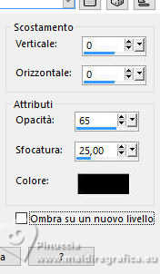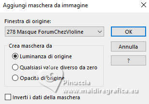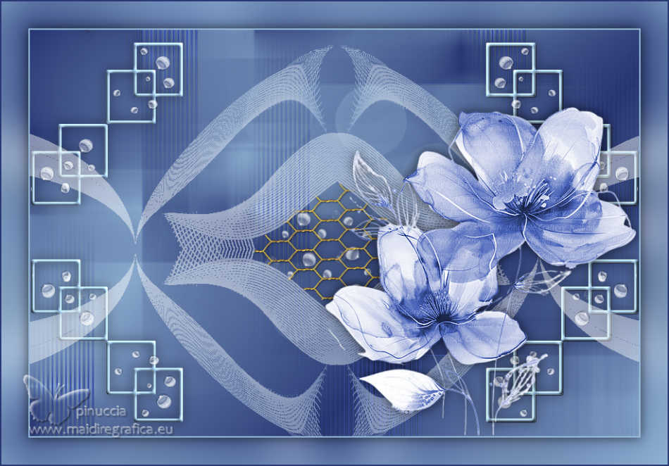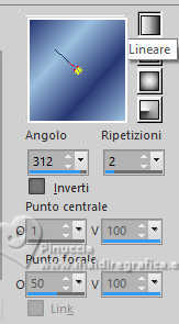 qui puoi trovare qualche risposta ai tuoi dubbi. Se l'argomento che ti interessa non è presente, ti prego di segnalarmelo. Per tradurre il tutorial ho usato PSPX9, ma può essere eseguito con ogni versione di PSP. Dalla versione X4, il comando Immagine>Rifletti è stato sostituito con Immagine>Capovolgi in orizzontale, e il comando Immagine>Capovolgi con Immagine>Capovolgi in verticale. Nelle versioni X5 e X6, le funzioni sono state migliorate rendendo disponibile il menu Oggetti. Con la nuova versione X7, sono tornati Rifletti/Capovolgi, ma con nuove differenze Vedi la scheda sull'argomento qui traduzione in francese qui Le vostre versioni quiOccorrente: ![]() (in questa pagina trovi i links ai siti dei creatori di tubes) ![]() se stai usando altri colori, sperimenta le modalità di miscelatura e opacità più adatte ai tuoi colori Nelle ultime versioni di PSP non c'è il gradiente di primo piano/sfondo (Corel_06_029) Puoi usare i gradienti delle versioni precedenti. Trovi qui i gradienti Corel X. ![]() Apri la maschera in PSP e minimizzala con il resto del materiale. 1. Imposta il colore di primo piano con #9cc0df, e il colore di sfondo con #283773. ![]() Passa il colore di primo piano a Gradiente di primo piano/sfondo, stile Lineare. ![]() 2. Apri una nuova immagine trasparente 900 x 600 pixels. ![]() Riempi l'immagine trasparente con il gradiente.3. Livelli>Nuovo livello raster. Riempi il livello con il colore scuro di sfondo.Livelli>Nuovo livello maschera>Da immagine. Apri il menu sotto la finestra di origine e vedrai la lista dei files aperti. Seleziona la maschera 278 Masque ForumChezVIoline.jpg ![]() Livelli>Unisci>Unisci gruppo. Effetti>Effetti di bordo>Aumenta. 4. Apri Deco-1-286.png ![]() Modifica>Copia. Torna al tuo lavoro e vai a Modifica>Incolla come nuovo livello. Oggetti>Allinea>Destra. 6. Passa il colore di primo piano a Colore. Attiva lo strumento Bacchetta magica ![]() ![]() e clicca sui bordi della cornice per selezionarli. ![]() 7. Livelli>Nuovo livello raster. Riempi con il colore chiaro di primo piano.Effetti>Effetti 3D>Smusso a incasso. ![]() Selezione>Deseleziona. 8. Effetti>Effetti 3D>Sfalsa ombra, colore nero. ![]() 9. Livelli>Duplica. Immagine>Rifletti>Rifletti orizzontalmente (Immagine>Rifletti). Livelli>Unisci>Unisci giù. 10. Apri deco-2-286.png ![]() Modifica>Copia. Non spostarlo. Cambia la modalità di miscelatura di questo livello in Filtra, e abbassa l'opacità al 75%. 11. Apri deco-3-286.png ![]() Modifica>Copia. Torna al tuo lavoro e vai a Modifica>Incolla come nuovo livello. Non spostarlo. 12. Apri deco-4-286.png ![]() Modifica>Copia. Torna al tuo lavoro e vai a Modifica>Incolla come nuovo livello. Sposta il tube a sinistra sulle piccole cornici.![]() 13. Livelli>Duplica. Immagine>Rifletti>Rifletti orizzontalmente (Immagine>Rifletti). 14. Apri pinterest-bloem456.png ![]() Modifica>Copia. Torna al tuo lavoro e vai a Modifica>Incolla come nuovo livello. Sposta il tube in basso a destra.![]() 15. Effetti>Effetti 3D>Sfalsa ombra, con i settaggi precedenti. ![]() Regola>Messa a fuoco>Metti a fuoco. 16. Immagine>Aggiungi bordatura, 2 pixels, simmetriche, colore chiaro di primo piano. Selezione>Seleziona tutto. Modifica>Copia Immagine>Aggiungi bordatura, 40 pixels, simmetriche, colore chiaro di primo piano. Selezione>Inverti. Modifica>Incolla nella selezione. Regola>Sfocatura>Sfocatura gaussiana - raggio 30 ![]() 17. Selezione>Inverti. Effetti>Effetti 3D>Sfalsa ombra, con i settaggi precedenti. ![]() Selezione>Deseleziona. Immagine>Aggiungi bordatura, 2 pixels, simmetriche, colore scuro di sfondo. 18. Firma il tuo lavoro su un nuovo livello. Livelli>Unisci>Unisci tutto e salva in formato jpg. ![]() ![]() Se hai problemi o dubbi, o trovi un link non funzionante, o anche soltanto per un saluto, scrivimi. |