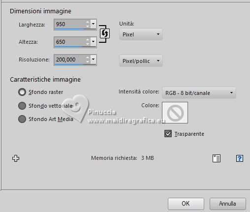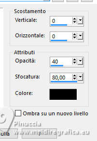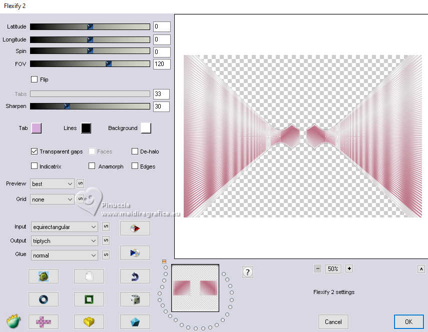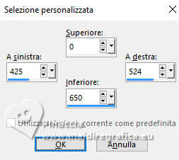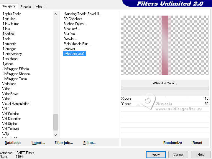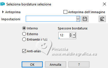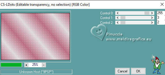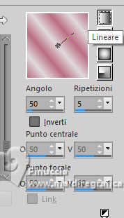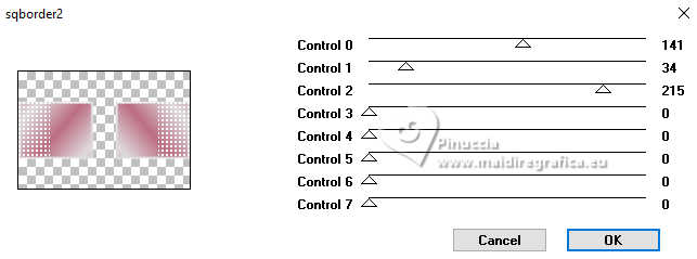 qui puoi trovare qualche risposta ai tuoi dubbi. Se l'argomento che ti interessa non è presente, ti prego di segnalarmelo. Per tradurre il tutorial ho usato PSPX9, ma può essere eseguito con ogni versione di PSP. Dalla versione X4, il comando Immagine>Rifletti è stato sostituito con Immagine>Capovolgi in orizzontale, e il comando Immagine>Capovolgi con Immagine>Capovolgi in verticale. Nelle versioni X5 e X6, le funzioni sono state migliorate rendendo disponibile il menu Oggetti. Con la nuova versione X7, sono tornati Rifletti/Capovolgi, ma con nuove differenze Vedi la scheda sull'argomento qui traduzione in francese qui Le vostre versioni quiOccorrente: ![]() (in questa pagina trovi i links ai siti dei creatori di tubes) Filtri: in caso di dubbi, ricorda di consultare la mia sezione filtri qui Filters Unlimited 2.0 qui [AFS IMPORT] - sqborder2 qui Simple - Top Bottom Wrap, Left Right Wrap (bonus) qui Simple - Half Wrap qui Carolaine and Sensibility - CS-LDots qui Flaming Pear - Flexify 2 qui Toadies - What are you qui I filtri AFS IMPORT, Simple e Toadies si possono usare da soli o importati in Filters Unlimited (come fare vedi qui) Se un filtro fornito appare con questa icona ![]() se stai usando altri colori, sperimenta le modalità di miscelatura e opacità più adatte ai tuoi colori Nelle ultime versioni di PSP non c'è il gradiente di primo piano/sfondo (Corel_06_029) Puoi usare i gradienti delle versioni precedenti. Trovi qui i gradienti Corel X. ![]() 1. Imposta il colore di primo piano con #bb6d83, e il colore di sfondo con #dedadb (o bianco). ![]() Passa il colore di primo piano a Gradiente di primo piano/sfondo, stile Lineare. ![]() 2. Apri una nuova immagine trasparente 950 x 650 pixels. ![]() Riempi l'immagine trasparente con il gradiente.3. Attiva lo strumento Selezione ![]() (non importa il tipo di selezione impostato, perchè con la selezione personalizzata si ottiene sempre un rettangolo) clicca sull'icona Selezione personalizzata ![]() e imposta i seguenti settaggi. ![]() Selezione>Innalza selezione a livello. 4. Selezione>Modifica>Seleziona bordature selezione. ![]() 5. Corrispondenza dello strumento Riempimento su Nessuno ![]() Riempi la selezione con il colore chiaro.Selezione>Deseleziona. 6. Livelli>Duplica. Immagine>Rifletti>Rifletti orizzontalmente. Livelli>Unisci>Unisci giù. 7. Effetti>Plugins>[AFS IMPORT] - sqborder2, con i settaggi standard. ![]() 8. Livelli>Duplica. Effetti>Plugins>Flaming Pear - Flexify 2. ![]() 9. Livelli>Duplica. Effetti>Plugins>Filters Unlimited 2.0 - Simple - Top Bottom Wrap. ![]() 10. Attiva il livello Selezione innalzata. Effetti>Plugins>Filters Unlimited 2.0 - Simple - Left Right Wrap ![]() 11. Livelli>Duplica. Effetti>Plugins>Filters Unlimited 2.0 - Simple - Half Wrap ![]() 12. Effetti>Effetti geometrici>Cerchio. ![]() 13. Attiva il livello Raster 1. Effetti>Plugins>Carolaine and Sensibility - CS-LDots ![]() 14. Sui 4 livelli superiori applica: Effetti>Effetti 3D>Sfalsa ombra, colore nero. ![]() 15. Attiva nuovamente il livello Raster 1. Selezione personalizzata ![]() ![]() Selezione>Innalza selezione a livello. Selezione>Deseleziona. 16. Effetti>Plugins>Filters unlimited 2.0 - Toadies - What are you ![]() 17. Livelli>Disponi>Porta in alto. Livelli>Disponi>Sposta giù. Regola>Messa a fuoco>Accentua messa a fuoco. 18. Apri il tube AI-1723-removebg ![]() Modifica>Copia. Torna al tuo lavoro e vai a Modifica>Incolla come nuovo livello. Livelli>Disponi>Porta in alto. 19. Effetti>Effetti 3D>Sfalsa ombra, colore nero. ![]() 20. Apri il tube A1-1723-b. ![]() Modifica>Copia. Torna al tuo lavoro e vai a Modifica>Incolla come nuovo livello. Sposta il tube a sinistra.![]() 21. Effetti>Effetti 3D>Sfalsa ombra, colore nero. ![]() 22. Livelli>Duplica. Immagine>Rifletti>Rifletti orizzontalmente. Livelli>Unisci>Unisci giù. 23. Immagine>Aggiungi bordatura, 2 pixels, simmetriche, colore scuro. Selezione>Seleziona tutto. Modifica>Copia. Immagine>Aggiungi bordatura, 40 pixels, simmetriche, colore chiaro. Selezione>Inverti. Modifica>Incolla nella selezione 24. Regola>Sfocatura>Sfocatura gaussiana - raggio 30. ![]() Selezione>Inverti. Effetti>Effetti 3D>Sfalsa ombra, colore nero. ![]() Selezione>Deseleziona. 25. Immagine>Aggiungi bordatura, 2 pixels, simmetriche, colore scuro. 26. Firma il tuo lavoro e salva in formato jpg. Per i tubes di questi esempi grazie Silvie ![]() Wieskes ![]() ![]() Se hai problemi o dubbi, o trovi un link non funzionante, o anche soltanto per un saluto, scrivimi. |