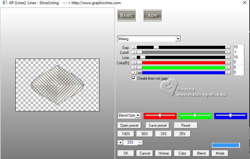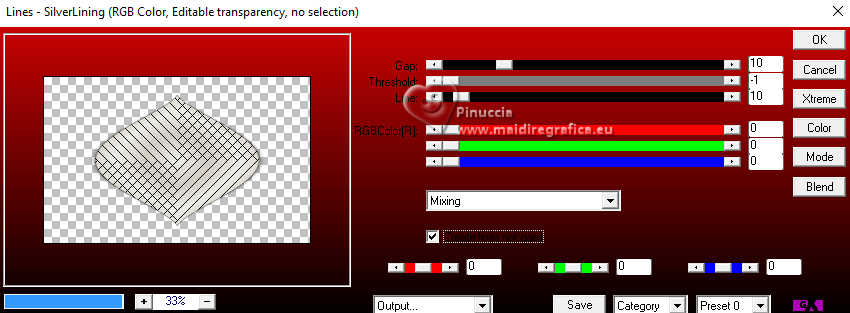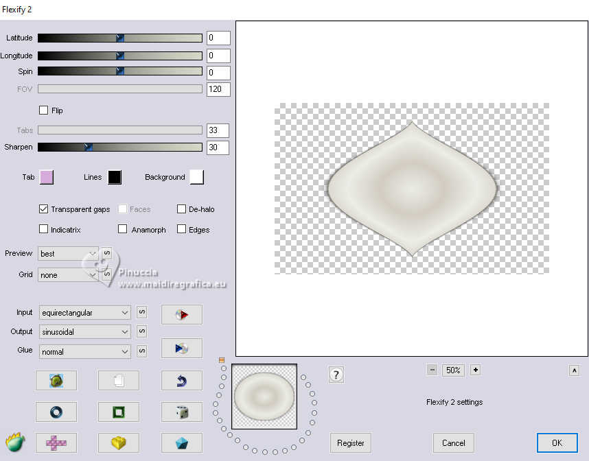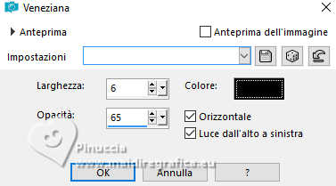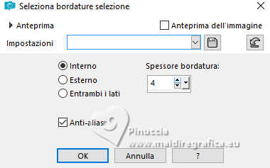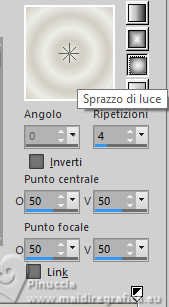 qui puoi trovare qualche risposta ai tuoi dubbi. Se l'argomento che ti interessa non è presente, ti prego di segnalarmelo. Per tradurre il tutorial ho usato PSPX9, ma può essere eseguito con ogni versione di PSP. Dalla versione X4, il comando Immagine>Rifletti è stato sostituito con Immagine>Capovolgi in orizzontale, e il comando Immagine>Capovolgi con Immagine>Capovolgi in verticale. Nelle versioni X5 e X6, le funzioni sono state migliorate rendendo disponibile il menu Oggetti. Con la nuova versione X7, sono tornati Rifletti/Capovolgi, ma con nuove differenze Vedi la scheda sull'argomento qui traduzione in francese qui Le vostre versioni quiOccorrente: ![]() (in questa pagina trovi i links ai siti dei creatori di tubes) Filtri: in caso di dubbi, ricorda di consultare la mia sezione filtri qui Ap 01 [Innovations] - Lines SilverLining qui Flaming Pear - Flexify 2 qui ![]() se stai usando altri colori, sperimenta le modalità di miscelatura e opacità più adatte ai tuoi colori Nelle ultime versioni di PSP non c'è il gradiente di primo piano/sfondo (Corel_06_029) Puoi usare i gradienti delle versioni precedenti. Trovi qui i gradienti Corel X. ![]() 1. Imposta il colore di primo piano con #eceee7, e il colore di sfondo con #d3cdc3. ![]() Passa il colore di primo piano a Gradiente di primo piano/sfondo, stile Sprazzo di luce. ![]() 2. Apri una nuova immagine trasparente 800 x 500 pixels. ![]() Riempi l'immagine trasparente con il gradiente.3. Effetti>Effetti di bordo>Aumenta di più. Modifica>Ripeti Aumenta di più i bordi. 4. Attiva lo strumento Selezione , Cerchio![]() Disegna un cerchio partendo dal piccolo cerchio al centro della tela, mantenendo una distanza molto ridotta dai bordi superiore e inferiore. ![]() Selezione>Innalza selezione a livello. 5. Selezione>Modifica>Seleziona bordature selezione. ![]() 6. Modalità di corrispondenza dello strumento Riempimento su Nessuno ![]() Riempi la selezione con il colore di sfondo.7. Effetti>Effetti di trama>Veneziana, colore nero. ![]() Selezione>Deseleziona. 8. Effetti>Effetti 3D>Sfalsa ombra, colore nero. ![]() 9. Livelli>Duplica. Effetti>Plugins>Flaming Pear - Flexify 2. ![]() 10. Effetti>Plugins>AP01 [Innovations] - Lines SilverLining. ![]() se vuoi usare la versione AP [Lines], il risultato non cambia ![]() 11. Effetti>Effetti 3D>Sfalsa ombra, colore nero. ![]() 12. Apri Deco-1 ![]() Modifica>Copia. Torna al tuo lavoro e vai a Modifica>Incolla come nuovo livello. Livelli>Disponi>Sposta giù. 13. Apri Deco-2 ![]() Modifica>Copia. Torna al tuo lavoro e vai a Modifica>Incolla come nuovo livello. 14. Apri Deco-3 ![]() Modifica>Copia. Torna al tuo lavoro e vai a Modifica>Incolla come nuovo livello. Livelli>Disponi>Porta in alto. 15. Effetti>Effetti di immagine>Scostamento. ![]() Livelli>Duplica. Immagine>Rifletti>Rifletti orizzontalmente. Livelli>Unisci>Unisci giù. 16. Apri Deco-4 ![]() Modifica>Copia. Torna al tuo lavoro e vai a Modifica>Incolla come nuovo livello. Abbassa l'opacità di questo livello al 50%. 17. Apri Deco-5 ![]() Modifica>Copia. Torna al tuo lavoro e vai a Modifica>Incolla come nuovo livello. 18. Immagine>Aggiungi bordatura, 2 pixels, simmetriche, colore scuro. Selezione>Seleziona tutto. Modifica>Copia 19. Immagine>Aggiungi bordatura, 50 pixels, simmetriche, colore #ffffff. Selezione>Inverti. Livelli>Nuovo livello rastesr. Modifica>Incolla nella selezione Abbassa l'opacità di questo livello al 50%. 20. Regola>Sfocatura>Sfocatura radiale. ![]() Selezione>Inverti. Effetti>Effetti 3D>Sfalsa ombra, colore nero. ![]() 21. Immagine>Aggiungi bordatura, 2 pixels, simmetriche, colore scuro. Selezione>Deseleziona. 22. Apri il tube Renee-TUBES-Octobre-2025-17.pspimage ![]() Modifica>Copia. Torna al tuo lavoro e vai a Modifica>Incolla come nuovo livello. Immagine>Ridimensiona, al 70%, tutti i livelli non selezionato. Sposta il tube a destra.Effetti>Effetti 3D>Sfalsa ombra, a scelta. 23. Apri il tube AI-bloem-9056 ![]() Modifica>Copia. Torna al tuo lavoro e vai a Modifica>Incolla come nuovo livello. Spostalo in basso a sinistra, o come preferisci.Effetti>Effetti 3D>Sfalsa ombra, a scelta. 24. Firma il tuo lavoro su un nuovo livello. Immagine>Aggiungi bordatura, 1 pixel, simmetriche, colore di sfondo. Salva in formato jpg. Per i tubes di questi esempi grazie ElFairy ![]() ![]() ![]() Se hai problemi o dubbi, o trovi un link non funzionante, o anche soltanto per un saluto, scrivimi. |