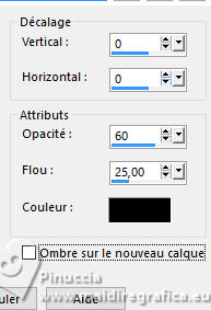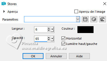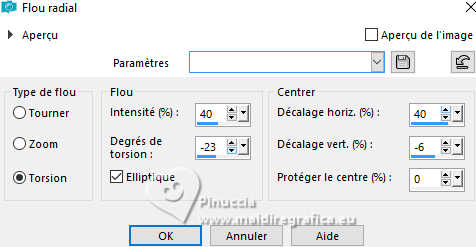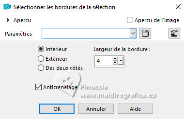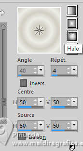 Pour traduire ce tutoriel j'ai utilisé PSPX9, mais il peut également être exécuté avec les autres versions. Suivant la version utilisée, vous pouvez obtenir des résultats différents. Depuis la version X4, la fonction Image>Miroir a été remplacée par Image>Renverser horizontalement, et Image>Renverser avec Image>Renverser verticalement. Dans les versions X5 et X6, les fonctions ont été améliorées par la mise à disposition du menu Objets. Dans la nouvelle version X7, nous avons à nouveau Miroir/Renverser, mais avec autres différences. Voir plus les détails à ce sujet ici Certaines dénominations ont changées entre les versions de PSP. Les plus frequentes dénominations utilisées: ![]() Traduction en italien ici Vos versions iciNécessaire pour réaliser ce tutoriel: ![]() Pour le tube merci Renée (les liens des sites des tubeuses ici) Modules Externes consulter, si nécessaire, ma section de filtre ici AP 01 [Innovations] - Lines SilverLining ici Flaming Pear - Flexify 2 ici ![]() Si vous voulez utiliser vos propres couleurs, n'hésitez pas à changer le mode et l'opacité des calques Dans les plus récentes versions de PSP, vous ne trouvez pas le dégradé d'avant plan/arrière plan ou Corel_06_029. Vous pouvez utiliser le dégradés des versions antérieures. Ici le dossier Dégradés de CorelX. ![]() 1. Placer en avant plan la couleur #eceea7, et en arrière plan la couleur #d3cdc3. ![]() Préparer en avant plan un dégradé de premier plan/arrière plan, style Halo. ![]() 2. Ouvrir une nouvelle image transparente 800 x 500 pixels. ![]() Remplir l'image transparente du dégradé.3. Effets>Effets de bords>Accentuer davantage. Édition>Répéter Accentuer davantage. 4. Activer l'outil Sélection , Cerchio![]() Tracez un cercle à partir du petit cercle au centre de votre travail, en restant à très faible distance des bords supérieur et inférieur. ![]() Sélections>Transformer la sélection en calque. 5. Sélections>Modifier>Sélectionner les bordures de la sélection. ![]() 6. Mode de l'outil Pot de peinture sur Aucun ![]() Remplir la sélection avec la couleur d'arrière plan.7. Effets>Effets de textures>Stores, couleur noire. ![]() Sélections>Désélectionner tout. 8. Effets>Effets 3D>Ombre portée, couleur noire. ![]() 9. Calques>Dupliquer. Effets>Modules Externes>Flaming Pear - Flexify 2. ![]() 10. Effets>Modules Externes>AP01 [Innovations] - Lines SilverLining. ![]() Si vous utilisez la version [Lines], le résultat ne change pas ![]() 11. Effets>Effets 3D>Ombre portée, couleur noire. ![]() 12. Ouvrir Deco-1 ![]() Édition>Copier. Revenir sur votre travail et Édition>Coller comme nouveau calque. Calques>Agencer>Déplacer vers le bas. 13. Ouvrir Deco-2 ![]() Édition>Copier. Revenir sur votre travail et Édition>Coller comme nouveau calque. 14. Ouvrir Deco-3 ![]() Édition>Copier. Revenir sur votre travail et Édition>Coller comme nouveau calque. Calques>Agencer>Placer en haut de la pile. 15. Effets>Effets d'image>Décalage. ![]() Calques>Dupliquer. Image>Miroir>Miroir horizontal. Calques>Fusionner>Fusionner le calque de dessous. 16. Ouvrir Deco-4 ![]() Édition>Copier. Revenir sur votre travail et Édition>Coller comme nouveau calque. Réduire l'opacité de ce calque à 50%. 17. Ouvrir Deco-5 ![]() Édition>Copier. Revenir sur votre travail et Édition>Coller comme nouveau calque. 18. Image>Ajouter des bordures, 2 pixels, symétrique, couleur foncée. Sélections>Sélectionner tout. Édition>Copier 19. Image>Ajouter des bordures, 50 pixels, symétrique, couleur #ffffff. Sélections>Inverser. Calques>Nouveau calque raster. Édition>Coller dans la sélection Réduire l'opacité de ce calque à 50%. 20. Réglage>Flou>Flou radial ![]() Sélections>Inverser. Effets>Effets 3D>Ombre portée, couleur noire. ![]() 21. Image>Ajouter des bordures, 2 pixels, symétrique, couleur foncée. Sélections>Désélectionner tout. 22. Ouvrir le tube Renee-TUBES-Octobre-2025-17.pspimage ![]() Édition>Copier. Revenir sur votre travail et Édition>Coller comme nouveau calque. Image>Redimensionner, à 70%, redimensionner tous les calques décoché. Déplacer le tube à droite.Effets>Effets 3D>Ombre portée, à choix. 23. Ouvrir le tube AI-bloem-9056 ![]() Édition>Copier. Revenir sur votre travail et Édition>Coller comme nouveau calque. Déplacer le tube en bas à gauche, ou à votre goût.Effets>Effets 3D>Ombre portée, à choix. 24. Signer votre travail sur un nouveau calque. Image>Ajouter des bordures, 1 pixel, symétrique, couleur d'arrière plan. Enregistrer en jpg. Pour les tubes de ces versions merci ElFairy ![]() ![]() ![]() Si vous avez des problèmes, ou des doutes, ou vous trouvez un link modifié, ou seulement pour me dire que ce tutoriel vous a plu, vous pouvez m'écrire. |