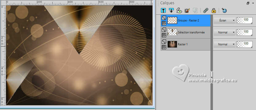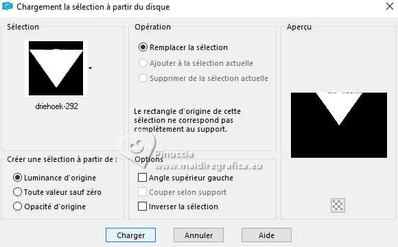 Pour traduire ce tutoriel j'ai utilisé PSPX9, mais il peut également être exécuté avec les autres versions. Suivant la version utilisée, vous pouvez obtenir des résultats différents. Depuis la version X4, la fonction Image>Miroir a été remplacée par Image>Renverser horizontalement, et Image>Renverser avec Image>Renverser verticalement. Dans les versions X5 et X6, les fonctions ont été améliorées par la mise à disposition du menu Objets. Dans la nouvelle version X7, nous avons à nouveau Miroir/Renverser, mais avec autres différences. Voir plus les détails à ce sujet ici Certaines dénominations ont changées entre les versions de PSP. Les plus frequentes dénominations utilisées: ![]() Traduction en italien ici Vos versions iciNécessaire pour réaliser ce tutoriel: ![]() (les liens des sites des tubeuses ici) Modules Externes Aucun ![]() ![]() Si vous voulez utiliser vos propres couleurs, n'hésitez pas à changer le mode et l'opacité des calques ![]() Placer la sélection dans le dossier Sélections. Ouvrir le masque dans PSP et le minimiser avec le reste du matériel. Placer en avant plan la couleur #d6cec0 et en arrière plan la couleur #bc8d53. ![]() 1. Ouvrir une nouvelle image transparente 950 x 650 pixels. ![]() 2. Sélections>Sélectionner tout. 3. Ouvrir achtergrond-292.jpg ![]() Édition>Copier. Revenir sur votre travail et Édition>Coller dans la sélection. Sélections>Désélectionner tout. 4. Sélections>Charger/Enregistrer une sélection>Charger à partir du disque. Chercher et charger la sélection driehoek-292 ![]() Sélections>Transformer la sélection en calque. Sélections>Désélectionner tout. 5. Effets>Effets d'image>Mosaïque sans jointures, par défaut. ![]() 6. Effets>Effets de bords>Accentuer. Calques>Nouveau calque raster. Remplir le calque avec la couleur d'arrière plan.7. Calques>Nouveau calque de masque>A partir d'une image. Ouvrir le menu deroulant sous la fenêtre d'origine et vous verrez la liste des images ouvertes. Sélectionner le masque masker-292-mb ![]() Calques>Fusionner>Fusionner le groupe. 8. Placer le calque en mode Écran. ![]() 9. Effets>Effets de bords>Accentuer. Calques>Fusionner>tous. 10. Édition>Copier. 11. Image>Ajouter des bordures, 2 pixels, symétrique, couleur claire. Image>Ajouter des bordures, 2 pixels, symétrique, couleur foncée. Image>Ajouter des bordures, 2 pixels, symétrique, couleur claire. Sélections>Sélectionner tout. Image>Ajouter des bordures, 35 pixels, symétrique, n'importe quelle couleur. Sélections>Inverser. Édition>Coller dans la sélection. 12. Réglage>Flou>Flou gaussien - rayon 30. ![]() 13. Réglage>Ajouter/Supprimer du bruit>Ajouter du bruit. ![]() Sélections>Désélectionner tout. 14. Ouvrir le tube Adobe Express-file.pspimage ![]() Édition>Copier. Revenir sur votre travail et Édition>Coller comme nouveau calque. Positionner le tube à votre goût.Effets>Effets 3D>Ombre portée, à choix. 15. Image>Ajouter des bordures, 2 pixels, symétrique, couleur foncée. 16. Signer votre travail sur un nouveau calque. Calques>Fusionner>Tous et enregistrer en jpg. Version avec mon tube après image Pinterest ![]() ![]() Si vous avez des problèmes, ou des doutes, ou vous trouvez un link modifié, ou seulement pour me dire que ce tutoriel vous a plu, vous pouvez m'écrire. |