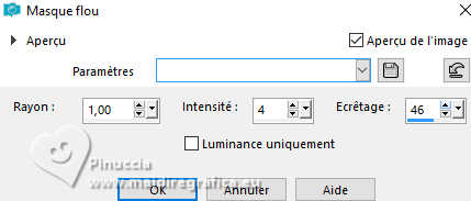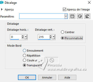 Pour traduire ce tutoriel j'ai utilisé PSPX9, mais il peut également être exécuté avec les autres versions. Suivant la version utilisée, vous pouvez obtenir des résultats différents. Depuis la version X4, la fonction Image>Miroir a été remplacée par Image>Renverser horizontalement, et Image>Renverser avec Image>Renverser verticalement. Dans les versions X5 et X6, les fonctions ont été améliorées par la mise à disposition du menu Objets. Dans la nouvelle version X7, nous avons à nouveau Miroir/Renverser, mais avec autres différences. Voir plus les détails à ce sujet ici Certaines dénominations ont changées entre les versions de PSP. Les plus frequentes dénominations utilisées: ![]() Traduction en italien ici Vos versions iciNécessaire pour réaliser ce tutoriel: ![]() (les liens des sites des tubeuses ici) Modules Externes consulter, si nécessaire, ma section de filtre ici Filters Unlimited 2.0 ici VM Texture - Tiles a GoGo ici VM Instant Art - Tripolis ici Graphics Plus - Cross Shadow ici Filtres VM Distortion peuvent être utilisés seuls ou importés dans Unlimited. voir comment le faire ici). Si un filtre est fourni avec cette icône, ![]() Si vous voulez utiliser vos propres couleurs, n'hésitez pas à changer le mode et l'opacité des calques Dans les plus récentes versions de PSP, vous ne trouvez pas le dégradé d'avant plan/arrière plan ou Corel_06_029. Vous pouvez utiliser le dégradés des versions antérieures. Ici le dossier Dégradés de CorelX. ![]() Placer en avant plan la couleur #00c0c0 et en arrière plan la couleur #090b99 ![]() Préparer en avant plan un dégradé de premier plan/arrière plan, style Linéaire. ![]() 1. Ouvrir une nouvelle image transparente 800 x 500 pixels. ![]() Remplir l'image transparente du dégradé.2. Sélections>Sélectionner tout. Sélections>Modifier>Contracter - 80 pixels. Sélections>Transformer la sélection en calque. 3. Caques>Nouveau calque raster. Remplir avec la couleur foncée.Sélections>Modifier>Contracter - 4 pixels. Presser CANC sur le clavier ![]() Garder sélectionné. Calques>Fusionner>Fusionner le calque de dessous. 4. Effets>Modules Externes>Filters Unlimited 2.0 - VM Texture - Tiles a GoGo. ![]() 5. Effets>Modules Externes>Filters Unlimited 2.0 - VM Instant Art - Tripolis, default settings. ![]() Effets>Effets 3D>Ombre portée, couleur noire. ![]() Sélections>Désélectionner tout. 6. Ouvrir deco-1-2-2025 ![]() Édition>Copier. Revenir sur votre travail et Édition>Coller comme nouveau calque. Ne pas déplacer. Garder l'opacité de ce calque à 46%. 7. Ouvrir deco-2-2-2025 ![]() Édition>Copier. Revenir sur votre travail et Édition>Coller comme nouveau calque. Ne pas déplacer. 8. Ouvrir deco-3-2-2025 ![]() Édition>Copier. Revenir sur votre travail et Édition>Coller comme nouveau calque. Effets>Effets d'image>Décalage. ![]() Calques>Dupliquer. Image>Miroir>Miroir vertical (Image>Renverser). 9. Ouvrir Emma-mulder-bergsma-1890 ![]() Édition>Copier. Revenir sur votre travail et Édition>Coller comme nouveau calque. Image>Miroir>Miroir horizontal (Image>Miroir). Déplacer le tube à gauche.10. Ouvrir vogel-AI ![]() Édition>Copier. Revenir sur votre travail et Édition>Coller comme nouveau calque. Calques>Dupliquer. Positionner le tubes à votre goût.![]() 11. Image>Ajouter des bordures, 1 pixel, symétrique, couleur d'avant plan. Sélections>Sélectionner tout. Édition>Copier. Image>Ajouter des bordures, 40 pixels, symétrique, couleur #ffffff. Sélections>Inverser. Édition>Coller dans la sélection. Réglage>Flou>Flou gaussien - rayon 30. ![]() 12. Effets>Modules Externes>Graphics Plus - Cross Shadow. ![]() Sélections>Inverser. Effets>Effets 3D>Ombre portée, comme précédemment. Sélections>Désélectionner tout. 13. Image>Ajouter des bordures, 1 pixel, symétrique, couleur d'avant plan. 14. Réglage>Netteté>Masque Flou. ![]() 15. Signer votre travail sur un nouveau calque. Calques>Fusionner>Tous et enregistrer en jpg. Version avec image de Pinterest. ![]() ![]() Si vous avez des problèmes, ou des doutes, ou vous trouvez un link modifié, ou seulement pour me dire que ce tutoriel vous a plu, vous pouvez m'écrire. |