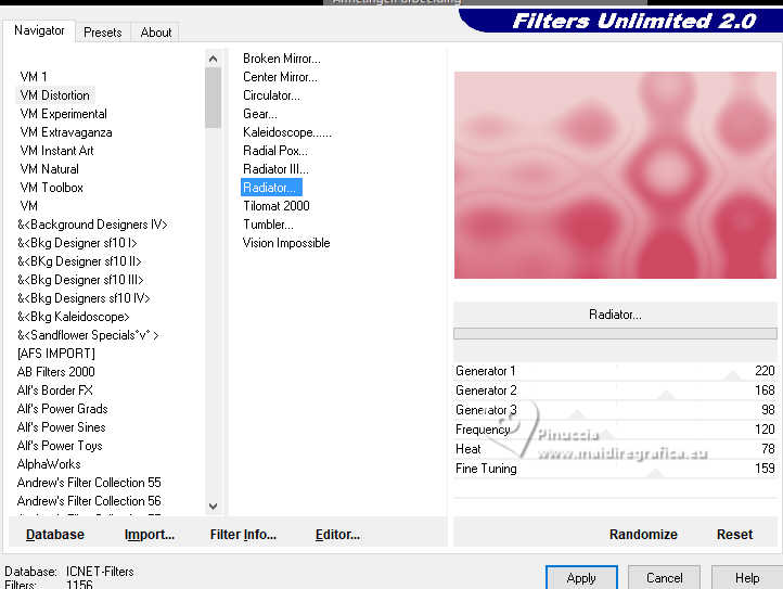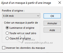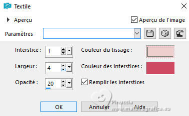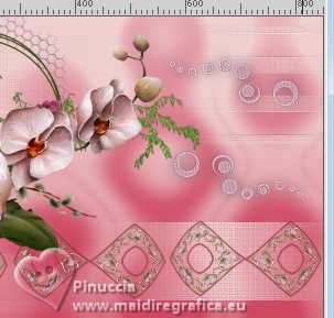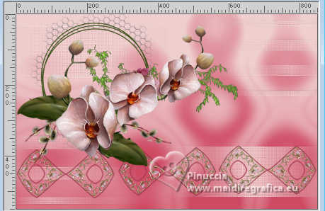 Pour traduire ce tutoriel j'ai utilisé PSPX9, mais il peut également être exécuté avec les autres versions. Suivant la version utilisée, vous pouvez obtenir des résultats différents. Depuis la version X4, la fonction Image>Miroir a été remplacée par Image>Renverser horizontalement, et Image>Renverser avec Image>Renverser verticalement. Dans les versions X5 et X6, les fonctions ont été améliorées par la mise à disposition du menu Objets. Dans la nouvelle version X7, nous avons à nouveau Miroir/Renverser, mais avec autres différences. Voir plus les détails à ce sujet ici Certaines dénominations ont changées entre les versions de PSP. Les plus frequentes dénominations utilisées: ![]() Traduction en italien ici Vos versions iciNécessaire pour réaliser ce tutoriel: ![]() (les liens des sites des tubeuses ici) Modules Externes consulter, si nécessaire, ma section de filtre ici Filters Unlimited 2.0 qui VM Distortion - Radiator ici Filtres VM Distortion peuvent être utilisés seuls ou importés dans Unlimited. voir comment le faire ici). Si un filtre est fourni avec cette icône, ![]() Si vous voulez utiliser vos propres couleurs, n'hésitez pas à changer le mode et l'opacité des calques Dans les plus récentes versions de PSP, vous ne trouvez pas le dégradé d'avant plan/arrière plan ou Corel_06_029. Vous pouvez utiliser le dégradés des versions antérieures. Ici le dossier Dégradés de CorelX. ![]() Ouvrir le masque dans PSP et le minimiser avec le reste du matériel. Placer en avant plan la couleur #ce4a63, et en arrière plan la couleur #efcece. ![]() Préparer en avan tplan un dégradé de premier plan/arrière plan, style Linéaire. ![]() 1. Ouvrir une nouvelle image transparente 850 x 550 pixels. ![]() Remplir l'image transparente du dégradé.2. Effets>Modules Externes>Filter Unlimited 2.0 - VM Distortion - Radiator, par défaut. ![]() 3. Calques>Nouveau calque raster. Remplir le calque avec la couleur claire.4. Calques>Nouveau calque de masque>A partir d'une image. Ouvrir le menu deroulant sous la fenêtre d'origine et vous verrez la liste des images ouvertes. Sélectionner le masque X-04-msk. ![]() Calques>Fusionner>Fusionner le groupe. Effets>Effets de bords>Accentuer davantage. 5. Effets>Effets de textures>Textile couleur du tissage: couleur claire couleur des interstices: couleur foncée. ![]() Réglage>Netteté>Netteté. 6. Ouvrir sierlijn-3-2025 ![]() Édition>Copier. Revenir sur votre travail et Édition>Coller comme nouveau calque. Déplacer le tube en bas, sur le bord.7. Ouvrir le tube orchidee-12 ![]() Édition>Copier. Revenir sur votre travail et Édition>Coller comme nouveau calque. Déplacer le tube en haut à gauche.![]() 8. Ouvrir deco-1-3-2025 ![]() Édition>Copier. Revenir sur votre travail et Édition>Coller comme nouveau calque. Déplacer le tube en haut à droite, voir mon exemple.![]() 9. Image>Ajouter des bordures, 1 pixel, symétrique, couleur foncée. Sélections>Sélectionner tout. 10. Image>Ajouter des bordures, 40 pixels, symétrique, couleur claire. Sélections>Inverser. Effets>Effets de textures>Textile, comme précédemment. Sélections>Inverser. Effets>Effets 3D>Ombre portée, couleur noire. ![]() Seléctions>Désélectionner tout. Image>Ajouter des bordures, 1 pixel, symétrique, couleur foncée. 11. Signer votre travail sur un nouveau calque. Calques>Fusionner>Tous et enregistrer en jpg. Pour les tubes de cette version merci Tammy's Welt ![]() ![]() Si vous avez des problèmes, ou des doutes, ou vous trouvez un link modifié, ou seulement pour me dire que ce tutoriel vous a plu, vous pouvez m'écrire. |