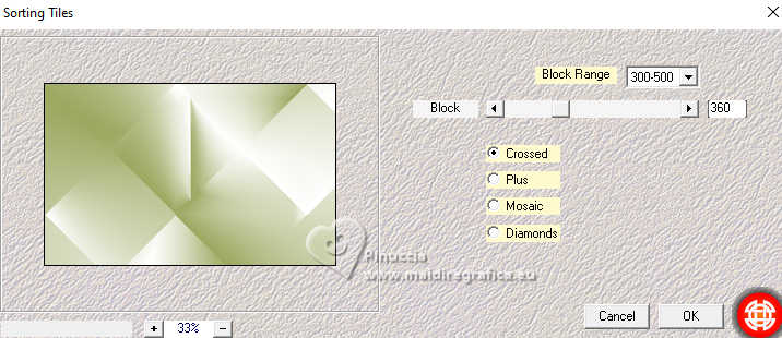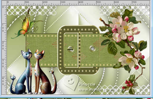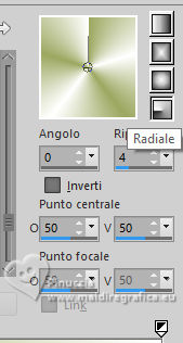 qui puoi trovare qualche risposta ai tuoi dubbi. Se l'argomento che ti interessa non è presente, ti prego di segnalarmelo. Per tradurre il tutorial, creato con PSPXI, ho usato PSPX9, ma può essere eseguito con ogni versione di PSP. Dalla versione X4, il comando Immagine>Rifletti è stato sostituito con Immagine>Capovolgi in orizzontale, e il comando Immagine>Capovolgi con Immagine>Capovolgi in verticale. Nelle versioni X5 e X6, le funzioni sono state migliorate rendendo disponibile il menu Oggetti. Con la nuova versione X7, sono tornati Rifletti/Capovolgi, ma con nuove differenze Vedi la scheda sull'argomento qui traduzione in francese qui Le vostre versioni quiOccorrente: ![]() (in questa pagina trovi i links ai siti dei creatori di tubes) Filtri: in caso di dubbi, ricorda di consultare la mia sezione filtri qui AAA Frames - Foto Frame qui Mehdi - Sorting Tiles qui ![]() non esitare a cambiare modalità di miscelatura e opacità secondo i colori utilizzati. Nelle ultime versioni di PSP non c'è il gradiente di primo piano/sfondo (Corel_06_029) Puoi usare i gradienti delle versioni precedenti. Trovi qui i gradienti Corel X. ![]() Imposta il colore di primo piano con #9ca760, e il colore di sfondo con #ffffff. ![]() Passa il colore di primo piano a Gradiente di primo piano/sfondo, stile Radiale. ![]() 1. Apri una nuova immagine trasparente 800 x 500 pixels. ![]() Riempi l'immagine trasparente con il gradiente.2. Effetti>Plugins>Mehdi - Sorting Tiles. ![]() 3. Apri deco-1-4-2025 ![]() Modifica>Copia. Torna al tuo lavoro e vai a Modifica>Incolla come nuovo livello. 4. Apri deco-12 ![]() Modifica>Copia. Torna al tuo lavoro e vai a Modifica>Incolla come nuovo livello. Effetti>Effetti di immagine>Motivo unico. ![]() 5. Apri Riem ![]() Modifica>Copia. Torna al tuo lavoro e vai a Modifica>Incolla come nuovo livello. Immagine>Ridimensiona, al 90%, tutti i livelli non selezionato. 6. Apri sier-tak ![]() Modifica>Copia. Torna al tuo lavoro e vai a Modifica>Incolla come nuovo livello. Sposta il tube a destra.7. Apri pinteres-12 ![]() Modifica>Copia. Torna al tuo lavoro e vai a Modifica>Incolla come nuovo livello. Posiziona il tube a tuo piacimento.8. Apri butterfly-02 ![]() Modifica>Copia. Torna al tuo lavoro e vai a Modifica>Incolla come nuovo livello. Sposta il tube a tuo piacimento.![]() 9. Immagine>Aggiungi bordatura, 2 pixels, simmetriche, colore scuro #5e5d2f. Selezione>Seleziona tutto. Immagine>Aggiungi bordatura, 40 pixels, simmetriche, colore chiaro di primo piano #9ca760. 10. Effetti>Effetti 3D>Sfalsa ombra, colore nero. ![]() 11. Selezione>Seleziona tutto. Immagine>Aggiungi bordatura, 1 pixel, simmetriche, colore scuro #5e5d2f. 12. Firma il tuo lavoro su un nuovo livello. Livelli>Unisci>Unisci tutto e salva in formato jpg. Per i tubes di questo esempio grazie Wieske ![]() ![]() Se hai problemi o dubbi, o trovi un link non funzionante, o anche soltanto per un saluto, scrivimi. |