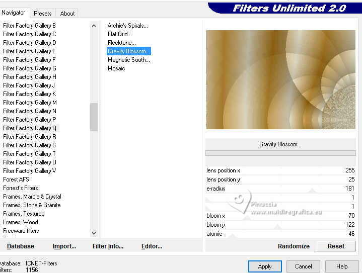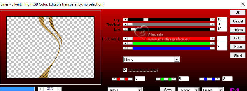 qui puoi trovare qualche risposta ai tuoi dubbi. Se l'argomento che ti interessa non è presente, ti prego di segnalarmelo. Per tradurre il tutorial, creato con PSPXI, ho usato PSPX9, ma può essere eseguito con ogni versione di PSP. Dalla versione X4, il comando Immagine>Rifletti è stato sostituito con Immagine>Capovolgi in orizzontale, e il comando Immagine>Capovolgi con Immagine>Capovolgi in verticale. Nelle versioni X5 e X6, le funzioni sono state migliorate rendendo disponibile il menu Oggetti. Con la nuova versione X7, sono tornati Rifletti/Capovolgi, ma con nuove differenze Vedi la scheda sull'argomento qui traduzione in francese qui Le vostre versioni quiOccorrente: ![]() (in questa pagina trovi i links ai siti dei creatori di tubes) Filtri: in caso di dubbi, ricorda di consultare la mia sezione filtri qui Filters Unlimited 2.0 qui Filter Factory Gallery Q - Gravity Blossom qui AP 01 [Innovations] - Lines SilverLining qui I filtri Factory Gallery si possono usare da soli o importati in Filters Unlimited (come fare vedi qui) Se un filtro fornito appare con questa icona ![]() non esitare a cambiare modalità di miscelatura e opacità secondo i colori utilizzati. Nelle ultime versioni di PSP non c'è il gradiente di primo piano/sfondo (Corel_06_029) Puoi usare i gradienti delle versioni precedenti. Trovi qui i gradienti Corel X. ![]() 1. Imposta il colore di primo piano con #e4dec8, e il colore di sfondo con #c4994b. ![]() Passa il colore di primo piano a Gradiente di primo piano/sfondo, stile Lineare. ![]() 2. Apri una nuova immagine trasparente 900 x 600 pixel. ![]() Riempi l'immagine trasparente con il gradiente.3. Effetti>Plugins>Filters Unlimited 2.0 - Filter Factory Gallery Q - Gravity Blossom. ![]() 4. Apri deco-2-5-2025 ![]() Modifica>Copia. Torna al tuo lavoro e vai a Modifica>Incolla come nuovo livello. 5. Apri Deco-3-5-2025 ![]() Modifica>Copia. Torna al tuo lavoro e vai a Modifica>Incolla come nuovo livello. Oggetti>Allinea>Sinistra. 6. Apri Astrid penseel 111a ![]() Modifica>Copia. Torna al tuo lavoro e vai a Modifica>Incolla come nuovo livello. 7. Attiva lo strumento Bacchetta magica , sfumatura e tolleranza 0,![]() e clicca nella parte nera del tube per selezionarla. ![]() Riempi la selezione con il colore di sfondo.Selezione>Deseleziona. 8. Effetti>Plugins>AP 01 [Innovations] - Lines SilverLining. ![]() 9. Immagine>Rifletti>Rifletti orizzontalmente. Oggetti>Allinea>Sinistra. Effetti>Effetti 3D>Sfalsa ombra, colore nero. ![]() 10. Attiva il livello Raster 3. Attiva lo strumento Gomma con i seguenti settaggi![]() Cancella tutto ciò che si trova al di fuori della curva sinistra. ![]() 11. Attiva il livello superiore. Livelli>Unisci>Unisci giù. 12. Livelli>Duplica. Immagine>Rifletti>Rifletti orizzontalmente (Immagine>Rifletti). 13. Apri raam ![]() Modifica>Copia. Torna al tuo lavoro e vai a Modifica>Incolla come nuovo livello. 14. Apri Deco-1-5-2025 ![]() Modifica>Copia. Torna al tuo lavoro e vai a Modifica>Incolla come nuovo livello. Effetti>Effetti di immagine>Scostamento. ![]() 15. Livelli>Disponi>Sposta giù. 16. Apri Pinterest-1744 ![]() Modifica>Copia. Torna al tuo lavoro e vai a Modifica>Incolla come nuovo livello. Livelli>Disponi>Porta in alto. Posiziona il tube a tuo piacimento.Effetti>Effetti 3D>Sfalsa ombra, a scelta. 17. Immagine>Aggiungi bordatura, 1 pixel, simmetriche, colore nero. Selezione>Seleziona tutto. Modifica>Copia. Immagine>Aggiungi bordatura, 40 pixels, simmetriche, colore chiaro. Selezione>Inverti. Modifica>Incolla nella selezione. 18. Regola>Sfocatura>Sfocatura gaussiana - raggio 30. ![]() Selezione>Inverti. 19. Effetti>Effetti 3D>Sfalsa ombra, colore nero. ![]() Selezione>Deseleziona. 20. Immagine>Aggiungi bordatura, 1 pixel, simmetriche, colore nero. Firma il tuo lavoro su un nuovo livello. Livelli>Unisci>Unisci tutto e salva in formato jpg. Per il tube di questo esempio grazie Renée ![]() ![]() Se hai problemi o dubbi, o trovi un link non funzionante, o anche soltanto per un saluto, scrivimi. |