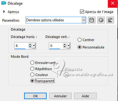 Pour traduire ce tutoriel j'ai utilisé PSPX9, mais il peut également être exécuté avec les autres versions. Suivant la version utilisée, vous pouvez obtenir des résultats différents. Depuis la version X4, la fonction Image>Miroir a été remplacée par Image>Renverser horizontalement, et Image>Renverser avec Image>Renverser verticalement. Dans les versions X5 et X6, les fonctions ont été améliorées par la mise à disposition du menu Objets. Dans la nouvelle version X7, nous avons à nouveau Miroir/Renverser, mais avec autres différences. Voir plus les détails à ce sujet ici Certaines dénominations ont changées entre les versions de PSP. Les plus frequentes dénominations utilisées: ![]() Traduction en italien ici Vos versions iciNécessaire pour réaliser ce tutoriel: ![]() (les liens des sites des tubeuses ici) Modules Externes consulter, si nécessaire, ma section de filtre ici Filters Unlimited 2.0 qui Filter Factory Gallery Q - Gravity Blossom ici AP 01 [Innovations] - Lines SilverLining ici Filtres Factory Gallery peuvent être utilisés seuls ou importés dans Filters Unlimited. voir comment le faire ici). Si un filtre est fourni avec cette icône, ![]() Si vous voulez utiliser vos propres couleurs, n'hésitez pas à changer le mode et l'opacité des calques Dans les plus récentes versions de PSP, vous ne trouvez pas le dégradé d'avant plan/arrière plan ou Corel_06_029. Vous pouvez utiliser le dégradés des versions antérieures. Ici le dossier Dégradés de CorelX. ![]() 1. Placer en avant plan la couleur #e4dec8, et en arrière plan la couleur #c4994b. ![]() Préparer en avant plan un dégradé de premier plan/arrière plan, style Linéaire. ![]() 2. Ouvrir une nouvelle image transparente 900 x 600 pixel. ![]() Remplir l'image transparente du dégradé.3. Effets>Modules Externes>Filters Unlimited 2.0 - Filter Factory Gallery Q - Gravity Blossom. ![]() 4. Ouvrir deco-2-5-2025 ![]() Édition>Copier. Revenir sur votre travail et Édition>Coller comme nouveau calque. 5. Ouvrir Deco-3-5-2025 ![]() Édition>Copier. Revenir sur votre travail et Édition>Coller comme nouveau calque. Objets>Aligner>Gauche. 6. Ouvrir Astrid penseel 111a ![]() Édition>Copier. Revenir sur votre travail et Édition>Coller comme nouveau calque. 7. Activer l'outil Baguette magique , tolérance et progressivité 0,![]() et cliquer dans la partie noire du tube pour la sélectionner. ![]() Remplir la sélection avec la couleur d'arrière plan.Sélections>Désélectionner tout. 8. Effets>Modules Externes>AP 01 [Innovations] - Lines SilverLining. ![]() 9. Image>Miroir>Miroir Horizontal. Objets>Aligner>Gauche. Effets>Effets 3D>Ombre portée, couleur noire. ![]() 10. Vous positionner sur le calque Raster 3. Activer l'outil Gomme avec ces réglages![]() Effacer tout ce qui se trouve en dehors de la courbe de gauche ![]() 11. Vous positionner sur le calque du haut de la pile. Calques>Fusionner>Fusionner le calque de dessous. 12. Calques>Dpuliquer. Image>Miroir>Miroir horizontal. 13. Ouvrir raam ![]() Édition>Copier. Revenir sur votre travail et Édition>Coller comme nouveau calque. 14. Ouvrir Deco-1-5-2025 ![]() Édition>Copier. Revenir sur votre travail et Édition>Coller comme nouveau calque. Effets>Effets d'image>Décalage. ![]() 15. Calques>Agencer>Déplacer vers le bas. 16. Ouvrir Pinterest-1744 ![]() Édition>Copier. Revenir sur votre travail et Édition>Coller comme nouveau calque. Calques>Agencer>Placer en haut de la pile. Positionner le tube à votre goût.Effets>Effets 3D>Ombre portée, à choix. 17. Image>Ajouter des bordures, 1 pixel, symétrique, couleur noire. Sélections>Sélectionner tout. Édition>Copier. Image>Ajouter des bordures, 40 pixels, symétrique, couleur claire. Sélections>Inverser. Édition>Coller dans la sélection 18. Réglage>Flou>Flou gaussien - rayon 30. ![]() Sélections>Inverser. 19. Effets>Effets 3D>Ombre portée, couleur noire. ![]() Sélections>Désélectionner tout. 20. Image>Ajouter des bordures, 1 pixel, symétrique, couleur noire. Signer votre travail sur un nouveau calque. Calques>Fusionner>Tous et enregistrer en jpg. Pour le tube de cette version merci Renée ![]() ![]() Si vous avez des problèmes, ou des doutes, ou vous trouvez un link modifié, ou seulement pour me dire que ce tutoriel vous a plu, vous pouvez m'écrire. |