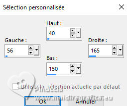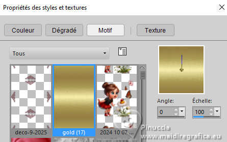Pour traduire ce tutoriel j'ai utilisé PSPX9, mais il peut également être exécuté avec les autres versions. Suivant la version utilisée, vous pouvez obtenir des résultats différents. Depuis la version X4, la fonction Image>Miroir a été remplacée par Image>Renverser horizontalement, et Image>Renverser avec Image>Renverser verticalement. Dans les versions X5 et X6, les fonctions ont été améliorées par la mise à disposition du menu Objets. Dans la nouvelle version X7, nous avons à nouveau Miroir/Renverser, mais avec autres différences. Voir plus les détails à ce sujet ici Certaines dénominations ont changées entre les versions de PSP. Les plus frequentes dénominations utilisées: ![]() Traduction en italien ici Vos versions iciNécessaire pour réaliser ce tutoriel: ![]() (les liens des sites des tubeuses ici) Modules Externes consulter, si nécessaire, ma section de filtre ici AAA Frames - Foto Frame ici ![]() Si vous voulez utiliser vos propres couleurs, n'hésitez pas à changer le mode et l'opacité des calques Dans les plus récentes versions de PSP, vous ne trouvez pas le dégradé d'avant plan/arrière plan ou Corel_06_029. Vous pouvez utiliser le dégradé des versions antérieures. Ici le dossier Dégradés de CorelX. ![]() Ouvrir le motif gold dans PSP et le minimiser avec le reste du matériel. Placer en avant plan la couleur #f9bb9c, et en arrière plan la couleur #ca4758. ![]() Préparer en avant plan un dégradé de premier plan/arrière plan, style Linéaire. ![]() Placer en arrière plan le motif et sélectionner le motif or Gold 17 ![]() 1. Ouvrir une nouvelle image transparente 750 x 550 pixels. ![]() Remplir l'image transparente du dégradé.3. Effets>Effets de réflexion>Résonance. ![]() 4. Effets>Effets de bords>Accentuer davantage. 5. Activer l'outil Sélection ![]() (peu importe le type de sélection, parce que avec la sélection personnalisée vous obtenez toujours un rectangle), cliquer sur Sélection personnalisée ![]() et setter ces paramètres. ![]() Calques>Nouveau calque raster. Remplir le calque avec le motif or.Sélections>Modifier>Contracter - 4 pixels. Presser CANC sur le clavier ![]() Remplir la sélection du dégradé.Effets>Effets de réflexion>Résonance, comme précédemment. Effets>Effets de bords>Accentuer davantage. Sélections>Désélectionner tout. 6. Effets>Effets de réflexion>Résonance, comme précédemment. ![]() Calques>Dupliquer. Image>Miroir>Miroir vertical (Image>Renverser). Calques>Fusionner>Fusionner le calque de dessous. Calques>Dupliquer. Image>Miroir>Miroir horizontal (Image>Miroir). Calques>Fusionner>Fusionner le calque de dessous. 7. Calques>Nouveau calque raster. Sélection personnalisée ![]() ![]() Remplir avec le motif or d'arrière plan.8. Sélections>Modifier>Contracter - 6 pixels. Presser CANC sur le clavier ![]() Rempli la sélection du dégradé.Effets>Effets de réflexion>Résonance, comme précédemment. Effets>Effets de bords>Accentuer davantage. Sélections>Désélectionner tout. Effets>Effets 3D>Ombre portée, couleur noire. ![]() Objets>Aligner>Centrer sur le support. ![]() 9. Ouvrir deco-9-2025 ![]() Édition>Copier. Revenir sur votre travail et Édition>Coller comme nouveau calque. 10. Ouvrir le tube 2024 10 07 Cat N1 ![]() Effacer le watermark et Édition>Copier. Revenir sur votre travail et Édition>Coller comme nouveau calque. Positionner bien le tube.Effets>Effets 3D>Ombre portée, comme précédemment. 11. Image>Ajouter des bordures, 2 pixels, symétrique, couleur foncée. Sélections>Sélectionner tout. Image>Ajouter des bordures, 40 pixels, symétrique, couleur blanche #ffffff. 12. Effets>Modules Externes>AAA Frames - Foto Frame. ![]() Sélections>Désélectionner tout. 13. Signer votre travail sur un nouveau calque. Calques>Fusionner>Tous et enregistrer en jpg. Pour le tube de cette version merci LoriM ![]() ![]() Si vous avez des problèmes, ou des doutes, ou vous trouvez un link modifié, ou seulement pour me dire que ce tutoriel vous a plu, vous pouvez m'écrire. |