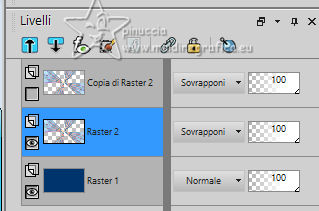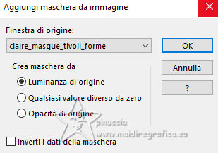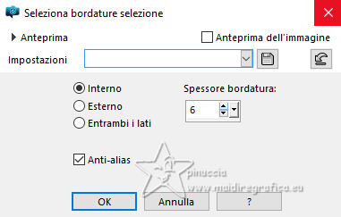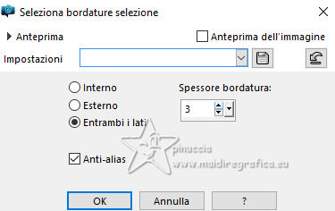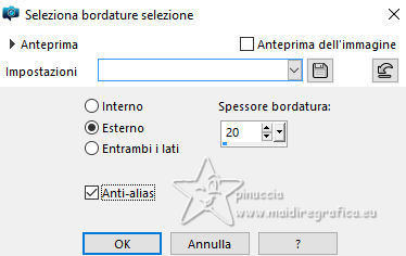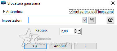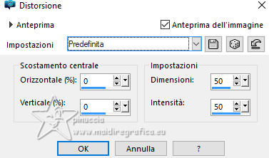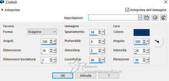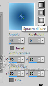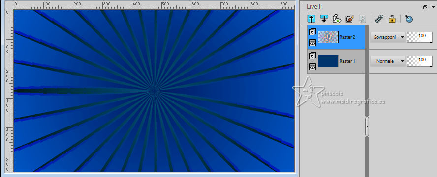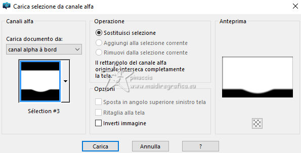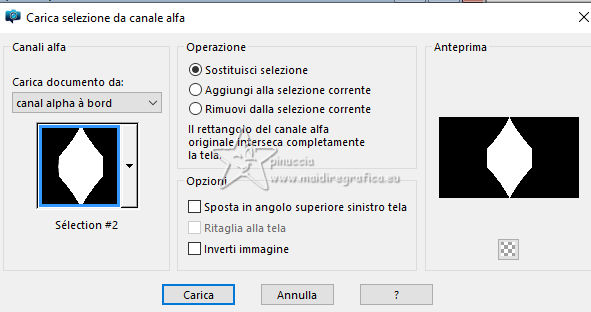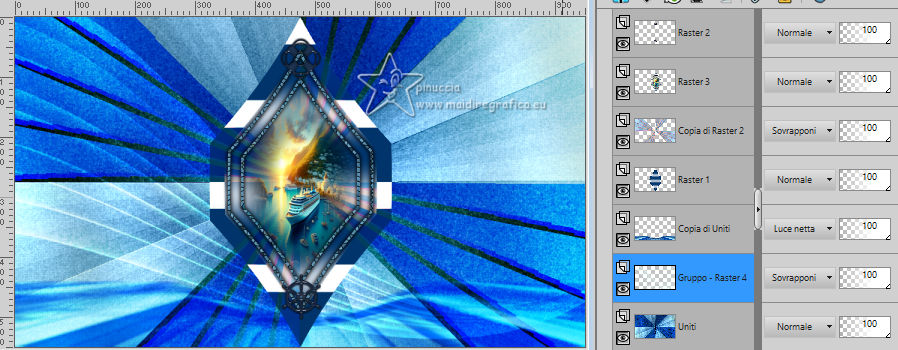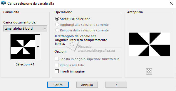 qui puoi trovare qualche risposta ai tuoi dubbi. Se l'argomento che ti interessa non è presente, ti prego di segnalarmelo. Questo tutorial, creato con PSP 2020, è stato tradotto con PSPX9, ma può essere realizzato anche con le altre versioni di PSP. Dalla versione X4, il comando Immagine>Rifletti è stato sostituito con Immagine>Capovolgi in orizzontale, e il comando Immagine>Capovolgi con Immagine>Capovolgi in verticale. Nelle versioni X5 e X6, le funzioni sono state migliorate rendendo disponibile il menu Oggetti. Con la nuova versione X7, sono tornati Rifletti>Capovolgi, ma con nuove varianti. Vedi la scheda sull'argomento qui English Translation qui Le vostre versioni qui![]() Occorrente: ![]() Materale di Moi-Même Altri tubes sul tema qui (non utilizzare per altri tutorial) (in questa pagina trovi i links ai siti dei creatori del materiale) ![]() se hai problemi con i filtri, consulta la mia sezione filtri qui Filters Unlimited 2.0 qui &< Bkg Designer sf10I> - Cruncher (da importare in Unlimited) qui Filters Factory Gallery E - Zebra Fun, Transparent Pizza, Gradient/Spoke Ratio Makerqui Graphics Plus - Emboss, Cross Shadow qui Mehdi - Sorting Tiles qui Mura's Meister - Perspective Tiling qui Alien Skin Eye Candy 5 Textures - Weave qui I filtri Factory Gallery e Graphics Plus si possono usare da soli o importati in Filters Unlimited (come fare vedi qui) Se un filtro fornito appare con questa icona ![]() non esitare a cambiare modalità di miscelatura e opacità secondo i colori utilizzati. Nelle ultime versioni di PSP non c'è il gradiente di primo piano/sfondo (Corel_06_029) Puoi usare i gradienti delle versioni precedenti. Trovi qui i gradienti Corel X. ![]() Apri la maschera in PSP e minimizzala con il resto del materiale Se hai problemi con il canale alfa, apri una nuova immagine trasparente 950 x 550 pixels, e usa le selezioni da disco. Colori: ![]() 1. Imposta il colore di primo piano con il colore 1 #00356c, e il colore di sfondo con il colore 2 #97defe. ![]() colore 3 #e8fefc 2. Apri Canal_alpha_ À bord Questa immagine, che sarà la base del tuo lavoro non è vuota, ma contiene le selezioni salvate sul canale alfa. Riempi l'immagine trasparente con il colore di primo piano.Passa il colore di primo piano a Gradiente di primo piano/sfondo, stile Sprazzo di luce. ![]() Livelli>Nuovo livello raster. Abbassa l'opacità dello strumento Riempimento a 60 ![]() Riempi il livello con il gradiente.Effetti>Plugins>Filters Unlimited (o fuori, in questo caso ricorda che Unlimited non tiene in memoria i settaggi) Filter Factory Gallery E - Zebra Fan ![]() Cambia la modalità di miscelatura di questo livello in Sovrapponi (o altri, secondo i tuoi colori). ![]() Effetti>Plugins>Filters Unlimited (o fuori) - Filter Factory Gallery E - Transparent Pizza Fan ![]() 3. Livelli>Duplica. Chiudi questo livello e attiva il livello sottostante. ![]() 4. Livelli>Nuovo livello raster. Selezione>Carica/Salva selezione>Carica selezione da canale alfa. La selezione Sélection #1 è subito disponibile. Devi soltanto cliccare Carica. ![]() Riporta l'opacità dello strumento Riempimento a 100. Riempi la selezione con il gradiente.Effetti>Plugins>Filters Unlimited (o fuori) - Gradient/Spokes Ratio Maker ![]() Effetti>Plugins>Graphics Plus - Emboss ![]() Selezione>Deseleziona. Livelli>Unisci>Unisci visibile (il livello Copia di Raster 2 è ancora chiuso: non è stato dimenticato). 5. Livelli>Nuovo livello raster. Selezione>Seleziona tutto. Apri il motivo motif à bord MM ![]() Modifica>Copia (per adattare ai tuoi colori: per esempio: seleziona le barre del colore scuro (colore 1) con la bacchetta magica, e riempi con il tuo colore). Torna al tuo lavoro e vai a Modifica>Incolla nella selezione. Selezione>Deseleziona. Rimani su questo livello. Nota: se vuoi cambiare i colori, minimizza il motivo sulla tua area di lavoro per usarlo ancora) 6. Effetti>Effetti geometrici>Pentagono. ![]() Immagine>Rifletti>Rifletti verticalmente (Immagine>Capovolgi). Ripeti Effetti>Effetti geometrici>Pentagono, con i settaggi precedenti. 7. Selezione>Carica/Salva selezione>Carica selezione da canale alfa. Apri il menu delle selezioni e carica la selezione Sélection 2 ![]() Selezione>Modifica>Seleziona bordature selezione. ![]() 8. Livelli>Nuovo livello raster. Riempi la selezione con il colore 2 (colore di sfondo).Effetti>Effetti di trama>Ciottoli - colore di primo piano (colore 1). ![]() Selezione>Deseleziona. Effetti>Effetti 3D>Sfalsa ombra, colore nero. ![]() 9. Attiva il livello sottostante. Selezione>Carica/Salva selezione>Carica selezione da canale alfa. Apri il menu delle selezioni e carica nuovamente la selezione Sélection 2 ![]() Selezione>Modifica>Contrai - 25 pixels. Regola>Sfocatura>Sfocatura gaussiana - raggio 20. ![]() Mantieni selezionato. 10. Selezione>Modifica>Contrai - 6 pixels. Livelli>Nuovo livello raster. Apri il tube A bord 1_AIgen par MM ![]() Cancella il watermark e vai a Modifica>Copia. Torna al tuo lavoro e vai a Modifica>Incolla nella selezione. Livelli>Duplica. Livelli>Unisci>Unisci giù. Mantieni ancora selezionato. 11. Selezione>Modifica>Seleziona bordature selezione. ![]() Riempi la selezione con il colore 2 (colore di sfondo).Effetti>Effetti di trama>Ciottoli, con i settaggi precedenti (colore di primo piano) ![]() Effetti>Effetti 3D>Sfalsa ombra, colore nero. ![]() Selezione>Deseleziona. 12. Attiva il livello soprastante. Livelli>Unisci>Unisci giù - 2 volte. Effetti>Effetti 3D>Sfalsa ombra, con i settaggi precedenti. Livelli>Disponi>Porta in alto. Immagine>Ridimensiona, all'80%, tutti i livelli non selezionato. Regola>Messa a fuoco>Metti a fuoco. 13. Livelli>Visualizza>Tutto. 14. Apri déco centre ![]() Cancella il watermark e vai a Modifica>Copia. Torna al tuo lavoro e vai a Modifica>Incolla come nuovo livello. Tasto K per attivare lo strumento Puntatore ![]() Posizione X: 437,00 - Posizione Y: 33,00. ![]() Tasto M per deselezionare lo strumento. Per adattare il tube: Strumento Trasforma in de