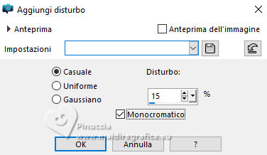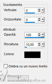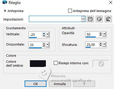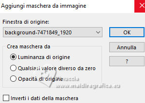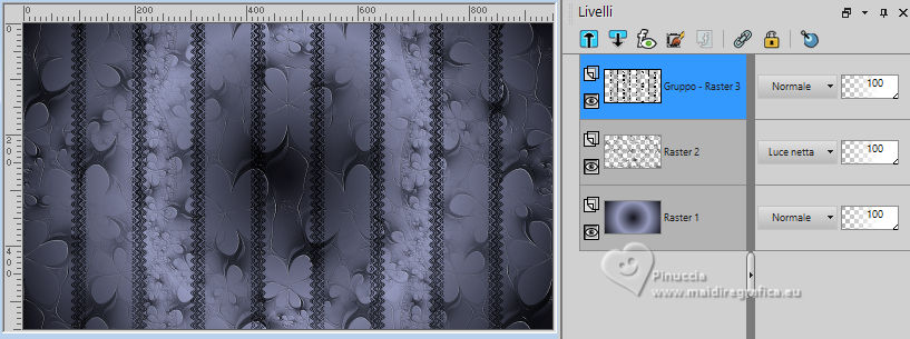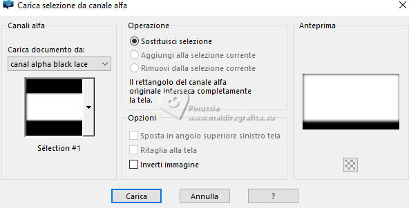 qui puoi trovare qualche risposta ai tuoi dubbi. Se l'argomento che ti interessa non è presente, ti prego di segnalarmelo. Questo tutorial, creato con PSP 2020, è stato tradotto con PSPX9, ma può essere realizzato anche con le altre versioni di PSP. Dalla versione X4, il comando Immagine>Rifletti è stato sostituito con Immagine>Capovolgi in orizzontale, e il comando Immagine>Capovolgi con Immagine>Capovolgi in verticale. Nelle versioni X5 e X6, le funzioni sono state migliorate rendendo disponibile il menu Oggetti. Con la nuova versione X7, sono tornati Rifletti>Capovolgi, ma con nuove varianti. Vedi la scheda sull'argomento qui English Translation qui Le vostre versioni qui![]() Occorrente: ![]() Materiale di Moi-Même Altri tube a tema qui (non usare per altri tutorial) (in questa pagina trovi i links ai siti dei creatori del materiale) ![]() se hai problemi con i filtri, consulta la mia sezione filtri qui Filters Unlimited 2.0 qui AAA Frames - Foto Frame qui L&K's - L&K's Pia qui Xero - Illustrator qui AP [Lines] - Lines SilverLining qui Mura's Meister - Perspective Tiling qui Alien Skin Eye Candy 5 Impact qui ![]() non esitare a cambiare modalità di miscelatura e opacità secondo i colori utilizzati. Nelle ultime versioni di PSP non c'è il gradiente di primo piano/sfondo (Corel_06_029) Puoi usare i gradienti delle versioni precedenti. Trovi qui i gradienti Corel X. Metti i preset Cliccando sul file una o due volte (a seconda delle tue impostazioni), automaticamente il preset si installerà nella cartella corretta. perchè uno o due clic vedi qui ![]() Se hai problemi con il canale alfa, apri una nuova immagine trasparente 950 x 550 pixels, e usa le selezioni da disco. 1. Imposta il colore di primo piano con il colore #14141c, e il colore di sfondo con il colore #959abd. ![]() colore 3 #000000 Passa il colore di primo piano a Gradiente di primo piano/sfondo, stile Sprazzo di luce. ![]() 2. Apri Canal_alpha black lace Questa immagine, che sarà la base del tuo lavoro non è vuota, ma contiene le selezioni salvate sul canale alfa. Riempi l'immagine trasparente con il gradiente.Apri déco black lace ![]() Modifica>Copia. Torna al tuo lavoro e vai a Modifica>Incolla come nuovo livello. Cambia la modalità di miscelatura di questo livello in Luce netta. 3. Apri l'immagine background-7471849_1920 e minimizzala.Torna al tuo lavoro. Livelli>Nuovo livello raster. Imposta il colore di primo piano con il colore nero. Riempi il livello con il colore nero.Livelli>Nuovo livello maschera>Da immavgine. Apri il menu sotto la finestra di origine e vedrai la lista dei files aperti. Seleziona l'immagine background-7471849_1920 ![]() Effetti>Effetti di bordo>Aumenta. Livelli>Unisci>Unisci gruppo. Abbiamo questo: ![]() Livelli>Unisci>Unisci visibile. 4. Livelli>Duplica. Regola>Sfocatura>Sfocatura gaussiana - raggio 25. ![]() Effetti>Plugins>L&K's - L&K's Pia ![]() Effetti>Effetti di bordo>Aumenta. Effetti>Plugins>Mura's Meister - Perspective Tiling. ![]() Effetti>Plugins>Xero - Illustrator ![]() 5. Selezione>Carica/Salva selezione>Carica selezione da canale alfa. La selezione sélection 1 è subito disponibile. Devi soltanto cliccare Carica. ![]() Premi 6 volte sulla tastiera il tasto CANC ![]() Selezione>Deseleziona. 6. Attiva il livello sottostante. Apri déco 01 ![]() Modifica>Copia. Torna al tuo lavoro e vai a Modifica>Incolla come nuovo livello. Cambia la modalità di miscelatura di questo livello in Luce diffusa. 7. Apri il tube dentelle noire ![]() Cancella la firma e vai a Modifica>Copia. Torna al tuo lavoro e vai a Modifica>Incolla come nuovo livello. 8. Imposta nuovamente il colore di primo piano con il colore (#14141c) e il gradiente di partenza. ![]() Attiva il livello superiore. Livelli>Nuovo livello raster. Riempi il livello con il gradiente.Selezione>Seleziona tutto. Selezione>Modifica>Contrai - 15 pixels. Premi sulla tastiera il tasto CANC. Passa il colore di primo piano a Colore. Riempi la selezione con il colore di primo piano.Selezione>Modifica>Contrai - 5 pixels. Premi sulla tastiera il tasto CANC. Mantieni selezionato. ![]() 9. Livelli>Nuovo livello raster. Effetti>Effetti 3D>Ritaglio, colore di sfondo. ![]() 10. Livelli>Nuovo livello raster. Effetti>Effetti 3D>Ritaglio, colore di primo piano. ![]() Selezione>Deseleziona. 11. Livelli>Unisci>Unisci giù. Effetti>Plugins>AP [Lines] - Lines SilverLining - Barred ![]() 12. Attiva il livello sottostante. Effetti>Plugins>L&K's - L&K's Pia, con i settaggi precedenti. ![]() Selezione>Carica/Salva selezione>Carica selezione da canale alfa. Apri il menu delle selezioni e carica la selezione sélection 2 ![]() Regola>Aggiungi/Rimuovi disturbo>Aggiungi disturbo. ![]() Selezione>Deseleziona. 13. Attiva il livello superiore. Apri déco 02 ![]() Modifica>Copia. Torna al tuo lavoro e vai a Modifica>Incolla come nuovo livello. Tasto K per attivare lo strumento Puntatore ![]() Posizione X: 149,00 - Posizione Y: 161,00. ![]() Tasto M per deselezionare lo strumento. 14. Livelli>Nuovo livello raster. Selezione>Carica/Salva selezione>Carica selezione da canale alfa. Apri il menu delle selezioni e carica la selezione sélection 3 ![]() Apri l'immagine paysage black lace_AIGEN MM ![]() Modifica>Copia. Torna al tuo lavoro e vai a Modifica>Incolla nella selezione. Regola>Messa a fuoco>Metti a fuoco. Effetti>Plugins>Alien Skin Eye Candy 5 Impact - Glass Seleziona il preset Black Lace MM et ok. Glass Color: bianco. ![]() Selezione>Deseleziona. Livelli>Disponi>Sposta giù. 15. Attiva il livello superiore. Livelli>Unisci>Unisci giù. Effetti>Plugins>Alien Skin Eye Candy 5 Impact - Extrude Seleziona il preset black lace extrude MM e cambia il colore con il tuo colore di sfondo. Basic: Solid and Highlight color: colore di sfondo. ![]() Effetti>Effetti 3D>Sfalsa ombra, colore nero. ![]() Tasto K per attivare lo strumento Puntatore ![]() Posizione X: 148,00 - Posizione Y: 157,00. ![]() 16. Livelli>Duplica. Immagine>Ridimensiona, al 50%, tutti i livelli non selezi