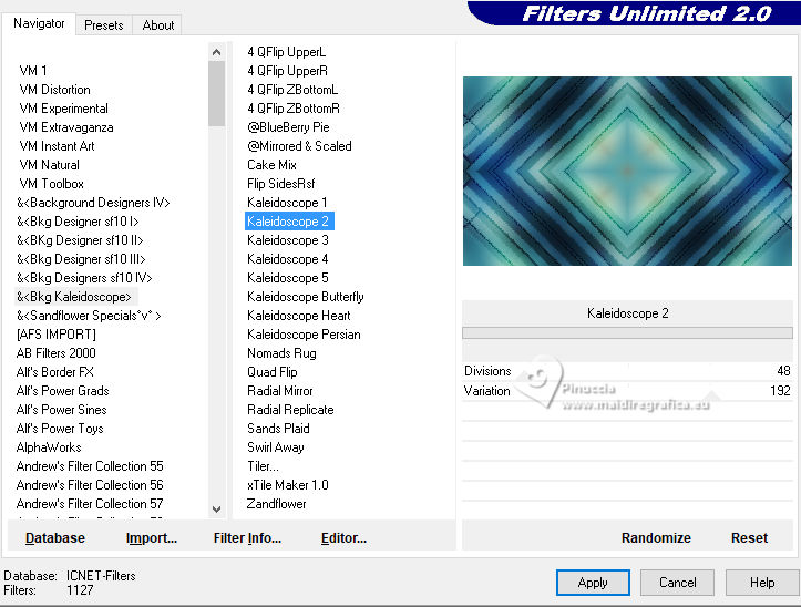 Effects>Plugins>Filters Unlimited 2.0 - &<Bkg Kaleidoscope> - Kaleidoscope 2.