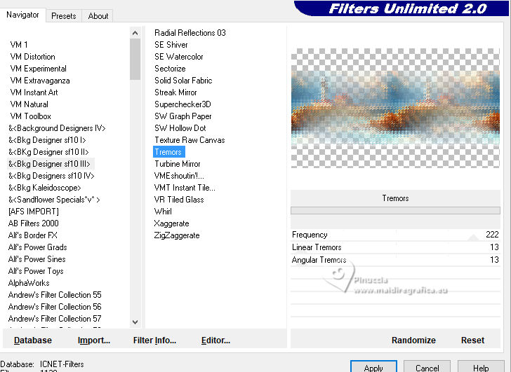 Effects>Plugins>Filters Unlimited 2.0 - &<Bkg Designer sf10III> - Tremors, default settings.