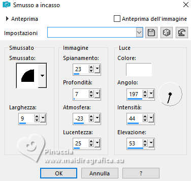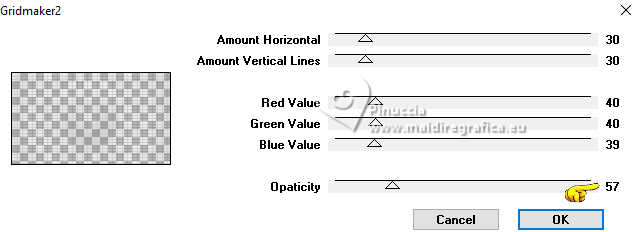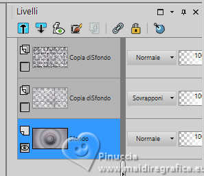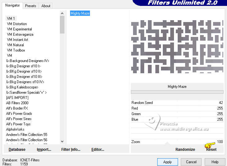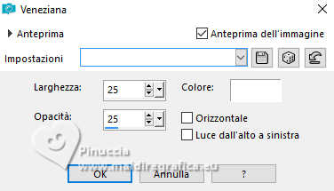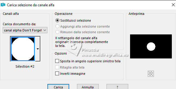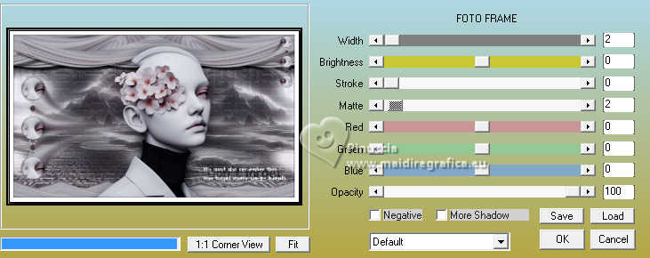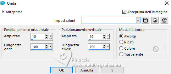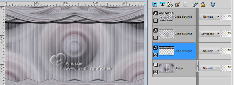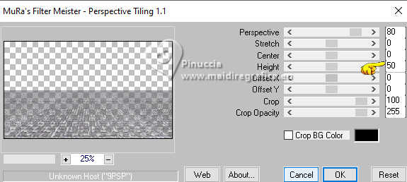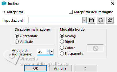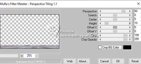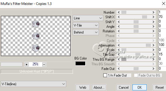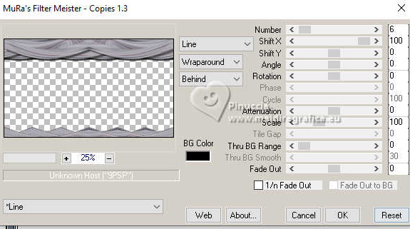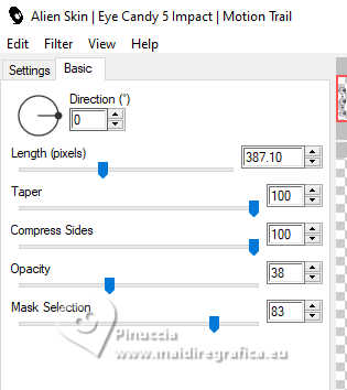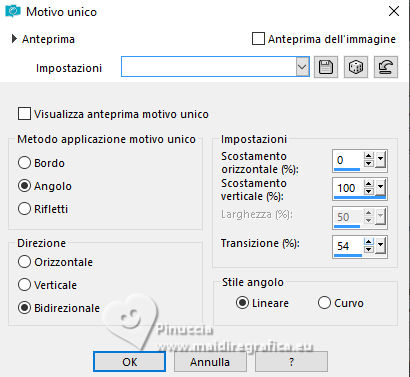 qui puoi trovare qualche risposta ai tuoi dubbi. Se l'argomento che ti interessa non è presente, ti prego di segnalarmelo. Questo tutorial, creato con PSP 2020, è stato tradotto con PSPX9, ma può essere realizzato anche con le altre versioni di PSP. Dalla versione X4, il comando Immagine>Rifletti è stato sostituito con Immagine>Capovolgi in orizzontale, e il comando Immagine>Capovolgi con Immagine>Capovolgi in verticale. Nelle versioni X5 e X6, le funzioni sono state migliorate rendendo disponibile il menu Oggetti. Con la nuova versione X7, sono tornati Rifletti>Capovolgi, ma con nuove varianti. Vedi la scheda sull'argomento qui English Translation qui Le vostre versioni qui![]() Occorrente: ![]() Per i tubes grazie Renée e Silvie. Il resto del materale è di Moi-Même (in questa pagina trovi i links ai siti dei creatori del materiale) ![]() se hai problemi con i filtri, consulta la mia sezione filtri qui Filters Unlimited 2.0 qui VM 1 - Mighty Maze (da importare in Unlimited) qui Tymoes - Gridmakers2 qui AAA Frames - Foto Frame qui Mura's Meister - Copies, Perspective Tiling qui Alien Skin Eye Candy 5 Impact - Glass, Motion Trail qui I filtri Tymoes si possono usare da soli o importati in Filters Unlimited (come fare vedi qui) Se un filtro fornito appare con questa icona ![]() non esitare a cambiare modalità di miscelatura e opacità secondo i colori utilizzati. ![]() Se hai problemi con il canale alfa, apri una nuova immagine trasparente 950 x 550 pixels, e usa le selezioni da disco. Scegli un colore scuro e un colore chiaro del tuo tube. Colori. ![]() Imposta il colore di primo piano con il colore 1 #523843, e il colore di sfondo con il colore #b7b3be. ![]() colore 3 #ffffff 1. Apri Canal_alpha_ Don't Forget Questa immagine, che sarà la base del tuo lavoro non è vuota, ma contiene le selezioni salvate sul canale alfa. Selezione>Seleziona tutto. Apri il tube Renee-TUBES-Juin-2025-1 ![]() Modifica>Copia. Torna al tuo lavoro e vai a Modifica>Incolla nella selezione. Selezione>Deseleziona. 2. Livelli>Duplica. Immagine>Rifletti>Rifletti orizzontalmente. (secondo il tuo tube, puoi anche fare Rifletti verticalmente). Livelli>Unisci>Unisci giù. 3. Effetti>Effetti di immagine>Motivo unico, con i settaggi standard. ![]() Regola>Sfocatura>Sfocatura radiale. ![]() Livelli>Unisci>Unisci tutto. 4. Livelli>Duplica. Effetti>Plugins>Tymoes - Gridmaker2. ![]() Livelli>Duplica. Effetti>Effetti di distorsione>Onda. ![]() Livelli>Unisci>Unisci giù. Cambia la modalità di miscelatura di questo livello in Sovrapponi. Effetti>Effetti di bordo>Aumenta. 5. Attiva il livello di sfondo. Livelli>Duplica. Effetti>Plugins>Filters Unlimited 2.0 - VM1 - Mighty Maze. ![]() 6. Selezione>Carica/Salva selezione>Carica selezione da canale alfa. La selezione Sélection #1 è subito disponibile. Devi soltanto cliccare Carica. ![]() Effetti>Effetti 3D>Ritaglio. ![]() Selezione>Inverti. Effetti>Effetti 3D>Smusso a incasso. ![]() Selezione>Deseleziona. Effetti>Effetti di bordo>Aumenta. Livelli>Disponi>Porta in alto. 7. Chiudi i due livelli superiori e attiva il livello di sfondo. ![]() Effetti>Effetti di trama>Veneziana - colore bianco. ![]() Effetti>Effetti di bordo>Aumenta. Effetti>Effetti di immagine>Motivo unico, con i settaggi standard. ![]() 8. Livelli>Duplica. Effetti>Effetti geometrici>inclina. ![]() Effetti>Plugins>Mura's Meister - Perspective Tiling. ![]() 9. Livelli>Duplica. Immagine>Rifletti>Rifletti orizzontalmente. Immagine>Rifletti>Rifletti verticalmente. Livelli>Unisci>Unisci giù. Effetti>Effetti di distorsione>Onda, con i settaggi precedenti. ![]() Effetti>Effetti di riflesso>Specchio rotante, con i settaggi standard. ![]() Effetti>Effetti 3D>Sfalsa ombra, con i settaggi standard. ![]() Effetti>Plugins>Mura's Meister - Copies. ![]() La tag e i livelli ![]() Livelli>Disponi>Porta in alto. Livelli>Visualizza>Tutto. 10. Attiva il livello sottostante, Copia di Sfondo. Livelli>Nuovo livello raster. Selezione>Seleziona tutto. Apri il paesaggio Dark_Beach56R_misted_Silvie ![]() Modifica>Copia. Torna al tuo lavoro e vai a Modifica>Incolla nella selezione. Selezione>Deseleziona. Effetti>Effetti di immagine>Motivo unico. ![]() Cambia la modalità di miscelatura di questo livello in Luminanza (esistente), e abbassa l'opacità al 90%. (puoi anche lasciare in modo Normale se il tuo paesaggio si accorda con i tuoi colori). Regola>Messa a fuoco>Metti a fuoco. 11. Attiva il livello sottostante (il terzo livello). Livelli>Duplica. Effetti>Plugins>Mura's Meister - Perspective Tiling ![]() 12. Attiva il livello di sfondo. Selezione>Carica/Salva selezione>Carica selezione da canale alfa. Apri il menu delle selezioni e carica la selezione sélection #2 ![]() Selezione>Innalza selezione a livello. Livelli>Disponi>Porta in alto. Regola>Sfocatura>Sfocatura gaussiana - raggio 5. ![]() Attiva nuovamente il tube di Renée Renee-TUBES-Juin-2025-1 e vai a Modifica>Copia. Torna al tuo lavoro e vai a Modifica>Incolla come nuovo livello. Posiziona sulla selezione la parte di tube che vuoi lasciare visibile.Per me, Strumento Puntatore (K) ![]() Posizione X: -113,00 - Posizione Y: -12,00. ![]() ![]() Tasto M per deselezionare lo strumento. Mantieni selezionato. 13. Selezione>Inverti. Premi sulla tastiera il tasto CANC ![]() Selezione>Inverti. Effetti>Plugins>Alien Skin Eye Candy 5 Impact - Glass. ![]() Selezione>Deseleziona. 14. Livelli>Unisci>Unisci giù. Immagine>Ridimensiona, al 50%, tutti i livelli non selezionato. Regola>Messa a fuoco>Metti a fuoco. Effetti>Plugins>Mura's Meister - Copies. ![]() Tasto K per attivare lo strumento Puntatore ![]() Posizione X: 29,00 - Posizione Y: 87,00. ![]() 15. Apri déco 1 ![]() Modifica>Copia. Torna al tuo lavoro e vai a Modifica>Incolla come nuovo livello. Posizione X: 58,00 - Posizione Y: 178,00. ![]() Tasto M per deselezionare lo strumento. 16. Livelli>Nuovo livello raster. Selezione>Carica/Salva selezione>Carica selezione da canale alfa. Apri il menu delle selezioni e carica la selezione 