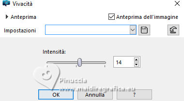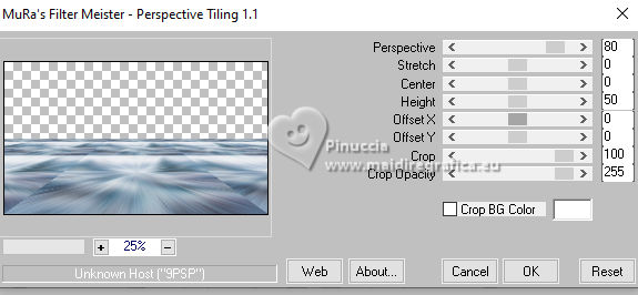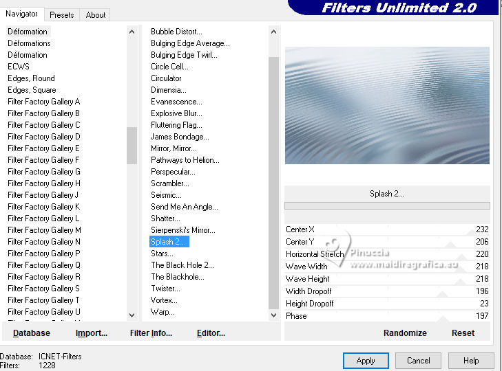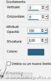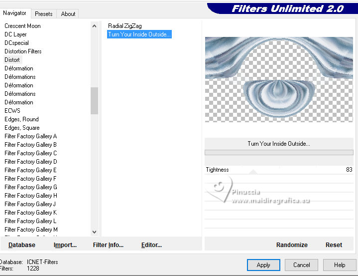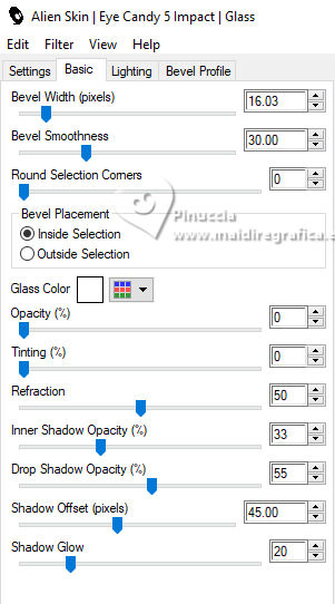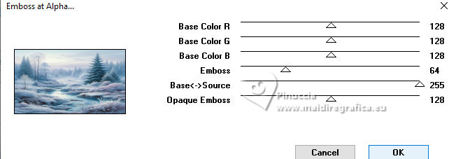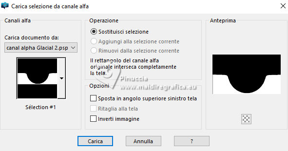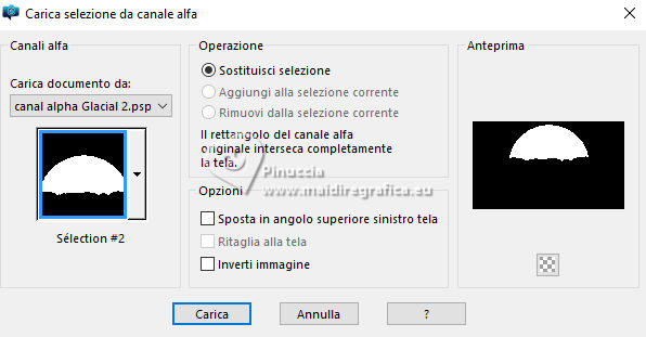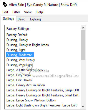 qui puoi trovare qualche risposta ai tuoi dubbi. Se l'argomento che ti interessa non è presente, ti prego di segnalarmelo. Questo tutorial, creato con PSP 2020, è stato tradotto con PSPX9, ma può essere realizzato anche con le altre versioni di PSP. Dalla versione X4, il comando Immagine>Rifletti è stato sostituito con Immagine>Capovolgi in orizzontale, e il comando Immagine>Capovolgi con Immagine>Capovolgi in verticale. Nelle versioni X5 e X6, le funzioni sono state migliorate rendendo disponibile il menu Oggetti. Con la nuova versione X7, sono tornati Rifletti>Capovolgi, ma con nuove varianti. Vedi la scheda sull'argomento qui English Translation qui Le vostre versioni qui![]() Occorrente: ![]() Grazie per i tubes Cat Dana, Silvie, Addictive Pleasures. Il resto del materiale di Moi-Même (non usare per altri tutorial) Altri tube a tema qui (in questa pagina trovi i links ai siti dei creatori del materiale) ![]() se hai problemi con i filtri, consulta la mia sezione filtri qui Filters Unlimited 2.0 qui Distort - Turn Your Inside Outside qui Distortion Filters - Splash 2 (da importare in Unlimited) qui Mura's Seamless - Emboss at Alpha qui Mura's Meister - Perspective Tiling qui Alien Skin Eye Candy 5 Nature - Snow Drift qui Alien Skin Eye Candy 5 Impact - Glass qui I filtri Mura's Seamless si possono usare da soli o importati in Filters Unlimited (come fare vedi qui) Se un filtro fornito appare con questa icona ![]() non esitare a cambiare modalità di miscelatura e opacità secondo i colori utilizzati. ![]() Se hai problemi con il canale alfa, apri una nuova immagine trasparente 950 x 550 pixels, e usa le selezioni da disco. Imposta il colore di primo piano con #2d6281, e il colore di sfondo con #ffffff. ![]() Colore 3 #dbdddc 1. Apri Canal_alpha Glacial 2 Questa immagine, che sarà la base del tuo lavoro non è vuota, ma contiene le selezioni salvate sul canale alfa. Selezione>Seleziona tutto. Apri il paesaggio FrostedBeginnings-paper7 ![]() Modifica>Copia. minimizza il tube Torna al tuo lavoro e vai a Modifica>Incolla nella selezione. Selezione>Deseleziona. 2. Effetti>Plugins>Mura's Seamless - Emboss at Alpha, con i settaggi standard. ![]() Effetti>Plugins>Alien Skin Eye Candy 5 Nature - Snow Drift, preset Dusting,Moderate ![]() Effetti>Effetti di bordo>Aumenta. Regola>Sfocatura>Sfocatura radiale. ![]() Effetti>Effetti di bordo>Aumenta di più. 3. Livelli>Duplica. Effetti>Plugins>Mura's Meister - Perspective Tiling. ![]() Effetti>Plugins>Filters Unlimited 2.0 - Distort - Turn Your Inside Outside ![]() Effetti>Plugins>Alien Skin Eye Candy 5 Nature - Snow Drift, preset Large First Flakes ![]() 4. Selezione>Carica/Salva selezione>Carica selezione da disco. La selezione sélection 1 è subito disponibile. Devi soltanto cliccare Carica. ![]() Premi 3 volte sulla tastiera il tasto CANC ![]() Selezione>Deseleziona. Effetti>Effetti 3D>Sfalsa ombra, colore bianco, ombra su nuovo livello selezionato. ![]() Rimani sul livello dell'ombra. Cambia la modalità di miscelatura di questo livello in Filtra. Effetti>Effetti di distorsione>Vento - da destra, intensità 100. ![]() Effetti>Effetti di distorsione>Vento - da sinistra, intensità 100. ![]() 5. Attiva il livello soprastante. Apri déco icicles arche ![]() Modifica>Copia. Torna al tuo lavoro e vai a Modifica>Incolla come nuovo livello. Tasto K per attivare lo strumento Puntatore ![]() Posizione X: 233,00 - Posizione Y: 19,00. ![]() Tasto M per deselezionare lo strumento. Effetti>Effetti 3D>Sfalsa ombra, colore di primo piano, ombra su nuovo livello non selezionato. ![]() 6. Attiva il livello sottostante. Livelli>Nuovo livello raster. Selezione>Carica/Salva selezione>Carica selezione da canale alfa. Apri il menu delle selezioni a carica la selezione sélection 2 ![]() Selezione>Modifica>Espandi - 3 pixels. Attiva nuovamente il tube del paesaggio FrostedBeginnings-paper7. Modifica>Copia. Torna al tuo lavoro e vai a Modifica>Incolla nella selezione. Regola>Messa a fuoco>Metti a fuoco. Livelli>Disponi>Sposta giù. Mantieni selezionato. 7. Livelli>Nuovo livello raster. Effetti>Plugins>Alien Skin Eye Candy 5 Impact - Glass. Glass color: bianco ![]() Selezione>Deseleziona. 8. Attiva il livello Raster 1. Regola>Sfocatura>Sfocatura gaussiana - raggio 30. ![]() Effetti>Plugins>Filters Unlimited 2.0 - Déformation - Splash 2, con i settaggi standard. ![]() 9. Apri déco givre MM ![]() Modifica>Copia. Minimizza il tube perchè ti servirà ancora. Torna al tuo lavoro e vai a Modifica>Incolla come nuovo livello. Tasto K per attivare lo strumento Puntatore ![]() Posizione X: 0,00 - Posizione Y: 282,00. ![]() Cambia la modalità di miscelatura di questo livello in Dissolvi, e abbassa l'opacità al 60%. 10. Attiva il livello superiore. Apri il misted 2025 12 09 hiver Cat Dana 3 ![]() Cancella il watermark e vai a Modifica>Copia. Torna al tuo lavoro e vai a Modifica>Incolla come nuovo livello. Immagine>Ridimensiona, al 45%, tutti i livelli non selezionato. Tasto K per attivare lo strumento Puntatore ![]() Posizione X: 271,00 - Posizione Y: 250,00. ![]() Regola>Messa a fuoco>Metti a fuoco. Apri il tube Magic_Glitter_Snow_Winter_Deco 7DE... ![]() Modifica>Copia. Torna al tuo lavoro e vai a Modifica>Incolla come nuovo livello. Immagine>Ridimensiona, al 20%,tutti i livelli non selezionato. Posizione X: 133,00 - Posizione Y: 180,00. ![]() Tasto M per deselezionare lo strumento. Livelli>Duplica. Immagine>Rifletti>Rifletti orizzontale. Livelli>Unisci>Unisci giù. Effetti>Effetti 3D>Sfalsa ombra, colore di primo piano. ![]() 12. Apri déco étoiles centre_MM ![]() Cancella il watermark e vai a Modifica>Copia. Torna al tuo lavoro e vai a Modifica>Incolla come nuovo livello. Posizione X: -2,00 - Posizione Y: 257,00. ![]() Tasto M per deselezionare lo strumento. Note: secondo il tuo tube, puoi selezionare e cancellare le stelle che ti infastidiscono. Esempio della seconda versione di Moi-Même ![]() 13. Per i bordi, imposta il colore di sfondo con il colore 3 #dbdddc.