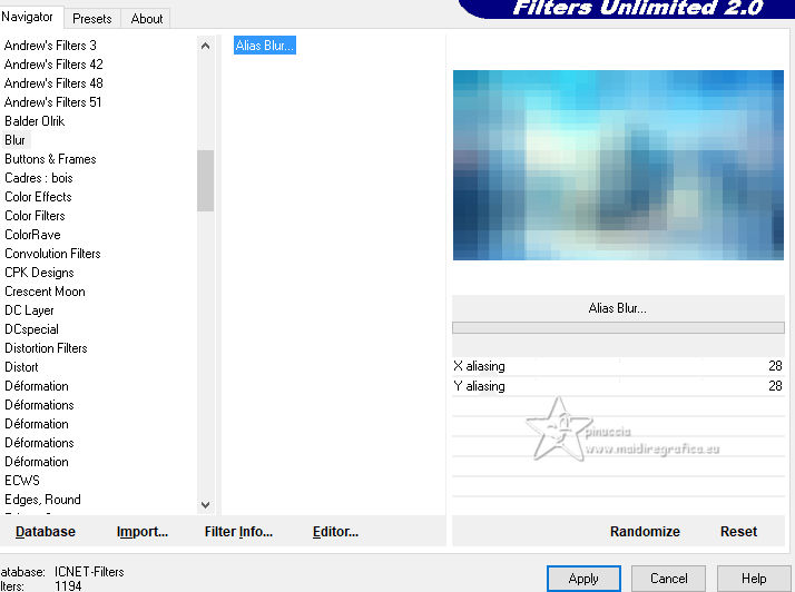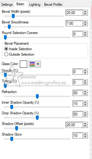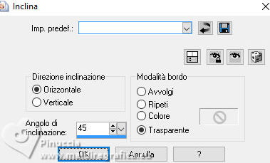 qui puoi trovare qualche risposta ai tuoi dubbi. Se l'argomento che ti interessa non è presente, ti prego di segnalarmelo. Questo tutorial, creato con PSP 2020, è stato tradotto con PSPX9, ma può essere realizzato anche con le altre versioni di PSP. Dalla versione X4, il comando Immagine>Rifletti è stato sostituito con Immagine>Capovolgi in orizzontale, e il comando Immagine>Capovolgi con Immagine>Capovolgi in verticale. Nelle versioni X5 e X6, le funzioni sono state migliorate rendendo disponibile il menu Oggetti. Con la nuova versione X7, sono tornati Rifletti>Capovolgi, ma con nuove varianti. Vedi la scheda sull'argomento qui English Translation qui Le vostre versioni qui![]() Occorrente: ![]() Per i tubes grazie Kamil. Il resto del materiale di Moi-Même Altri tube a tema di Moi-Même li trovi qui (non usare per altri tutorial) (in questa pagina trovi i links ai siti dei creatori del materiale) ![]() se hai problemi con i filtri, consulta la mia sezione filtri qui Filters Unlimited 2.0 qui Blur - Alias Blur (da importare in Unlimited) qui Alien Skin Eye Candy 5 Impact - Glass qui ![]() non esitare a cambiare modalità di miscelatura e opacità secondo i colori utilizzati. ![]() Se hai problemi con il canale alfa, apri una nuova immagine trasparente 950 x 550 pixels, e usa le selezioni da disco. Imposta il colore di primo piano con il colore bianco #ffffff, e il colore di sfondo con #185495. ![]() 1. Apri Canal_alpha la grâce de l'Hiver Questa immagine, che sarà la base del tuo lavoro non è vuota, ma contiene le selezioni salvate sul canale alfa. Selezione>Seleziona tutto. Apri l'immagine del paesaggio winter-house ![]() Modifica>Copia. Torna al tuo lavoro e vai a Modifica>Incolla nella selezione. Selezione>Deseleziona. 2. Selezione>Carica/Salva selezione>Carica selezione da disco. La selezione sélection 1 è subito disponibile. Devi soltanto cliccare Carica. ![]() Selezione>Innalza selezione a livello. Selezione>Deseleziona. 3. Attiva il livello di sfondo, Raster 1. Selezione>Carica/Salva selezione>Carica selezione da canale alfa. Apri il menu delle selezioni a carica la selezione sélection 2 ![]() Selezione>Innalza selezione a livello. Livelli>Disponi>Sposta su. Effetti>Plugins>Alien Skin Eye Candy 5 Impact - Glass. ![]() Selezione>Deseleziona. Effetti>Effetti 3D>Sfalsa ombra, colore bianco, ombra su nuovo livello selezionato. ![]() Cambia la modalità di miscelatura del livello dell'ombra in Dissolvi. 4. Attiva il livello di sfondo, Raster 1. Regola>Sfocatura>Sfocatura gaussiana - raggio 30. ![]() Effetti>Plugins>Filters Unlimited 2.0 - Blur - Alias Blur ![]() Effetti>Effetti geometrici>Inclina. ![]() Regola>Messa a fuoco>Metti a fuoco. 5. Attiva il livello superiore. Apri déco 1 ![]() Cancella il watermark e vai a Modifica>Copia. Torna al tuo lavoro e vai a Modifica>Incolla come nuovo livello. Tasto K per attivare lo strumento Puntatore ![]() Posizione X: -1,00 - Posizione Y: 5,00. ![]() Tasto M per deselezionare lo strumento. 6. Apri déco flocons 1 ![]() Cancella il watermark e vai a Modifica>Copia. Torna al tuo lavoro e vai a Modifica>Incolla come nuovo livello. Apri déco flocons 2 ![]() Cancella il watermark e vai a Modifica>Copia. Torna al tuo lavoro e vai a Modifica>Incolla come nuovo livello. 7. Immagine>Aggiungi bordatura, 1 pixel, simmetriche, colore di sfondo. Immagine>Aggiungi bordatura, 5 pixels, simmetriche, colore bianco. Immagine>Aggiungi bordatura, 1 pixel, simmetriche, colore di sfondo. Immagine>Aggiungi bordatura, 10 pixels, simmetriche, colore bianco. Immagine>Aggiungi bordatura, 1 pixel, simmetriche, colore di sfondo. 8. Selezione>Seleziona tutto. Immagine>Aggiungi bordatura, 30 pixels, simmetriche, colore bianco. Effetti>Effetti di immagine>Motivo unico, con i settaggi standard. ![]() Selezione>Inverti. Regola>Sfocatura>Sfocatura gaussiana - raggio 30. ![]() Selezione>Inverti. Effetti>Effetti 3D>Sfalsa ombra, colore nero, ombra su nuovo livello non selezionato. ![]() Selezione>Inverti. Regola>Aggiungi/Rimuovi disturbo>Aggiungi disturbo. ![]() Selezione>Deseleziona. 9. Apri déco titre ![]() Cancella il watermark e vai a Modifica>Copia. Torna al tuo lavoro e vai a Modifica>Incolla come nuovo livello. Cambia la modalità di miscelatura di questo livello in Luminanza (esistente). 10. Apri il tube del personaggio Femme_La grâce de l'Hiver_AigenMM ![]() Cancella il watermark e vai a Modifica>Copia. Torna al tuo lavoro e vai a Modifica>Incolla come nuovo livello. Immagine>Ridimensiona, al 60%, tutti i livelli non selezionato. Tasto K per attivare lo strumento Puntatore ![]() Posizione X: 358,00 - Posizione Y: 33,00. ![]() (adatta al tube) Tasto M per deselezionare lo strumento. Effetti>Effetti 3D>Sfalsa ombra, colore nero (o colore a scelta). ![]() 11. Firma il tuo lavoro. 12. Immagine>Aggiungi bordatura, 1 pixel, simmetriche, colore di sfondo. Immagine>Ridimensiona, 950 pixels di larghezza, tutti i livelli selezionato. Regola>Messa a fuoco>Maschera di contrasto - Diffuso ![]() Salva in formato jpg. Versione con miei tubes da immagini di Pinterest. ![]() ![]() Puoi scrivermi se hai problemi o dubbi, o trovi un link che non funziona, o soltanto per un saluto. |