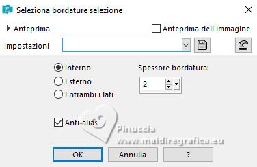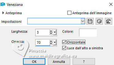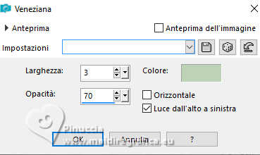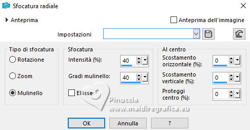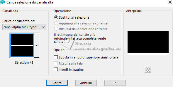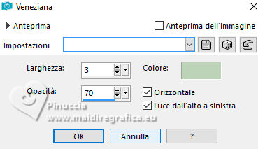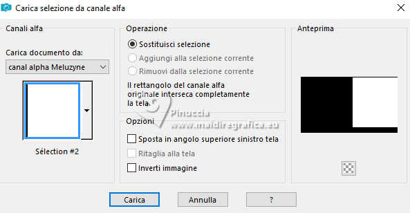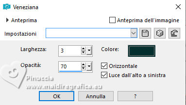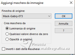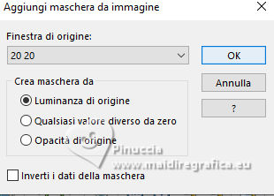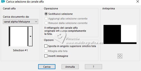 qui puoi trovare qualche risposta ai tuoi dubbi. Se l'argomento che ti interessa non è presente, ti prego di segnalarmelo. Questo tutorial, creato con PSP 2020, è stato tradotto con PSPX9, ma può essere realizzato anche con le altre versioni di PSP. Dalla versione X4, il comando Immagine>Rifletti è stato sostituito con Immagine>Capovolgi in orizzontale, e il comando Immagine>Capovolgi con Immagine>Capovolgi in verticale. Nelle versioni X5 e X6, le funzioni sono state migliorate rendendo disponibile il menu Oggetti. Con la nuova versione X7, sono tornati Rifletti>Capovolgi, ma con nuove varianti. Vedi la scheda sull'argomento qui English Translation qui Le vostre versioni qui![]() Occorrente: ![]() Per i tubes grazie Kamil. Il resto del materiale di Moi-Même (non usare per altri tutorial) (in questa pagina trovi i links ai siti dei creatori del materiale) ![]() se hai problemi con i filtri, consulta la mia sezione filtri qui Filters Unlimited 2.0 qui Filter Factory Gallery A, Kaleidoscope II qui Mehdi - Sorting Tiles qui Graphics Plus - Emboss qui Alien Skin Eye Candy 5 Impact - Glass qui AP [Lines] - Lines SilverLining qui Mura's Meister - Perspective Tiling qui I filtri Factory Gallery e Graphics Plus si possono usare da soli o importati in Filters Unlimited (come fare vedi qui) Se un filtro fornito appare con questa icona ![]() non esitare a cambiare modalità di miscelatura e opacità secondo i colori utilizzati. ![]() Apri le maschere e minimizzale con il resto del materiale. Se hai problemi con il canale alfa, apri una nuova immagine trasparente 950 x 550 pixels, e usa le selezioni da disco. Imposta il colore di primo piano con #bcd3b7, e il colore di sfondo con il colore #08312f. ![]() 1. Apri Canal_alpha Meluzyne Questa immagine, che sarà la base del tuo lavoro non è vuota, ma contiene le selezioni salvate sul canale alfa. Selezione>Seleziona tutto. Apri l'immagine KamilTube-4975-BG ![]() Modifica>Copia. Torna al tuo lavoro e vai a Modifica>Incolla nella selezione. Selezione>Deseleziona. 2. Regola>Sfocatura>Sfocatura radiale. ![]() Effetti>Effetti di bordo>Aumenta di più. Effetti>Plugins>Filters Unlimited 2.0 - Filter Factory Gallery A - Kaleidoscope II. ![]() Effetti>Plugins>Mehdi - Sorting Tiles. ![]() 3. Selezione>Carica/Salva selezione>Carica selezione da disco. La selezione sélection 1 è subito disponibile. Devi soltanto cliccare Carica. ![]() Selezione>Innalza selezione a livello. Livelli>Nuovo livello raster. Modifica>Incolla nella selezione - il paesaggio è ancora in memoria). Mantieni selezionato. 4. Livelli>Nuovo livello maschera>Da immagine. Apri il menu sotto la finestra di origine e vedrai la lista dei files aperti. Seleziona la maschera 20-20 ![]() Livelli>Duplica. Livelli>Unisci>Unisci gruppo. Effetti>Plugins>Graphics Plus - Emboss, con i settaggi standard. ![]() Mantieni ancora selezionato. 5. Attiva il livello sottostante. Selezione>Modifica>Seleziona bordature selezione. ![]() Selezione>Innalza selezione a livello. Livelli>Disponi>Porta in alto. Effetti>Effetti di trama>Veneziana - colore bianco. ![]() Selezione>Deseleziona. 6. Selezione>Carica/Salva selezione>Carica selezione da canale alfa. Apri il menu delle selezioni a carica la selezione sélection 2 ![]() Abbassa l'opacità dello strumento Riempimento al 20%. Riempi la selezione con il colore di primo piano.Effetti>Effetti di trama>Veneziana - colore sfondo. ![]() Riporta l'opacità dello strumento riempimento a 100. Mantieni selezionato. 7. Attiva il livello sottostante. Selezione>Modifica>Seleziona bordature selezione. ![]() Riempi la selezione con il colore di sfondo.Cambia la modalità di miscelatura di questo livello in Sovrapponi. Selezione>Deseleziona. 8. Livelli>Nuovo livello raster. Riempi il livello con il colore di primo piano.Livelli>Nuovo livello maschera>Da immagine. Apri il menu sotto la finestra di origine, e seleziona la maschera mask-Gabry-073 ![]() Livelli>Duplica. Livelli>Unisci>Unisci gruppo. Cambia la modalità di miscelatura di questo livello in Sovrapponi. Chiudi questo livello. 9. Attiva e chiudi il livello di sfondo. Livelli>Unisci>Unisci visibile. Livelli>Visualizza>Tutto. 10. Attiva il livello di sfondo, Raster 1. Apri il tube déco 1 ![]() Modifica>Copia. Torna al tuo lavoro e vai a Modifica>Incolla come nuovo livello. Minimizza il tube, perchè ti servirà ancora. 11. Attiva il livello Uniti. Livelli>Duplica. Immagine>Ridimensiona, al 60%, tutti i livelli non selezionato. Immagine>Ruota per gradi - 45 gradi a destra ![]() Tasto K per attivare lo strumento Puntatore ![]() Posizione X: 288,00 - Posizione Y: 0,00. ![]() Tasto M per deselezionare lo strumento. 12. Selezione>Seleziona tutto. Selezione>Mobile. Selezione>Immobilizza. Effetti>Plugins>Alien Skin Eye Candy 5 Impact - Glass Glass color: bianco. ![]() Selezione>Deseleziona. Effetti>Effetti 3D>Sfalsa ombra, colore nero, ombra su nuovo livello selezionato. ![]() 13. Rimani sul livello dell'ombra. Effetti>Piugins>AP [Lines] - Lines Silverining. ![]() 14. Attiva il livello di sfondo, Raster 1. Selezione>Carica/Salva selezione>Carica selezione da canale alfa. Apri il menu delle selezioni a carica la selezione sélection 3 ![]() Selezione>Innalza selezione a livello. Effetti>Plugins>Mura's Meister - Perspective Tiling, con i settaggi standard. ![]() Selezione>Deseleziona. Livelli>Disponi>Sposta su. Effetti>Effetti 3D>Sfalsa ombra, colore nero, ombra su nuovo livello non selezionato. ![]() 15. Attiva il livello superiore. Apri il tube KamilTube-4866 ![]() Cancella il watermark e vai a Modifica>Copia. Torna al tuo lavoro e vai a Modifica>Incolla come nuovo livello. Immagine>Ridimensiona, al 70%, tutti i livelli non selezionato. Sposta il tube in basso a sinistra, (vedi l'esempio finale)Effetti>Effetti 3D>Sfalsa ombra, colore nero. ![]() 16. Apri il tube déco chouettes_tube par MM ![]() Modifica>Copia. Torna al tuo lavoro e vai a Modifica>Incolla come nuovo livello. Tasto K per attivare lo strumento Puntatore ![]() Posi