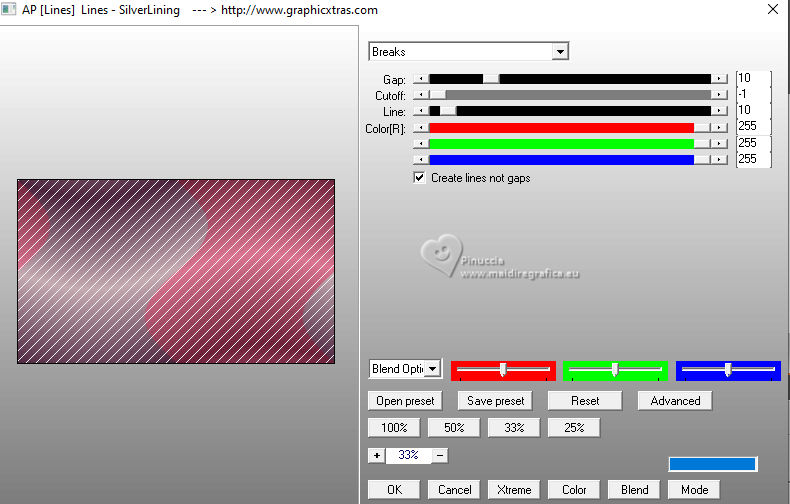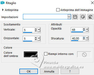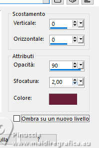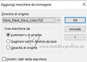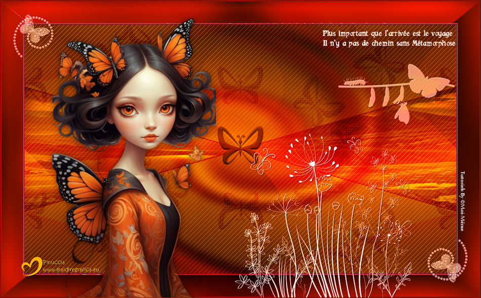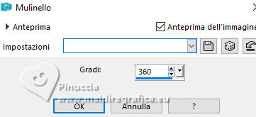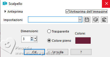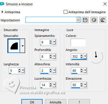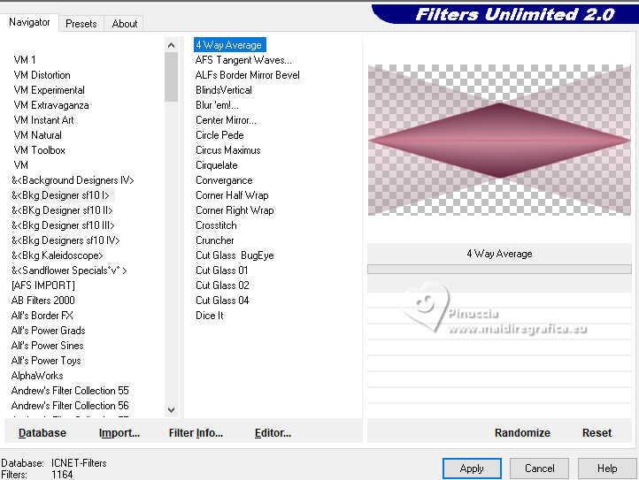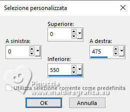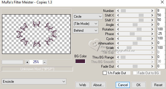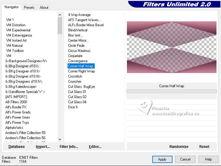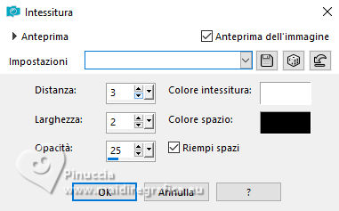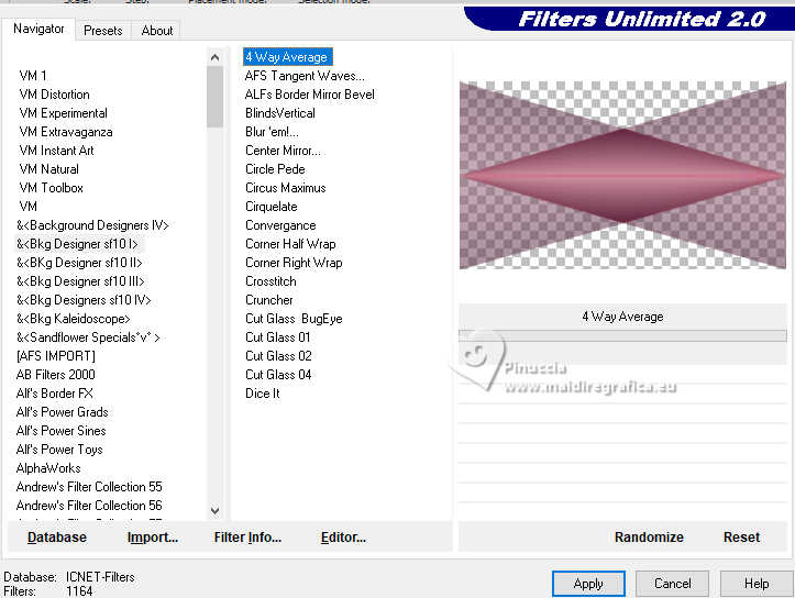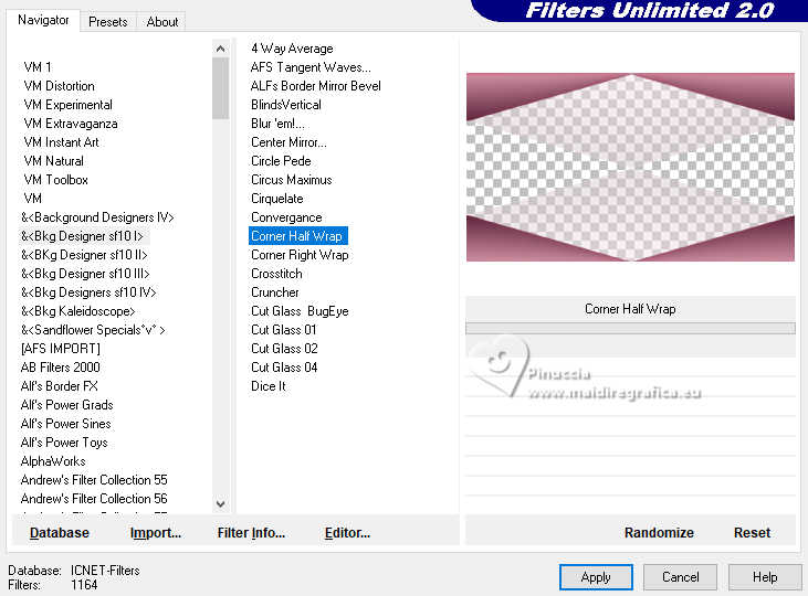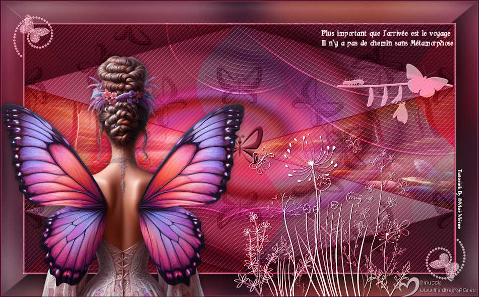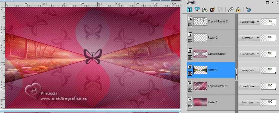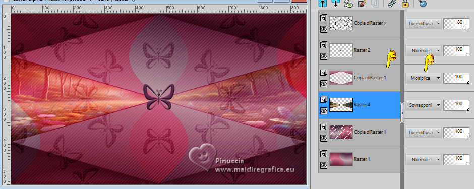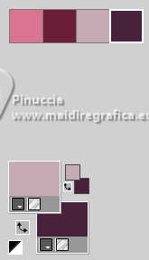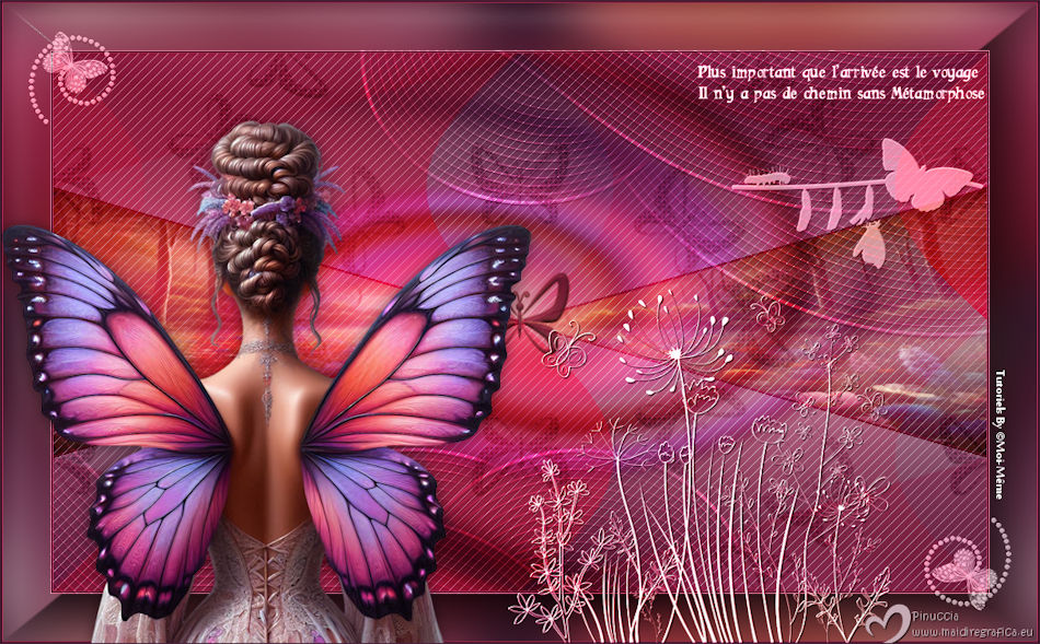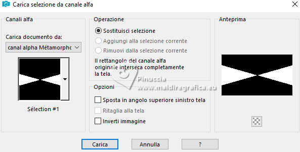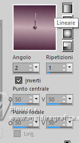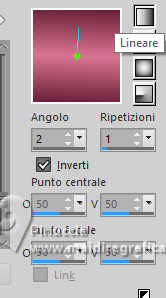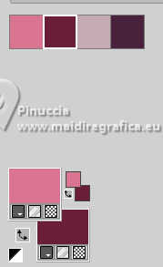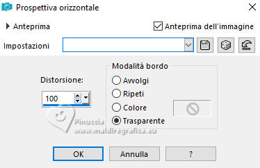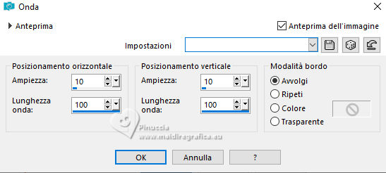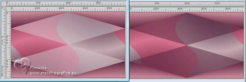 qui puoi trovare qualche risposta ai tuoi dubbi. Se l'argomento che ti interessa non è presente, ti prego di segnalarmelo. Questo tutorial, creato con PSP 2020, è stato tradotto con PSPX9, ma può essere realizzato anche con le altre versioni di PSP. Dalla versione X4, il comando Immagine>Rifletti è stato sostituito con Immagine>Capovolgi in orizzontale, e il comando Immagine>Capovolgi con Immagine>Capovolgi in verticale. Nelle versioni X5 e X6, le funzioni sono state migliorate rendendo disponibile il menu Oggetti. Con la nuova versione X7, sono tornati Rifletti>Capovolgi, ma con nuove varianti. Vedi la scheda sull'argomento qui English Translation qui Le vostre versioni qui![]() Occorrente: ![]() Materiale di Moi-Même Per la maschera grazie Silvie. Altri tube a tema qui (non usare per altri tutorial) (in questa pagina trovi i links ai siti dei creatori del materiale) ![]() se hai problemi con i filtri, consulta la mia sezione filtri qui Filters Unlimited 2.0 qui &<Bkg Designer sf10I> - 4Way Average, Corner Half Wrap (da importare in Unlimited qui AP [Lines] - Lines SilverLining qui Mura's Meister - Copies qui ![]() non esitare a cambiare modalità di miscelatura e opacità secondo i colori utilizzati. Nelle ultime versioni di PSP non c'è il gradiente di primo piano/sfondo (Corel_06_029) Puoi usare i gradienti delle versioni precedenti. Trovi qui i gradienti Corel X. ![]() Un pennello, per funzionare deve essere composto da due file: il file BrushTip e l'omonimo file con estensione Corel PSP brush Vedi i miei appunti sui pennelli qui Perchè il pennello funzioni, entrambi i files devono essere copiati nella cartella Pennelli. Il pennello fornito BrushTip_papillon mariposaMM non funziona, perché è orfano del secondo files e usandolo vedrai soltanto un cerchio nero. Puoi usare i due files che ho aggiunto in una cartella pennello-brush complet, da mettere nella cartella Pennelli, o copia/incolla come nuovo livello il file in png BrushTip papillon mariposaMM Apri la maschera in PSP e minimizzala con il resto del materiale. Se hai problemi con il canale alfa, apri una nuova immagine trasparente 950 x 550 pixels, e usa la selezione da disco. Paletta colori ![]() Imposta il colore di primo piano con il colore 1 #d97591, e il colore di sfondo con il colore 2 #6a2037. ![]() colore 3 #c5abb2 colore 4 #4a223c colore supplementare: Bianco Passa il colore di primo piano a Gradiente di primo piano/sfondo, stile Lineare. ![]() 1. Apri Canal_alpha_ Métamorphose Questa immagine, che sarà la base del tuo lavoro non è vuota, ma contiene una selezione salvata sul canale alfa. Attiva lo strumento Selezione ![]() (non importa il tipo di selezione impostato, perchè con la selezione personalizzata si ottiene sempre un rettangolo) clicca sull'icona Selezione personalizzata ![]() e imposta i seguenti settaggi. ![]() Riempi la selezione con il gradiente.Mantieni selezionato. 2. Selezione>Inverti. Imposta il colore di primo piano con il colore 3 #c5abb2 e il colore di sfondo con il colore 4 #4a223c ![]() Mantieni il gradiente con i settaggi precedenti ![]() Riempi la selezione con il gradiente.Selezione>Deseleziona. 3. Effetti>Effetti di distorsione>Onda. ![]() Livelli>Duplica. Effetti>Effetti geometrici>Prospettiva orizzontale. ![]() Effetti>Plugins>Filters Unlimited 2.0 - &<Bkg Designer sf10I> - 4 Way Average. ![]() Effetti>Plugins>Filters Unlimited 2.0 - &<Bkg Designer sf10I> - Corner Half Wrap. ![]() **** Nota. La versione di Unlimited usata nel tutorial originale è la 2.0.3. Con alcuni filtri può dare dei risultati differenti dalla versione 2.0. Per questa traduzione ho usato la versione 2.0; per la traduzione inglese la 2.0.3. Traduzione inglese Effetti>Plugins>Filters Unlimited 2.0 - &<Bkg Designer sf10I> - 4 Way Average. ![]() Effetti>Plugins>Filters Unlimited 2.0 - &<Bkg Designer sf10I> - Corner Half Wrap. ![]() Sotto il risultato delle due versioni: a sinistra 2.0 - a destra 2.0.3. ![]() In fondo al tutorial il risultato con Unlimited 2.0. **** 4. Attiva il livello di sfondo. Livelli>Duplica. Immagine>Rifletti>Rifletti orizzontalmente. Cambia la modalità di miscelatura di questo livello in Luce diffusa. Effetti>Plugins>AP [Lines] - Lines SilverLining. ![]() 5. Attiva il livello superiore. Livelli>Nuovo livello raster. se necessario, il pennello in png si trova nel materiale Attiva lo strumento Pennello ![]() cerca e seleziona il pennello pennello tutorial Metamorphose, dimensioni 100. ![]() Applica il pennello cliccando con il tasto destro del mouse per usare il colore 4 di sfondo #4a223c. Tasto K per attivare lo strumento Puntatore ![]() Posizione X: 424,00 - Posizione Y: 230,00. ![]() Tasto M per deselezionare lo strumento. 6. Livelli>Duplica. Effetti>Plugins>Mura's Meister - Copies. ![]() Cambia la modalità di miscelatura di questo livello in Luce diffusa, e abbassa l'opacità all'80%. Effetti>Effetti di trama>Intessitura colore intessitura: bianco colore spazio: nero ![]() Effetti>Effetti 3D>Smusso a incasso. ![]() Effetti>Effetti di immagine>Motivo unico, con i settaggi standard. ![]() 7. Attiva il livello sottostante. Effetti>Effetti 3D>Smusso a incasso, con i settaggi precedenti. Effetti>Effetti 3D>Sfalsa ombra, colore 2 #6a2037. ![]() Tasto K per attivare lo strumento Puntatore ![]() Posizione X: 423,00 - Posizione Y: 224,00. ![]() ![]() Tasto M per deselezionare lo strumento. 8. Attiva il livello Copia di Raster 1. Livelli>Nuovo livello raster. Selezione>Carica/Salva selezione>Carica selezione da canale alfa. La selezione Sélection #1 è subito disponibile. Devi soltanto cliccare Carica. ![]() Apri l'immagine Paysage Mariposa 1_AigenMM ![]() Modifica>Copia. Torna al tuo lavoro e vai a Modifica>Incolla nella selezione. Cambia la modalità di miscelatura di questo livello in Sovrapponi (o altro, secondo i tuoi colori). Mantieni selezionato. 9. Livelli>Nuovo livello raster. Effetti>Effetti 3D>Ritaglio - colore nero. ![]() Livelli>Nuovo livello raster. Effetti>Effetti 3D>Scalpello - 