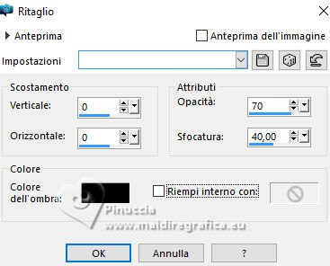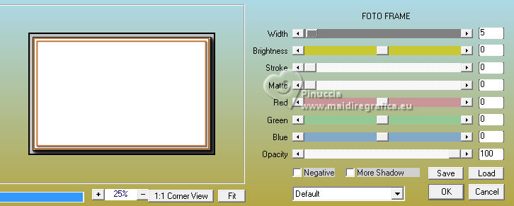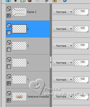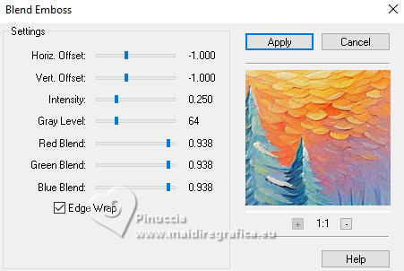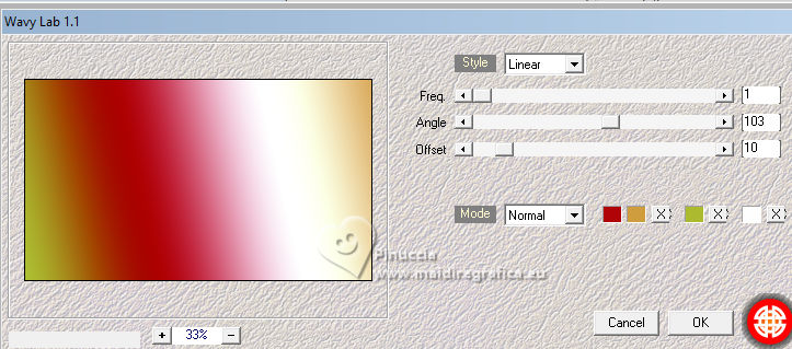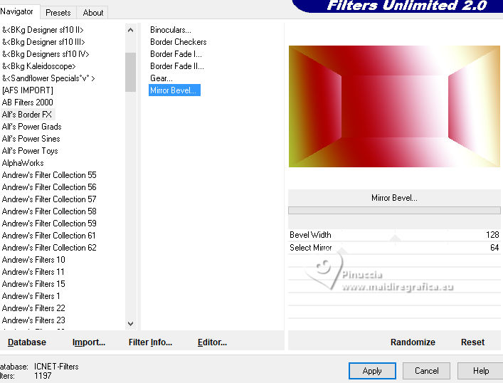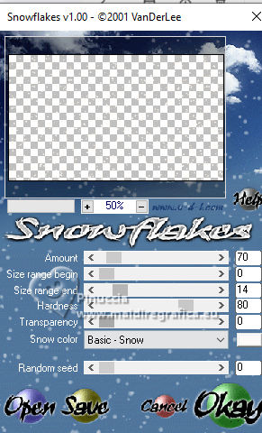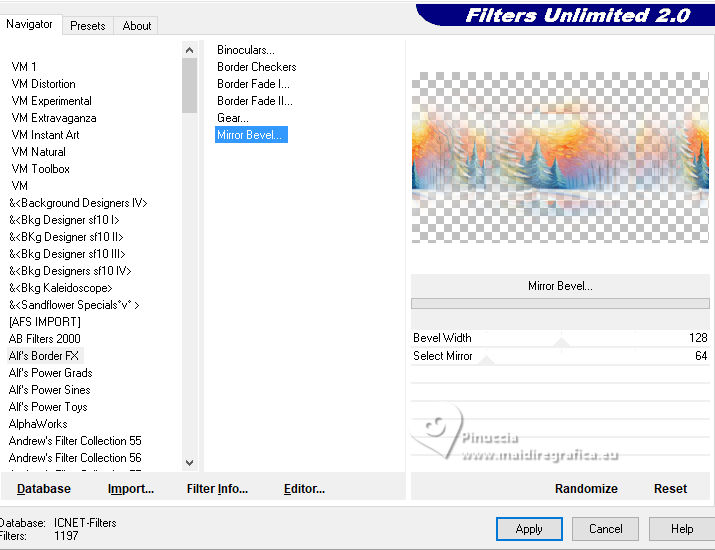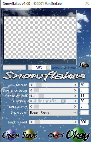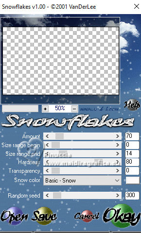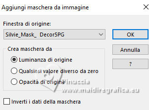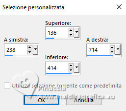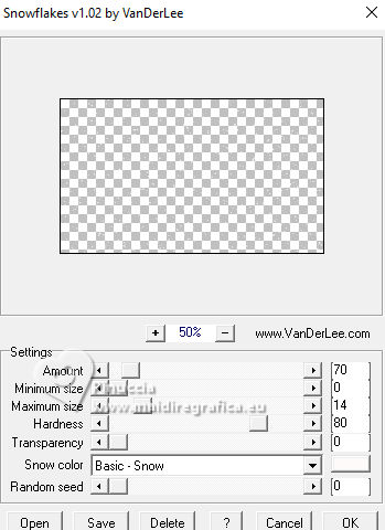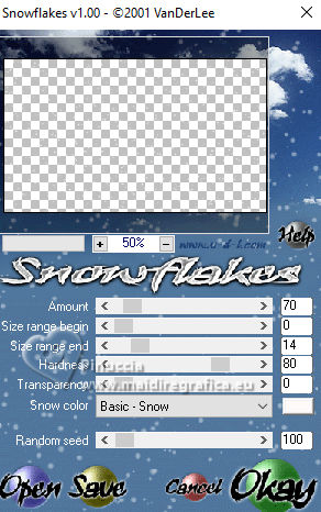 qui puoi trovare qualche risposta ai tuoi dubbi. Se l'argomento che ti interessa non è presente, ti prego di segnalarmelo. Questo tutorial, creato con PSP 2020, è stato tradotto con PSPX9, ma può essere realizzato anche con le altre versioni di PSP. Dalla versione X4, il comando Immagine>Rifletti è stato sostituito con Immagine>Capovolgi in orizzontale, e il comando Immagine>Capovolgi con Immagine>Capovolgi in verticale. Nelle versioni X5 e X6, le funzioni sono state migliorate rendendo disponibile il menu Oggetti. Con la nuova versione X7, sono tornati Rifletti>Capovolgi, ma con nuove varianti. Vedi la scheda sull'argomento qui English Translation qui Le vostre versioni qui![]() Occorrente: ![]() Per la maschera grazie Silvie. Il resto del materiale di Moi-Même Altri tube a tema di Moi-Même li trovi qui qui e qui (non usare per altri tutorial) (in questa pagina trovi i links ai siti dei creatori del materiale) ![]() se hai problemi con i filtri, consulta la mia sezione filtri qui Filters Unlimited 2.0 qui Mehdi - Wavy Lab 1.1. qui Alf's Border FX - Mirror Bevel qui FM Tile Tools - Blend Emboss qui VDL Adrenaline - Snowflakes qui I filtri Alf's Border FX si possono usare da soli o importati in Filters Unlimited (come fare vedi qui) Se un filtro fornito appare con questa icona Animation Shop qui ![]() non esitare a cambiare modalità di miscelatura e opacità secondo i colori utilizzati. ![]() Apri la maschera in PSP e minimizzala con il resto del materiale. Colori ![]() Imposta il colore di primo piano con #cf9d3e, e il colore di sfondo con #af0307. ![]() colore 3: #abba30 colore 4: #ffffff. 1. Apri una nuova immagine trasparente 950 x 550 pixels. Effetti>Plugins>Mehdi - Wavy Lab 1.1. Questo filtro crea gradienti con i colori della paletta: il primo è il colore di sfondo, il secondo quello di primo piano. Cambia gli ultimi due colori creati dal filtro: il terzo con il colore 3 #abba30 e il quarto con il colore 4 #ffffff. ![]() Effetti>Plugins>Filters Unlimited 2.0 - Alf's Border FX - Mirror Bevel, con i settaggi standard. ![]() Effetti>Effetti di bordo>Aumenta. 2. Imposta il colore di primo piano con il colore bianco. Livelli>Nuovo livello raster. Riempi il livello con il colore bianco.Livelli>Nuovo livello maschera>Da immagine. Apri il menu sotto la finestra di origine e vedrai la lista dei files aperti. sEleziona la maschera Silvie_Mask_DecorSPG.jpg ![]() Livelli>Unisci>Unisci gruppo. Cambia la modalità di miscelatura di questo livello in Sovrapponi. 3. Apri déco 1 ![]() Modifica>Copia. Torna al tuo lavoro e vai a Modifica>Incolla come nuovo livello. 4. Attiva il livello sottostante. Livelli>Nuovo livello raster. Selezione>Seleziona tutto. Apri il tube misted paysage AI_generated_Par MM ![]() Cancella il watermark e vai a Modifica>Copia. Torna al tuo lavoro e vai a Modifica>Incolla nella selezione. Selezione>Deseleziona. Effetti>Effetti di immagine>Motivo unico, Fianco a fianco ![]() Effetti>Plugins>Filters Unlimited 2.0 - Alf's Border FX - Mirror Bevel, con i settaggi standard. ![]() 5. Attiva lo strumento Selezione ![]() (non importa il tipo di selezione impostato, perchè con la selezione personalizzata si ottiene sempre un rettangolo) clicca sull'icona Selezione personalizzata ![]() e imposta i seguenti settaggi. ![]() Selezione>Innalza selezione a livello. (se preferisci, puoi aggiungere un livello e incollare il paesaggio nella selezione) Effetti>Plugins>FM Tile Tools - Blend Emboss, con i settaggi standard. ![]() Mantieni selezionato. 6. Livelli>Nuovo livello raster. Effetti>Plugins>VDL Adrenaline - Snowflakes se stai usando la versione più recente del filtro (il risultato non cambia): Effetti>Plugins>VanDerLee - Snowflakes ![]() ![]() Rinomina questo livello: 1 ![]() Se hai intenzione di realizzare l'animazione: Livelli>Nuovo livello raster e approfitta della finestra che si apre, per rinominare il livello 2 ![]() Effetti>Plugins>VDL Adrenaline - Snowflakes, con i settaggi precedenti, ma Random Seed 100 Chiudi questo livello Livelli>Nuovo livello raster e rinomina il livello 3 Effetti>Plugins>VDL Adrenaline - Snowflakes - Random Seed 200 ![]() Chiudi questo livello Livelli>Nuovo livello raster e rinomina il livello 4 Effetti>Plugins>VDL Adrenaline - Snowflakes - Random Seed 300 Chiudi e rimani su questo livello. ![]() ![]() Livelli>Nuovo livello raster. Effetti>Effetti 3D>Ritaglio - colore nero. ![]() Selezione>Deseleziona. 7. Attiva il livello Selezione innalzata (il quarto livello dal basso) ![]() Apri il tube Renne ![]() Modifica>Copia. Torna al tuo lavoro e vai a Modifica>Incolla come nuovo livello. (si trova al suo posto, al centro dell'immagine). 8. Attiva il livello superiore. Apri pull1AIGen MM ![]() Modifica>Copia. Torna al tuo lavoro e vai a Modifica>Incolla come nuovo livello. Tasto K per attivare lo strumento Puntatore ![]() Posizione X: 634,00 - Posizione Y: 14,00. ![]() Tasto M per deselezionare lo strumento. 9. Nota Nel materiale puoi scegliere tra i seguenti materiali: "Mes décos(11) pulls de noël exclusive à ce tutoriel" "Le mie decorazioni (11) maglioni natalizi esclusivi per questo tutorial." 2 "grucce" se vuoi usare un maglione diverso a tua scelta. Ridimensiona il maglione secondo necessità, regola la sua posizione sul gancio. Aggiusta la nitidezza secondo necessità; l'ombra esterna è applicata di default solo al maglione. Unisci questi due livelli: Posiziona la decorazione nell'angolo in alto a destra, come mostrato nell'esempio finale. ![]() 10. Apri il tube guirlande_MM ![]() Modifica>Copia. Torna al tuo lavoro e vai a Modifica>Incolla come nuovo livello. Tasto K per attivare lo strumento Puntatore ![]() Posizione X: 316,00 - Posizione Y: -2,00. ![]() Tasto M per deselezionare lo strumento. 11. Livelli>Duplica. Attiva il livello sottostante. Regola>Sfocatura>Sfocatura gaussiana - raggio 20. ![]() Cambia la modalità di miscelatura di questo livello in Luminanza (esistente) o altro. 12. Attiva il livello superiore. Apri il tube Bottes noel