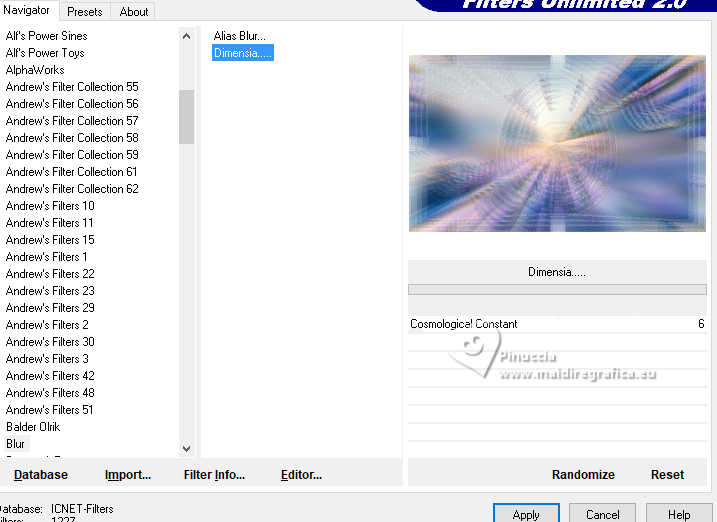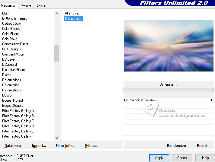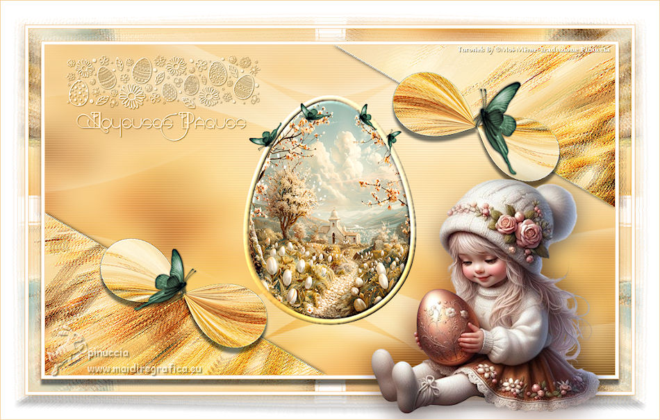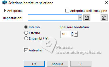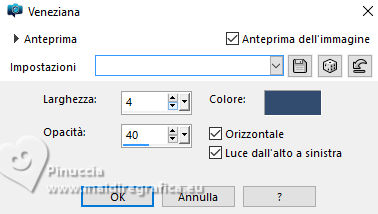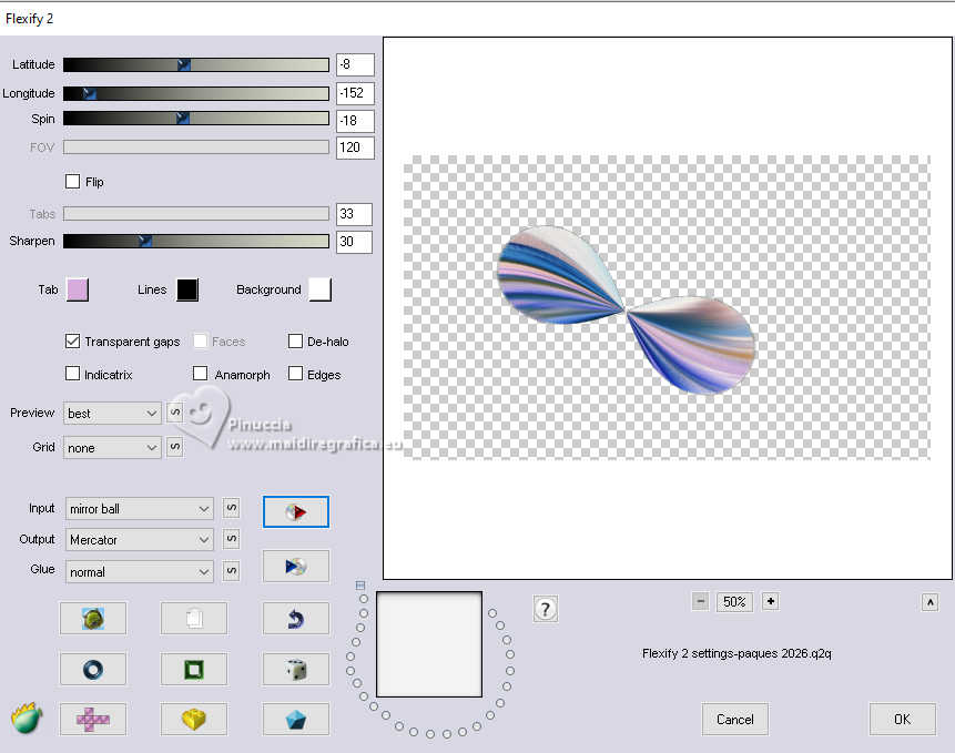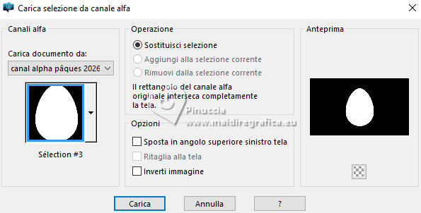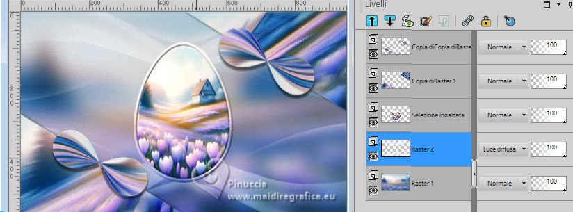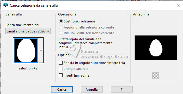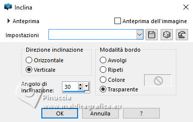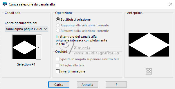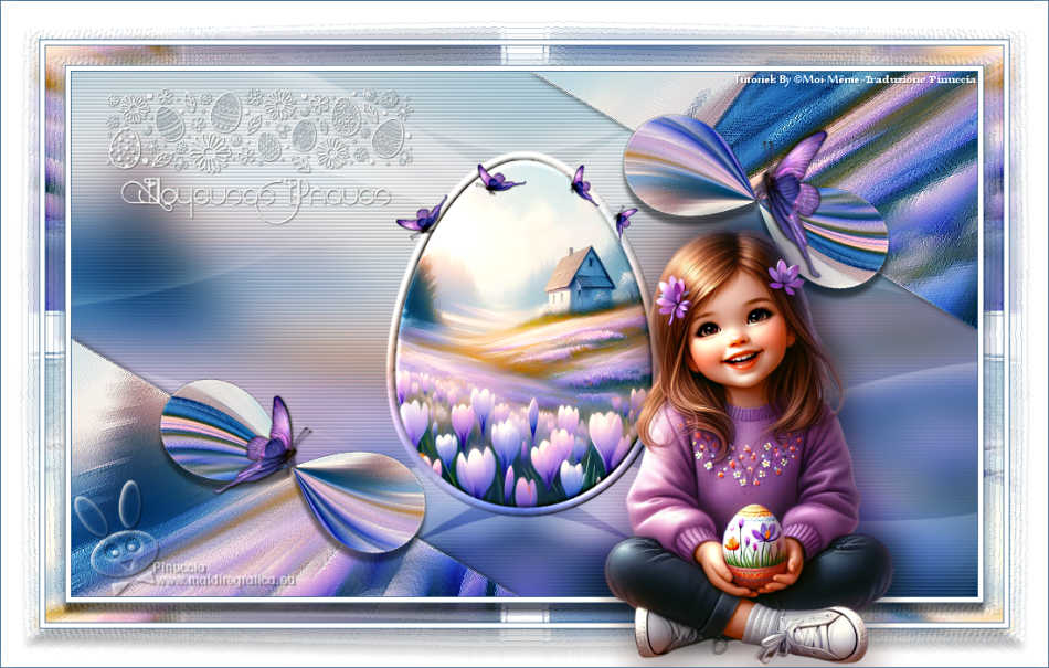 qui puoi trovare qualche risposta ai tuoi dubbi. Se l'argomento che ti interessa non è presente, ti prego di segnalarmelo. Questo tutorial, creato con PSP 2020, è stato tradotto con PSPX9, ma può essere realizzato anche con le altre versioni di PSP. Dalla versione X4, il comando Immagine>Rifletti è stato sostituito con Immagine>Capovolgi in orizzontale, e il comando Immagine>Capovolgi con Immagine>Capovolgi in verticale. Nelle versioni X5 e X6, le funzioni sono state migliorate rendendo disponibile il menu Oggetti. Con la nuova versione X7, sono tornati Rifletti>Capovolgi, ma con nuove varianti. Vedi la scheda sull'argomento qui English Translation qui Le vostre versioni qui![]() Occorrente: ![]() Materiale di Moi-Même altri tubes a tema qui e qui (non usare per altri tutorial) (in questa pagina trovi i links ai siti dei creatori del materiale) ![]() se hai problemi con i filtri, consulta la mia sezione filtri qui Filters Unlimited 2.0 - qui Filters Unlimited 2.3 qui Blur - Dimensia (da importare in Unlimited) qui Flaming Pear - Flexify 2 qui ![]() non esitare a cambiare modalità di miscelatura e opacità secondo i colori utilizzati. ![]() Metti il preset per Flexify in una cartella a scelta. Lo importerai da questa cartella quando ti servirà. Se hai problemi con il canale alfa, apri una nuova immagine trasparente 950 x 550 pixels, e usa le selezioni da disco. Imposta il colore di primo piano con #ffffff, e il colore di sfondo con #537295. ![]() Nota dell'autore: Secondo l'immagine e i colori scelti dal paesaggio, il risultato potrebbe essere un po' differente. Scegli preferibilmente un paesaggio dai toni chiari. 1. Apri Canal Alpha páques26 Questa immagine, che sarà la base del tuo lavoro non è vuota, ma contiene le selezioni salvate sul canale alfa. Riempi l'immagine trasparente con il colore di sfondo.Selezione>Seleziona tutto. 2. Livelli>Nuovo livello raster. Apri l'immagine del paesaggio Paysage Pâques 2026-aigenMM ![]() Modifica>Copia. Torna al tuo lavoro e vai a Modifica>Incolla nella selezione. Selezione>Deseleziona. Cambia la modalità di miscelatura di questo livello in Luce netta. Livelli>Unisci>Unisci giù. Regola>Messa a fuoco>Metti a fuoco. Effetti>Plugins>Filters Unlimited 2.0 - Blur - Dimensia, con i settaggi standard. ![]() 3. Livelli>Duplica. Effetti>Effetti geometrici>Inclina. ![]() 4. Selezione>Carica/Salva selezione>Carica selezione da disco. La selezione sélection 1 è subito disponibile. Devi soltanto cliccare Carica. ![]() Premi sulla tastiera il tasto CANC ![]() ![]() Selezione>Deseleziona. Effetti>Effetti di bordo>Aumenta. 5. Livelli>Duplica. *** Nota: Se non riesci a realizzare questo effetto, non duplicare il livello Apri déco flexify ![]() Cancella la firma e vai a Modifica>Copia. Torna al tuo lavoro e vai a Modifica>Incolla come nuovo livello. Colorizza secondo i tuoi colori. Continua dal punto 7 *** Effetti>Plugins>Flaming Pear - Flexify 2 Clicca sul bottone rosso e cerca il preset nella cartella in cui lo hai salvato ![]() ![]() Immagine>Ridimensiona, al 60%, tutti i livelli non selezionato. Tasto K per attivare lo strumento Puntatore ![]() Posizione X: 91,00 - Posizione Y: 321,00. ![]() ![]() Tasto M per deselezionare lo strumento. Regola>Messa a fuoco>Metti a fuoco. 6. Livelli>Duplica. Immagine>Rifletti>Rifletti orizzontalmente. Immagine>Rifletti>Rifletti verticalmente (Immagine>Capovolgi). Livelli>Unisci>Unisci giù. Effetti>Effetti 3D>Sfalsa ombra, colore nero. ![]() 7. Attiva il livello sottostante, Copia di Raster 1. Effetti>Effetti 3D>Sfalsa ombra, colore nero. ![]() 8. Attiva il livello Raster 1. Regola>Sfocatura>Sfocatura gaussiana - raggio 20. ![]() Selezione>Carica/Salva selezione>Carica selezione da disco. Apri il menu delle selezioni e carica la selezione sélection 2 ![]() Selezione>Innalza selezione a livello. Selezione>Modifica>Seleziona bordature selezione. ![]() Effetti>Effetti 3D>Smusso a incasso. ![]() Selezione>Deseleziona. 9. Selezione>Carica/Salva selezione>Carica selezione da disco. Apri il menu delle selezioni e carica la selezione sélection 3 ![]() Modifica>Incolla nella selezione - il paesaggio è ancora in memoria. ![]() Regola>Messa a fuoco>Metti a fuoco. Effetti>Effetti 3D>Smusso a incasso, con i settaggi precedenti. ![]() Selezione>Deseleziona. 10. Attiva il livello Raster 1. Effetti>Effetti di trama>Veneziana - colore di sfondo. ![]() 11. Apri déco 1 MM ![]() Modifica>Copia. Torna al tuo lavoro e vai a Modifica>Incolla come nuovo livello. Cambia la modalità di miscelatura di questo livello in Luce diffusa. ![]() 12. Attiva il livello superiore. Apri déco papillons ![]() Cancella il watermark e vai a Modifica>Copia. Torna al tuo lavoro e vai a Modifica>Incolla come nuovo livello. Tasto K per attivare lo strumento Puntatore ![]() Posizione X: 146,00 - Posizione Y: 58,00. ![]() (puoi colorizzare secondo i tuoi colori) 13. Apri déco et titre ![]() Modifica>Copia. Torna al tuo lavoro e vai a Modifica>Incolla come nuovo livello. Posizione X: 34,00 - Posizione Y: 15,00. ![]() Tasto M per deselezionare lo strumento. 14. Immagine>Aggiungi bordatura, 1 pixel, simmetriche, colore di sfondo. Immagine>Aggiungi bordautra, 5 pixels, simmetriche, colore bianco. Immagine>Aggiungi bordatura, 1 pixel, simmetriche, colore di sfondo. Selezione>Seleziona tutto. 15. Immagine>Aggiungi bordatura, 20 pixels, simmetriche, colore bianco. Effetti>Effetti di immagine>Motivo unico, con i settaggi standard. ![]() Selezione>Inverti. Effetti>Plugins>Filters Unlimited 2.0 - Blur - Dimensia, con i settaggi standard. ![]() Regola>Messa a fuoco>Metti a fuoco. Selezione>Inverti. Effetti>Effetti 3D>Sfalsa ombra, colore nero. ![]() Selezione>Deseleziona. 16. Immagine>Aggiungi bordatura, 1 pixel, simmetriche, colore di sfondo. Immagine>Aggiungi bordautra, 5 pixels, simmetriche, colore bianco. Immagine>Aggiungi bordatura, 1 pixel, simmetriche, colore di sfondo. Selezione>Seleziona tutto. Immagine>Aggiungi bordatura, 40 pixels, simmetriche, colore bi