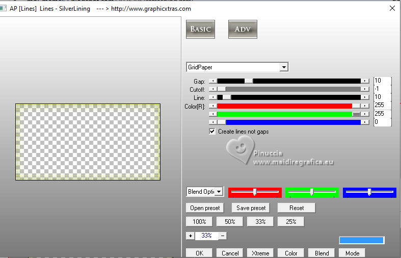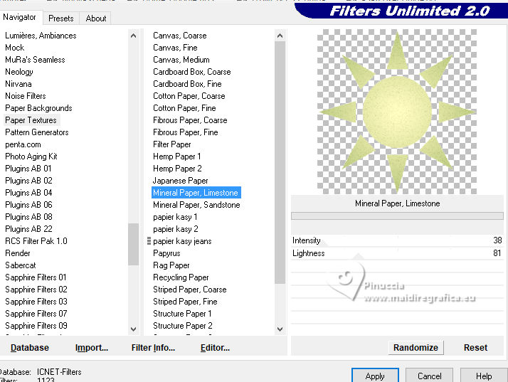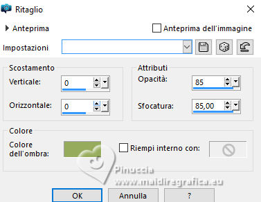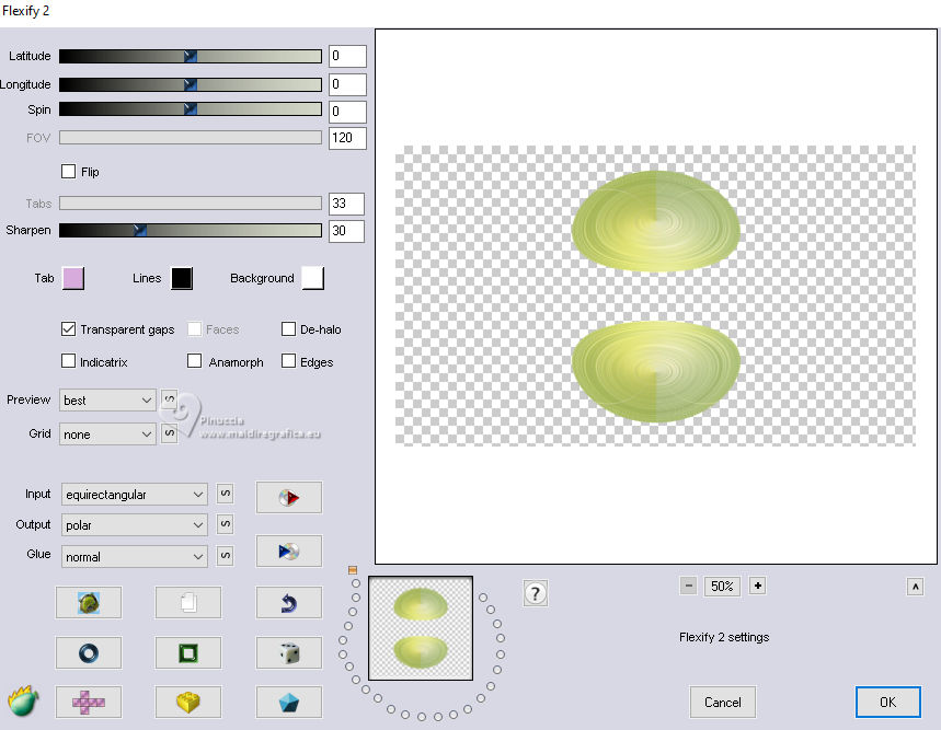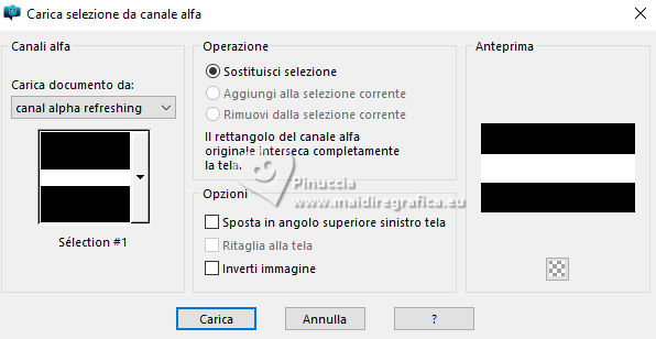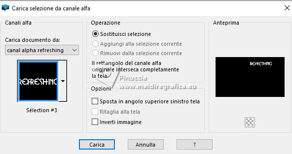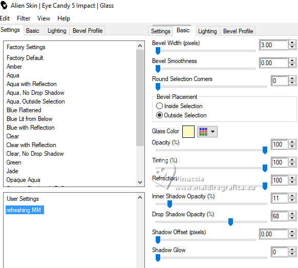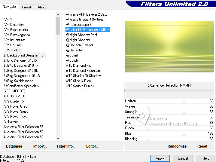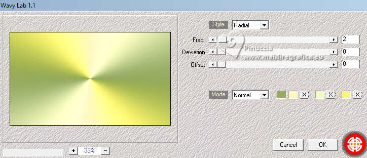 qui puoi trovare qualche risposta ai tuoi dubbi. Se l'argomento che ti interessa non è presente, ti prego di segnalarmelo. Questo tutorial, creato con PSP 2020, è stato tradotto con PSPX9, ma può essere realizzato anche con le altre versioni di PSP. Dalla versione X4, il comando Immagine>Rifletti è stato sostituito con Immagine>Capovolgi in orizzontale, e il comando Immagine>Capovolgi con Immagine>Capovolgi in verticale. Nelle versioni X5 e X6, le funzioni sono state migliorate rendendo disponibile il menu Oggetti. Con la nuova versione X7, sono tornati Rifletti>Capovolgi, ma con nuove varianti. Vedi la scheda sull'argomento qui English Translation qui Le vostre versioni qui![]() Occorrente: ![]() Per un tube grazie Silvie. Il resto del materiale è di Moi-Même Altri tubes sul tema qui (non utilizzare per altri tutorial) (in questa pagina trovi i links ai siti dei creatori del materiale) ![]() se hai problemi con i filtri, consulta la mia sezione filtri qui Filters Unlimited 2.0 qui &< Background Designer IV> - @Lakeside Reflection MMMM (da importare in Unlimited) qui Mehdi - Wavy Lab 1.1 qui Alien Skin Eye Candy 5 Impact - Glass qui Flaming Pear - Flexify 2 qui AP Lines - Lines SilverLining qui FM Tile Tools - Saturation Emboss qui ![]() non esitare a cambiare modalità di miscelatura e opacità secondo i colori utilizzati. Nelle ultime versioni di PSP non c'è il gradiente di primo piano/sfondo (Corel_06_029) Puoi usare i gradienti delle versioni precedenti. Trovi qui i gradienti Corel X. Metti il preset Cliccando sul file una o due volte (a seconda delle tue impostazioni), automaticamente il preset si installerà nella cartella corretta. perchè uno o due clic vedi qui ![]() Se hai problemi con il canale alfa, apri una nuova immagine trasparente 950 x 550 pixels, e usa le selezioni da disco. 1. Imposta il colore di primo piano con #fef9be, e il colore di sfondo con #96ac5c. ![]() colore 3 #fbf675 2. Apri Canal_alpha_refreshing Questa immagine, che sarà la base del tuo lavoro non è vuota, ma contiene le selezioni salvate sul canale alfa. Effetti>Plugins>Mehdi - Wavy Lab 1.1. Questo filtro lavora con i colori della paletta: il primo è il colore di sfondo, il secondo quello di primo piano. Cambia gli ultimi due colori creati dal filtro: il terzo colore con il colore 1 #fef9be, e il quarto con il colore 3 #fbf675 ![]() Regola>Sfocatura>Sfocatura gaussiana - raggio 40. ![]() 2. Selezione>Seleziona tutto. Selezione>Modifica>Contrai - 50 pixels. Effetti>Plugins>Alien Skin Eye Candy 5 Impact - Glass seleziona il preset refreshing MM Basic: se necessario imposta il tuo colore 1 (colore di primo piano). ![]() Selezione>Deseleziona. 3. Livelli>Duplica. Effetti>Plugins>Filters Unlimited 2.0 - &<Background Designer IV> - @Lakeside Reflection MMMM, con i settaggi standard. ![]() 4. Livelli>Duplica. Immagine>Rifletti>Rifletti verticalmente (Immagine>Capovolgi). Abbassa l'opacità di questo livello al 50%. Livelli>Unisci>Unisci giù. 5. Selezione>Carica/Salva selezione>Carica selezione da canale alfa La selezione sélection 1 è subito disponibile. Devi soltanto cliccare Carica. ![]() Premi sulla tastiera il tasto CANC ![]() Selezione>Deseleziona. 6. Livelli>Duplica. Effetti>Plugins>Flaming Pear - Flexify 2. ![]() Regola>Messa a fuoco>Metti a fuoco. 7. Attiva il livello sottostante. Effetti>Plugins>Flaming Pear - Flexify 2. ![]() Regola>Messa a fuoco>Metti a fuoco. Effetti>Plugins>Alien Skin Eye Candy 5 Impact - Glass - preset refreshing MM 8. Attiva nuovamente il livello soprastante. Effetti>Plugins>Alien Skin Eye Candy 5 Impact - Glass - preset refreshing MM Effetti>Effetti 3D>Sfalsa ombra, colore nero. ![]() Rimani su questo livello. 9. Livelli>Unisci>Unisci giù. Immagine>Ridimensiona, al 60%, tutti i livelli non selezionato. Effetti>Effetti 3D>Sfalsa ombra, colore nero. ![]() Tasto K per attivare lo strumento Puntatore ![]() Posizione X: 626,00 - Posizione Y: 211,00. ![]() Tasto M per deselezionare lo strumento. 10. Attiva il livello di sfondo, Raster 1. Apri il misted Paysage-citrus AIgen MM.png ![]() Cancella il watermark e vai a Modifica>Copia. Torna al tuo lavoro e vai a Modifica>Incolla come nuovo livello. Immagine>Ridimensiona, al 60%, tutti i livelli non selezionato. Effetti>Plugins>FM Tile Tools - Saturation Emboss, con i settaggi standard. ![]() Immagine>Rifletti>Rifletti orizzontalmente (dipende dal tuo paesaggio). 11. Livelli>Nuovo livello raster. Selezione>Seleziona tutto. Selezione>Modifica>Contrai - 50 pixels. Effetti>Effetti 3D>Ritaglio, colore di sfondo. ![]() Rimani su questo livello e mantieni selezionato. 12. Effetti>Plugins>AP Lines - Lines SilverLining. ![]() (regola Color (R) secondo il tuo lavoro) Selezione>Deseleziona. Cambia la modalità di miscelatura di questo livello in Moltiplica. 13. Attiva il livello del paesaggio. Livelli>Nuovo livello raster. Selezione>Seleziona tutto. Apri il tube Decor8DX_Silvie ![]() Modifica>Copia. Torna al tuo lavoro e vai a Modifica>Incolla nella selezione. Selezione>Deseleziona. Cambia la modalità di miscelatura di questo livello in Luminanza (esistente), e abbassa l'opacità all'80%. Immagine>Rifletti>Rifletti orizzontalmente (Immagine>Rifletti). 14. Attiva il livello superiore. Apri il tube citronier aigenMM ![]() Modifica>Copia. Torna al tuo lavoro e vai a Modifica>Incolla come nuovo livello. Immagine>Ridimensiona, al 70%, tutti i livelli non selezionato. Tasto K per attivare lo strumento Puntatore ![]() Posizione X: 725,00 - Posizione Y: 326,00. ![]() Tasto M per deselezionare lo strumento. Effetti>Effetti 3D>Sfalsa ombra, con i settaggi precedenti. 15. Passa il colore di primo piano a Gradiente di primo piano/sfondo, stile Sprazzo di luce. ![]() Livelli>Nuovo livello raster. Selezione>Carica/Salva selezione>Carica selezione da canale alfa Apri il menu dele selezioni e carica la selezione sélection 2 ![]() Riempi la selezione con il gradiente.Effetti>Plugins>Filters Unlimited 2.0 - Paper Textures - Mineral Paper,Limestone. ![