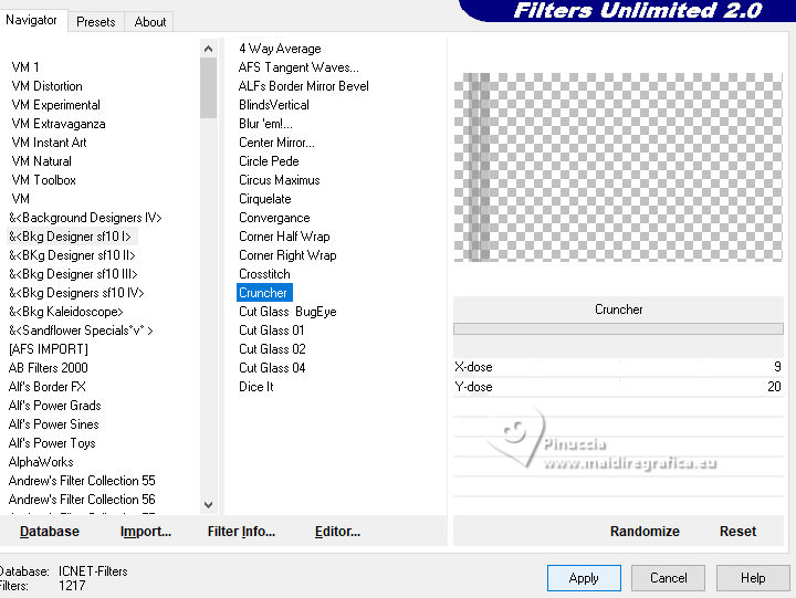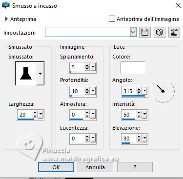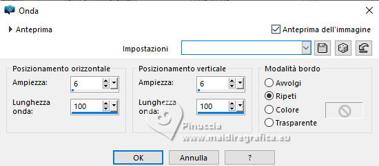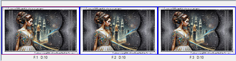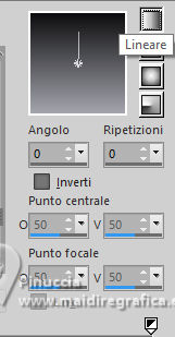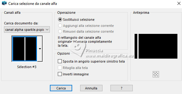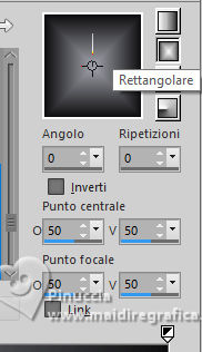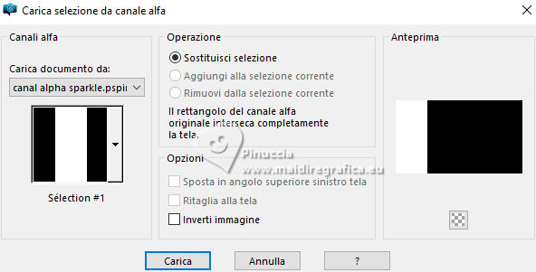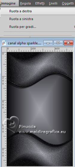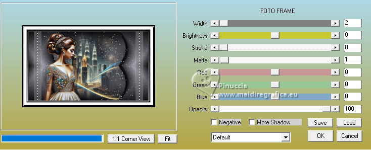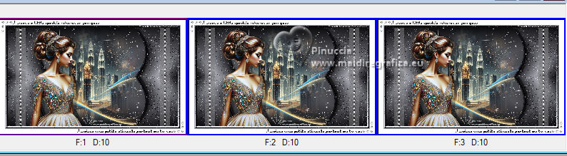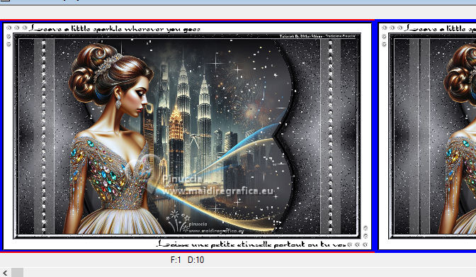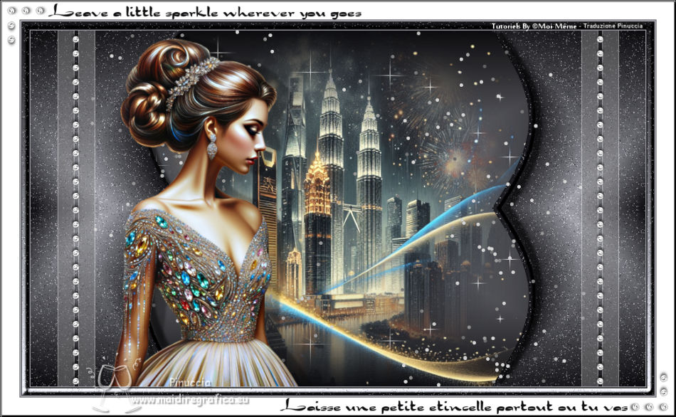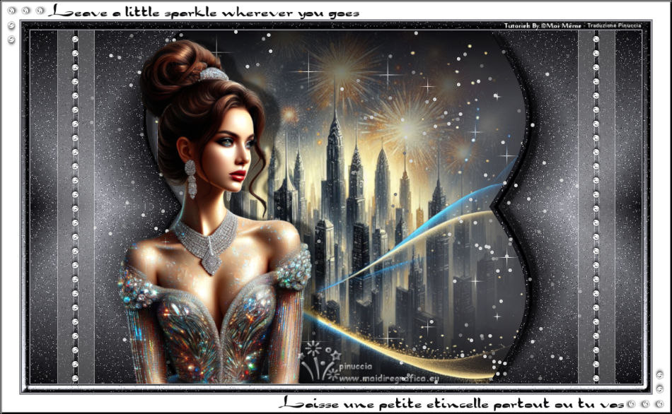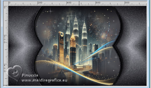 qui puoi trovare qualche risposta ai tuoi dubbi. Se l'argomento che ti interessa non è presente, ti prego di segnalarmelo. Questo tutorial, creato con PSP 2020, è stato tradotto con PSPX9, ma può essere realizzato anche con le altre versioni di PSP. Dalla versione X4, il comando Immagine>Rifletti è stato sostituito con Immagine>Capovolgi in orizzontale, e il comando Immagine>Capovolgi con Immagine>Capovolgi in verticale. Nelle versioni X5 e X6, le funzioni sono state migliorate rendendo disponibile il menu Oggetti. Con la nuova versione X7, sono tornati Rifletti>Capovolgi, ma con nuove varianti. Vedi la scheda sull'argomento qui English Translation qui Le vostre versioni qui![]() Occorrente: ![]() Materiale di Moi-Même (non usare per altri tutorial) Altri tube a tema: personaggi qui e qui (in questa pagina trovi i links ai siti dei creatori del materiale) ![]() se hai problemi con i filtri, consulta la mia sezione filtri qui Filters Unlimited 2.0 qui &<Bkg Designer sf10I> - Cruncher (da importare in Unlimited) qui AAA Frames - Foto Frame qui Animation Shop qui ![]() non esitare a cambiare modalità di miscelatura e opacità secondo i colori utilizzati. Nelle ultime versioni di PSP non c'è il gradiente di primo piano/sfondo (Corel_06_029) Puoi usare i gradienti delle versioni precedenti. Trovi qui i gradienti Corel X. ![]() Se hai problemi con il canale alfa, apri una nuova immagine trasparente 950 x 550 pixels, e usa le selezioni da disco. Imposta il colore di primo piano con #a3a4ac, e il colore di sfondo con #0e0e10. ![]() Colore 3 bianco #ffffff Passa il colore di primo piano a Gradiente di primo piano/sfondo, stile Rettangolare. ![]() 1. Apri Canal_alpha sparkle Questa immagine, che sarà la base del tuo lavoro non è vuota, ma contiene le selezioni salvate sul canale alfa. Riempi l'immagine trasparente con il gradiente.2. Livelli>Nuovo livello raster. Selezione>Carica/Salva selezione>Carica selezione da disco. La selezione sélection 1 è subito disponibile. Devi soltanto cliccare Carica. ![]() Riempi la selezione con il gradiente.Selezione>Deseleziona. 3. Effetti>Effetti di distorsione>Onda. ![]() Livelli>Duplica. Immagine>Rifletti>Rifletti orizzontalmente. Livelli>Unisci>Unisci giù. Regola>Aggiungi/Rimuovi disturbo>Aggiungi disturbo. ![]() 4. Selezione>Carica/Salva selezione>Carica selezione da canale alfa. Apri il menu delle selezioni a carica la selezione sélection 2 ![]() Selezione>Innalza selezione a livello. Effetti>Effetti 3D>Smusso a incasso. ![]() Effetti>Effetti 3D>Sfalsa ombra, con i settaggi standard. ![]() Selezione>Deseleziona. Livelli>Unisci>Unisci giù. 4. Immagine>Ruota a destra ![]() Effetti>Effetti di riflesso>Specchio rotante, con i settaggi standard. ![]() Immagine>Ruota a sinistra. ![]() 5. Attiva il livello di sfondo, Raster 1. Apri sparkle ![]() Modifica>Copia. Torna al tuo lavoro e vai a Modifica>Incolla come nuovo livello. 6. Apri il tube Feu d'artifice sur la ville_AIgen MM ![]() Cancella la firma e vai a Modifica>Copia. Torna al tuo lavoro e vai a Modifica>Incolla come nuovo livello. Immagine>Ridimensiona, al 63%, tutti i livelli non selezionato. Regola>Messa a fuoco>Metti a fuoco. 7. Apri il tube Glitteer_Decor779_Silvie_25.08.2025 ![]() Modifica>Copia. Torna al tuo lavoro e vai a Modifica>Incolla come nuovo livello. Immagine>Ridimensiona, al 90%, tutti i livelli non selezionato. Non spostarlo ![]() (puoi cambiare la modalità di miscelatura se necessario, per il mio esempio non l'ho fatto) 8. Attiva il livello superiore, Raster 2. Apri il tube Glitters MM ![]() Modifica>Copia. Torna al tuo lavoro e vai a Modifica>Incolla come nuovo livello. 9. Livelli>Nuovo livello raster. Selezione>Carica/Salva selezione>Carica selezione da canale alfa. Apri il menu delle selezioni a carica la selezione sélection 3 ![]() Imposta il colore di primo piano con il colore bianco. Riempi il livello con il colore bianco.Selezione>Deseleziona. Effetti>Plugins>Filters Unlimited 2.0 - &<Bkg Designer sf10I> - Cruncher. ![]() Effetti>Effetti di bordo>Aumenta. Effetti>Effetti di riflesso>Specchio rotante. ![]() 10. Apri il tube Femme_bijoux_AIgenMM ![]() Cancella la firma e vai a Modifica>Copia. Torna al tuo lavoro e vai a Modifica>Incolla come nuovo livello. Immagine>Ridimensiona, al 53%, tutti i livelli non selezionato. Tasto K per attivare lo strumento Puntatore ![]() Posizione X: 123,00 - Posizione Y: 12,00. ![]() Tasto M per deselezionare lo strumento. Regola>Messa a fuoco>Maschera di contrasto - Diffuso ![]() Effetti>Effetti 3D>Sfalsa ombra, colore nero. ![]() (adatta al tuo tube). 11. Attiva il livello di sfondo, Raster 1. Selezione>Seleziona tutto. Immagine>Ritaglia la selezione. 12. Modifica>Copia Speciale>Copia Unione. Apri mon cadre sparkle ![]() Cancella la firma e colorizza, se necessario. se vuoi creare la tua cornice, vedi il punto 13) Attiva lo strumento Bacchetta magica , sfumatura e tolleranza 0,e clicca nella cornice per selezionarla. Modifica>Incolla nella selezione Selezione>Deseleziona. Se stai usando la cornice fornita, vai al punto 14. ![]() 13. Se vuoi realizzare la tua cornice: Imposta il colore di primo piano con il colore iniziale #a3a4ac, e cambia i settaggi del gradiente, stile Lineare. ![]() Immagine>Aggiungi bordatura, 1 pixel, simmetriche, colore di primo piano. Immagine>Aggiungi bordatura, 2 pixels, simmetriche, colore di sfondo. Immagine>Aggiungi bordatura, 10 pixels, simmetriche, colore bianco. Immagine>Aggiungi bordatura, 1 pixel, simmetriche, colore di sfondo. Immagine>Aggiungi bordatura, 2 pixels, simmetriche, colore di primo piano. Immagine>Aggiungi bordatura, 1 pixel, simmetriche, colore di sfondo. Immagine>Aggiungi bordatura, 30 pixels, simmetriche, colore bianco. Attiva lo strumento Bacchetta magica ![]() e clicca nel bordo bianco di 10 pixels per selezionarlo. Riempi la selezione con il gradiente.Effetti>Effetti 3D>Smusso a incasso, con i settaggi precedenti. ![]() Regola>Aggiungi/Rimuovi disturbo>Aggiungi disturbo, con i settag