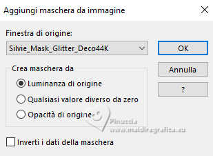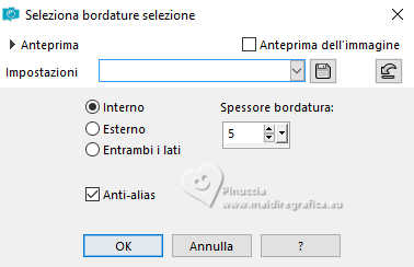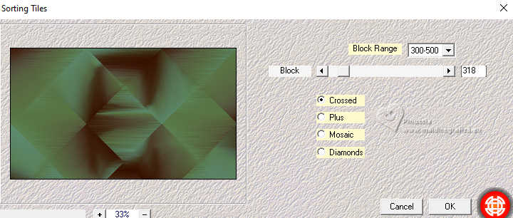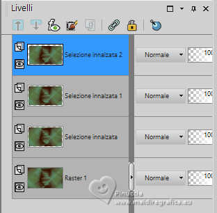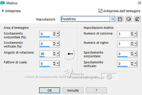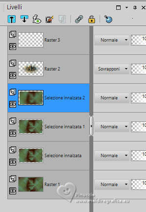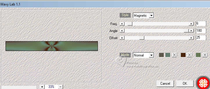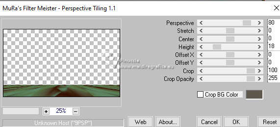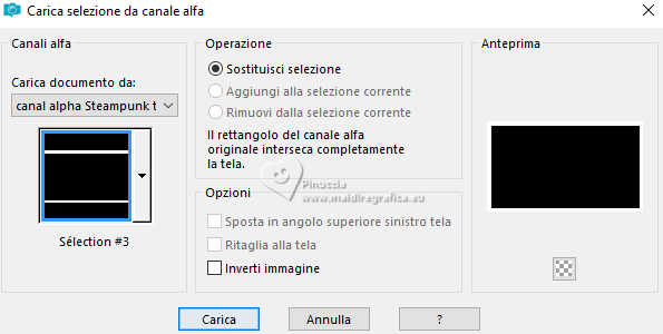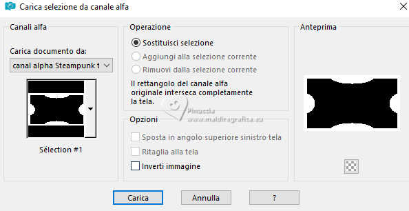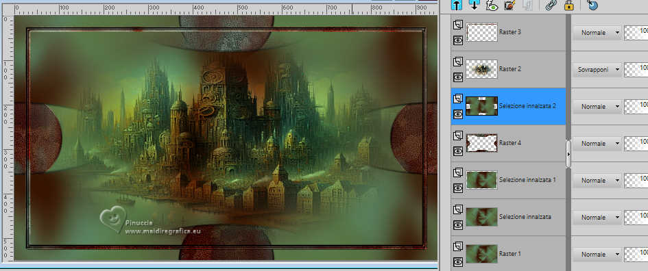 qui puoi trovare qualche risposta ai tuoi dubbi. Se l'argomento che ti interessa non è presente, ti prego di segnalarmelo. Questo tutorial, creato con PSP 2020, è stato tradotto con PSPX9, ma può essere realizzato anche con le altre versioni di PSP. Dalla versione X4, il comando Immagine>Rifletti è stato sostituito con Immagine>Capovolgi in orizzontale, e il comando Immagine>Capovolgi con Immagine>Capovolgi in verticale. Nelle versioni X5 e X6, le funzioni sono state migliorate rendendo disponibile il menu Oggetti. Con la nuova versione X7, sono tornati Rifletti>Capovolgi, ma con nuove varianti. Vedi la scheda sull'argomento qui English Translation qui Le vostre versioni qui![]() Occorrente: ![]() Altri tubes sul tema qui (non utilizzare per altri tutorial) (in questa pagina trovi i links ai siti dei creatori del materiale) ![]() se hai problemi con i filtri, consulta la mia sezione filtri qui Filters Unlimited 2.0 qui VM Toolbox - Blast qui Mehdi - Wavy Lab 1.1 qui Mehdi - Sorting Tiles qui Mura's Meister - Perspective Tiling qui I filtri VM Toolbox si possono usare da soli o importati in Filters Unlimited (come fare vedi qui) Se un filtro fornito appare con questa icona ![]() non esitare a cambiare modalità di miscelatura e opacità secondo i colori utilizzati. ![]() Se hai problemi con il canale alfa, apri una nuova immagine trasparente 950 x 550 pixels, e usa le selezioni da disco. Apri la maschera in PSP e minimizzala con il resto del materiale. colori ![]() 1. Imposta il colore di primo piano con #657c6f, e il colore di sfondo con #60584c. ![]() colore 3 #4a250c colore 4 #667957 colore 5 #ffffff 2. Apri Canal_alpha_Steampunk time Questa immagine, che sarà la base del tuo lavoro non è vuota, ma contiene le selezioni salvate sul canale alfa. Effetti>Plugins>Mehdi - Wavy Lab 1.1. Questo filtro lavora con i colori della paletta: il primo è il colore di sfondo, il secondo quello di primo piano. Cambia gli ultimi due colori creati dal filtro: il terzo con il colore 3 #4a250c, il quarto con il colore 4 #667957 ![]() Effetti>Plugins>VM Toolbox - Blast ![]() 2. Livelli>Duplica. Immagine>Rifletti>Rifletti orizzontalmente. Cambia la modalità di miscelatura di questo livello in Luce diffusa. Livelli>Unisci>Unisci giù. 3. Effetti>Plugins>Mehdi - Sorting Tiles. ![]() Selezione>Seleziona tutto. Selezione>Modifica>Contrai - 10 pixels. Selezione>Innalza selezione a livello. Selezione>Modifica>Contrai - 10 pixels. Selezione>Innalza selezione a livello. Selezione>Modifica>Contrai - 10 pixels. Selezione>Innalza selezione a livello. Abbiamo ora 4 livelli Mantieni selezionato ![]() Rimani sul livello superiore Regola>Sfocatura>Sfocatura gaussiana - raggio 25. ![]() Mantieni ancora selezionato. 4. Livelli>Nuovo livello raster. Apri il misted Paysage Steam_time_1_AIgenMM ![]() Modifica>Copia. Torna al tuo lavoro e vai a Modifica>Incolla nella selezione. Cambia la modalità di miscelatura di questo livello in Sovrapponi. Regola>Messa a fuoco>Accentua messa a fuoco. Mantieni ancora selezionato. 5. Livelli>Nuovo livello raster. Selezione>Modifica>Seleziona bordature selezione ![]() Apri l'immagine di sfondo fond MM ![]() Modifica>Copia Minimizza l'immagine. Torna al tuo lavoro e vai a Modifica>Incolla nella selezione. Effetti>Effetti di bordo>Aumenta. Effetti>Effetti 3D>Smusso a incasso ![]() Selezione>Deseleziona. 6. Attiva il livello Selezione innalzata 2 (il terzo livello dall'alto) ![]() Effetti>Effetti geometrici>Sfera ![]() Selezione>Carica/Salva selezione>Carica selezione da canale alfa La selezione sélection 1 è subito disponibile. Devi soltanto cliccare Carica. ![]() Livelli>Nuovo livello raster. Modifica>Incolla nella selezione - l'imagine fond MM è ancora in memoria. Effetti>Effetti di bordo>Aumenta. Selezione>Deseleziona. Livelli>Disponi>Sposta giù. 7. Attiva il livello soprastante. Effetti>Effetti 3D>Sfalsa ombra, colore nero. ![]() Ripeti l'Effetto Sfalsa ombra, verticale e orizzontale -3. Effetti>Effetti di immagine>Motivo unico, con i settaggi standard. ![]() La tag e i livelli ![]() 8. Attiva il livello Selezione innalzata 1 (il terzo livello dal basso). Livelli>Disponi>Sposta su - 2 volte. Effetti>Effetti di riflesso>Motivo, con i settaggi standard. ![]() Effetti>Effetti di riflesso>Specchio rotante, con i settaggi standard. ![]() Effetti>Effetti geometrici>Cerchio. ![]() Selezione>Seleziona tutto. Selezione>Modifica>Contrai - 30 pixels. Selezione>Inverti. Premi sulla tastiera il tasto CANC ![]() Selezione>Deseleziona. Cambia la modalità di miscelatura di questo livello in Indebolisci. (Secondo i tuoi colori e se necessario, abbassa l'opacità del livello). 9. Attiva il livello Selezione innalzata - il secondo livello dal basso. Livelli>Disponi>Porta in alto. Effetti>Plugins>Mura's Meister - Perspective Tiling. ![]() Selezione>Carica/Salva selezione>Carica selezione da canale alfa Apri il menu delle selezioni e carica la selezione sélection 2. ![]() Premi 3 volte sulla tastiera il tasto. Selezione>Deseleziona. Selezione>Carica/Salva selezione>Carica selezione da canale alfa Apri il menu delle selezioni e carica la selezione sélection 3. ![]() Premi sulla tastiera il tasto CANC. Selezione>Deseleziona. Livelli>Disponi>Sposta giù. 10. Attiva il livello superiore. Effetti>Effetti 3D>Sfalsa ombra, colore 3 #4a250c ![]() Modifica>Ripeti Sfalsa ombra. 11. Livelli>Unisci>Unisci visibile. Immagine>Dimensioni tela - 950 x 650 pixels ![]() Attiva lo strumento Bacchetta magica , sfumatura e tolleranza 0,e clicca nella parte trasparente per selezionarla. Effetti>Plugins>Mehdi - Wavy Lab 1.1., con i settaggi precedenti. ![]() Regola>Sfocatura>Sfocatura gaussiana - raggio 25. ![]() Mantieni selezionato. 12. Livelli>Nuovo livello raster. L'immagine di sfondo fond MM dovrebbe essere ancora in memoria Modifica>Incolla nella selezione. Effetti>Plugins>Mura's Meister - Perspective tiling, con i settaggi standard (clicca su Reset per annullare i precedenti settaggi) ![]() Cambia la modalità d