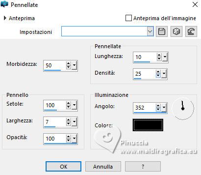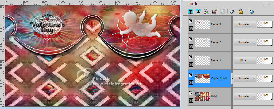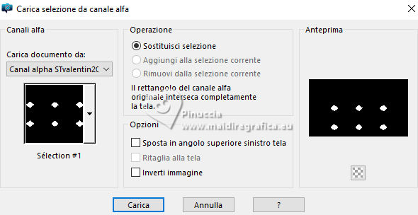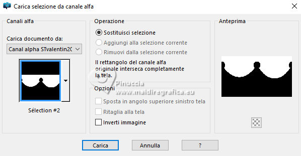 qui puoi trovare qualche risposta ai tuoi dubbi. Se l'argomento che ti interessa non è presente, ti prego di segnalarmelo. Questo tutorial, creato con PSP 2020, è stato tradotto con PSPX9, ma può essere realizzato anche con le altre versioni di PSP. Dalla versione X4, il comando Immagine>Rifletti è stato sostituito con Immagine>Capovolgi in orizzontale, e il comando Immagine>Capovolgi con Immagine>Capovolgi in verticale. Nelle versioni X5 e X6, le funzioni sono state migliorate rendendo disponibile il menu Oggetti. Con la nuova versione X7, sono tornati Rifletti>Capovolgi, ma con nuove varianti. Vedi la scheda sull'argomento qui English Translation qui Le vostre versioni qui![]() Occorrente: ![]() Materiale di Moi-Même Altri tube a tema qui (non usare per altri tutorial) (in questa pagina trovi i links ai siti dei creatori del materiale) ![]() se hai problemi con i filtri, consulta la mia sezione filtri qui Filters Unlimited 2.0 qui &<Bkg Designer sf10I> (da importarein Unlimited) qui AFS IMPORT - sqborder2 qui AAA Frames - Foto Frame qui Flaming Pear - Flexify 2 qui FM Tile Tools - Blend Emboss qui facoltativo deco nel materiale): Alien Skin Eye Candy 5 Impact - Glass qui I filtri AFS IMPORT si possono usare da soli o importati in Filters Unlimited (come fare vedi qui) Se un filtro fornito appare con questa icona ![]() non esitare a cambiare modalità di miscelatura e opacità secondo i colori utilizzati. Metti il preset per Flexify in una cartella a scelta. Io abitualmente lo lascio nella cartella del materiale. Lo importerai dalla cartella quando ti servirà. ![]() Se hai problemi con il canale alfa, apri una nuova immagine trasparente 950 x 550 pixels, e usa le selezioni da disco. Imposta il colore di primo piano con #ffffff, e il colore di sfondo con #620811. ![]() 1. Apri Canal_alpha STvalentin2026 Questa immagine, che sarà la base del tuo lavoro non è vuota, ma contiene le selezioni salvate sul canale alfa. Selezione>Seleziona tutto. Apri l'immagine Paysage-STvalentin2026 ![]() Modifica>Copia. minimizza l'immagine che ti servirà ancora Torna al tuo lavoro e vai a Modifica>Incolla nella selezione. Selezione>Deseleziona. Regola>Sfocatura>Sfocatura gaussiana - raggio 20. ![]() Selezione>Deseleziona. Effetti>Effetti tecniche di disegno>Pennellate. ![]() 2. Apri déco 1 MM ![]() Modifica>Copia. Torna al tuo lavoro e vai a Modifica>Incolla come nuovo livello. Effetti>Effetti 3D>Sfalsa ombra, colore nero; ombra su nuovo livello selezionato. ![]() Rimani sul livello dell'ombra. 3. Effetti>Plugins>Filters Unlimited 2.0 - &<Bkg Designer sf10I> - Cruncher, con i settaggi standard. ![]() Effetti>Plugins>AFS IMPORT - sqborder2, con i settaggi standard. ![]() Regola>Messa a fuoco>Metti a fuoco. Cambia la modalità di miscelatura di questo livello in Luminanza (esistente), (o Luce diffusa, secondo i tuoi colori) 4. Attiva il livello superiore. Cambia la modalità di miscelatura di questo livello in luminanza (esistente). 5. Livelli>Nuovo livello raster. Selezione>Carica/Salva selezione>Carica selezione da disco. La selezione sélection 1 è subito disponibile. Devi soltanto cliccare Carica. ![]() Attiva nuovamente l'immagine Paysage-STvalentin2026 e vai a Modifica>Copia. Torna al tuo lavoro e vai a Modifica>Incolla nella selezione. Effetti>Plugins>Alien Skin Eye Candy 5 Impact - Glass (nel materiale trovi, se necessario, il tube ma déco glass ,cancella la firma e copia/incolla nella selezione) ![]() Livelli>Disponi>Sposta giù. Selezione>Deseleziona. 6. La tag e i livelli ![]() 7. Livelli>Unisci>Unisci visibile. Livelli>Duplica. Regola>Sfocatura>Sfocatura gaussiana - raggio 20 ![]() Effetti>Plugins>AAA Frames - Foto Frame. ![]() Ripeti Effetti>Plugins>AAA Frames - Foto Frame - width 7. ![]() Immagine>Ridimensiona, all'80%, tutti i livelli non selezionato. Note: il preset è stato creato con PSP 2020, e potrebbe chiudere il programma se stai usando una versione differente. Per questo, ti consiglio di salvare prima il lavoro, o copia/incolla come nuovo livello il file che trovi nella cartella mon effet Flexify 2 si nécessaire: image1 ;da colorizzare per adattarlo ai tuoi colori. Oppure copia semplicemente i settaggi che vedi nella schermata Effetti>Plugins>Flaming Pear - Flexify 2 clicca sul bottone rosso e cerca il preset nella cartella in cui lo hai salvato ![]() ![]() Tasto K per attivare lo strumento Puntatore ![]() Posizione X: 0,00 - Posizione Y: -158. ![]() Tasto M per deselezionare lo strumento. 8. Attiva il livello di sfondo, Uniti. Selezione>Seleziona tutto. Immagine>Ritaglia la selezione. 9. Attiva il livello superiore. Livelli>Nuovo livello raster. Selezione>Carica/Salva selezione>Carica selezione da canale alfa. Apri il menu delle selezioni a carica la selezione sélection 2 ![]() Attiva nuovamente l'immagine Paysage-STvalentin2026 e vai a Modifica>Copia. Torna al tuo lavoro e vai a Modifica>Incolla nella selezione. Cambia la modalità di miscelatura di questo livello in Luce diffusa. Effetti>Plugins>FM Tile Tools - Blend Emboss, con i settaggi standard. ![]() Livelli>Unisci>Unisci giù. Selezione>Modifica>Sfuma - 3 pixels. Selezione>Inverti. Premi 2 volte sulla tastiera il tasto CANC ![]() Selezione>Deseleziona. Effetti>Effetti 3D>Sfalsa ombra, con i settaggi standard. ![]() 10. Apri il tube déco coeur ![]() Modifica>Copia. Torna al tuo lavoro e vai a Modifica>Incolla come nuovo livello. Tasto K per attivare lo strumento Puntatore ![]() Posizione X: 23,00 - Posizione Y: 0,00. ![]() Cambia la modalità di miscelatura di questo livello in Filtra. Effetti>Plugins>FM Tile Tools - Blend Emboss, con i settaggi standard. ![]() 11. Apri il tube déco cupidon ![]() Modifica>Copia. Torna al tuo lavoro e vai a Modifica>Incolla come nuovo livello. Posizione X: 562,00 - Posizione Y: 21,00. ![]() 12. Apri déco message ![]() Modifica>Copia. Torna al tuo lavoro e vai a Modifica>Incolla come nuovo livello. Posizione X: 134,00 - Posizione Y: 39,00. ![]() Tasto M per deselezionare lo strume
