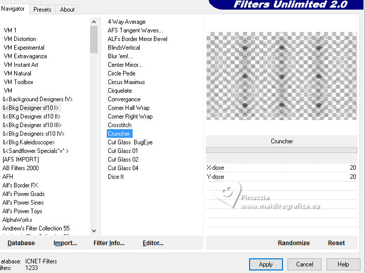 3. Effects>Plugins>Filters Unlimited 2.0 - &<Bkg Designer sf10I> - Cruncher, default settings.