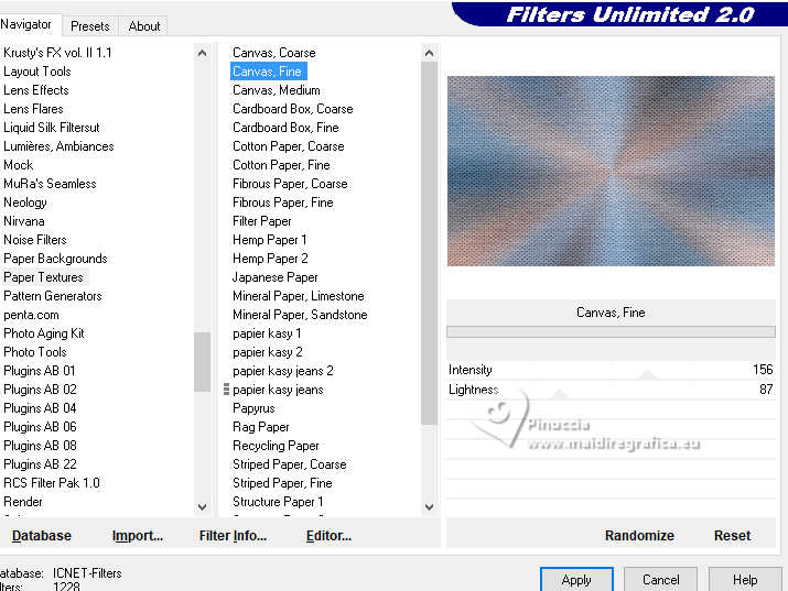 7. Effets>Modules Externes>Filters Unlimited 2.0 - Paper Texture - Canvas Fine, par défaut.