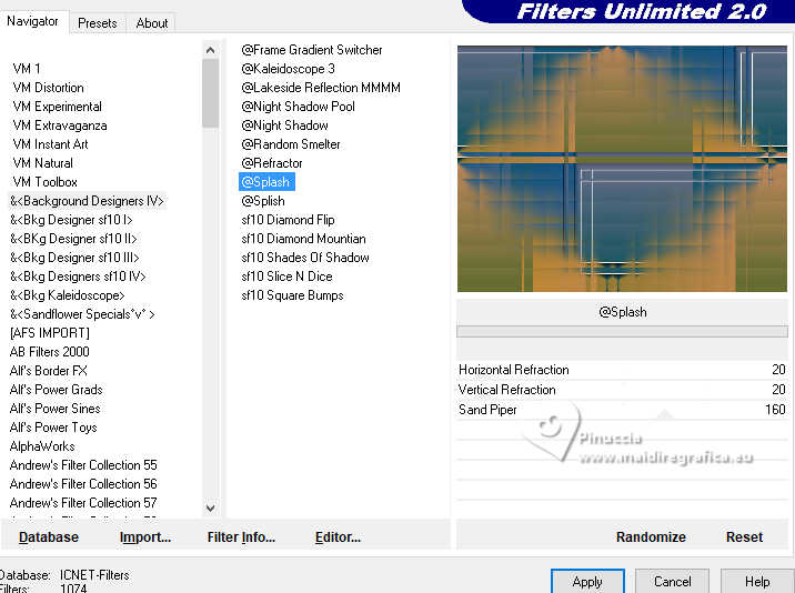 5. Effetti>Plugins>Filters Unlimited 2.0 - &<Background Designer IV> - @Splash, con i settaggi standard.