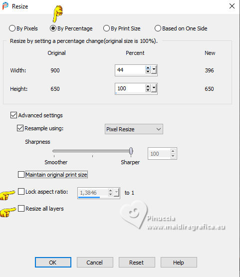 Image>Resize, to 44% width, Look aspect ratio and Resize all layers not checked.
