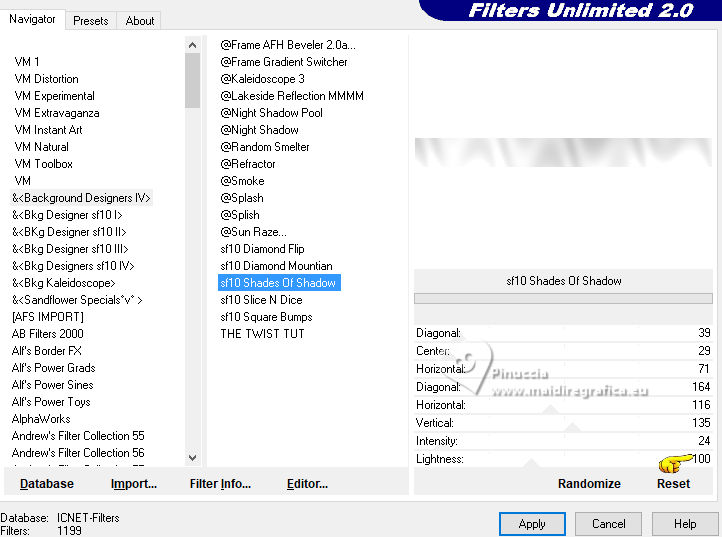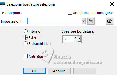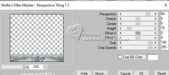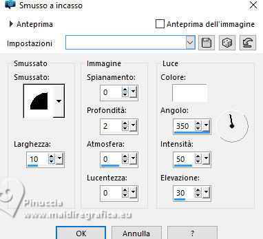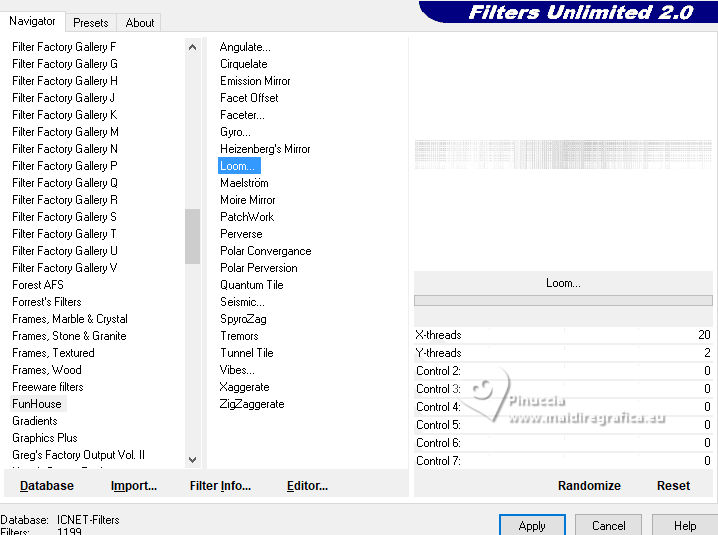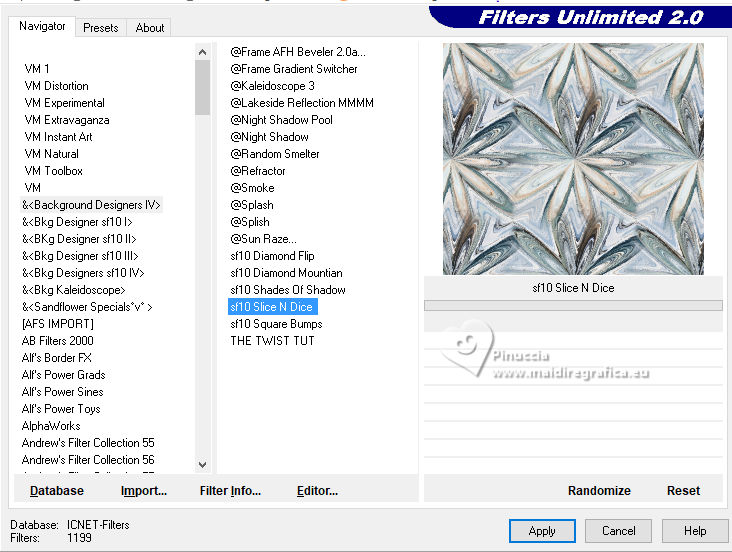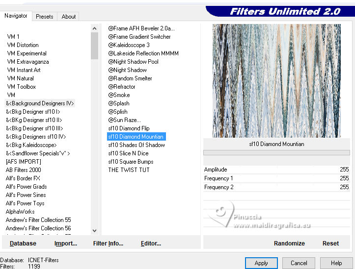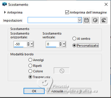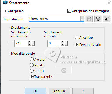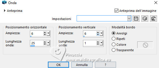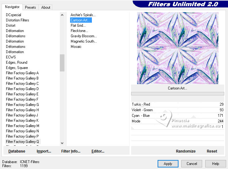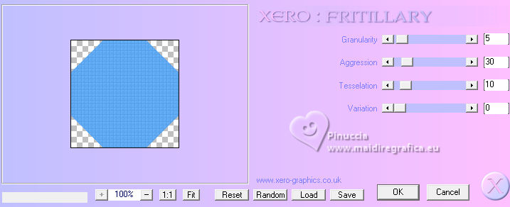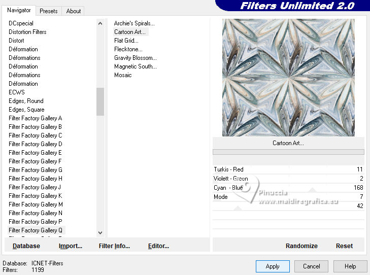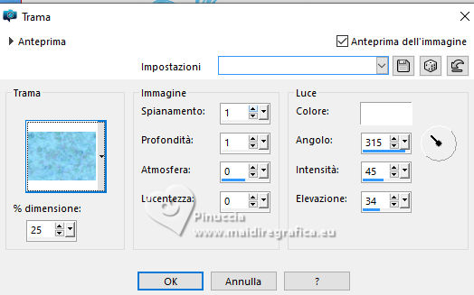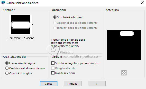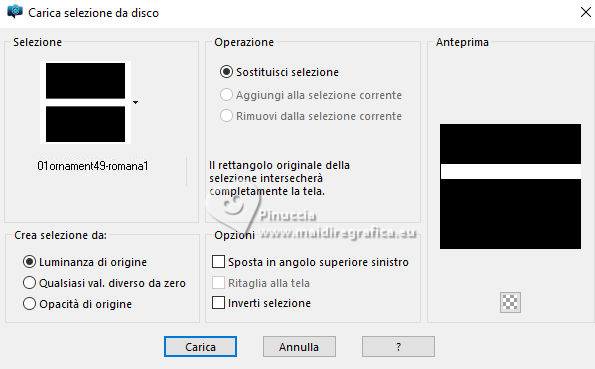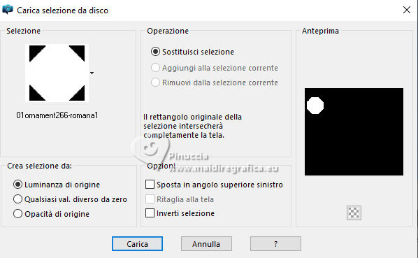 qui puoi trovare qualche risposta ai tuoi dubbi. Se l'argomento che ti interessa non è presente, ti prego di segnalarmelo. Questo tutorial è stato realizzato con PSP2020 e tradotto con PSPX9, ma può essere realizzato anche con le altre versioni di PSP. Dalla versione X4, il comando Immagine>Rifletti è stato sostituito con Immagine>Capovolgi in orizzontale, e il comando Immagine>Capovolgi con Immagine>Capovolgi in verticale. Nelle versioni X5 e X6, le funzioni sono state migliorate rendendo disponibile il menu Oggetti. Con la nuova versione X7, sono tornati Rifletti>Capovolgi, ma con nuove varianti. Vedi la scheda sull'argomento qui Occorrente: Tubes a scelta: 1 Immagine 1 tube principale 5 tubes accessori Il resto del materiale qui Filtri: in caso di dubbi, ricorda di consultare la mia sezione filtri qui &<Background Design IV> - sf10 Diamond Mountion, sf10 Slice N Dice, sf10 Shades of Shadow (da importare in Unlimited) qui Filter Factory Gallery Q - Cartoon Art qui Funhouse - Heizenberg's Mirror qui Funhouse - Loom qui Flaming Pear - Flexify 2 qui Xero - Fritillary qui Mura's Meister - Perspective Tiling qui I filtri Factory Gallery e Funhouse si possono usare da soli o importati in Filters Unlimited (come fare vedi qui) Se un filtro fornito appare con questa icona ![]() non esitare a cambiare modalità di miscelatura e opacità secondo i colori utilizzati. ![]() 1. Apri una nuova immagine trasparente 900 x 800 pixels. Scegli due colori dal tuo tube. Imposta il colore di primo piano con #5ea9f2. e il colore di sfondo con il colore bianco #ffffff. 2. Selezione>Seleziona tutto. Apri la tua immagine e vai a Modifica>Copia. Torna al tuo lavoro e vai a Modifica>Incolla nella selezione. Selezione>Deseleziona. 3. Effetti>Plugins>Filters Unlimited 2.0 - &<Background Design IV> - sf10 Diamond Mountion. ![]() 4. Effetti>Effetti di distorsione>Coordinate polari. ![]() 5. Effetti>Effetti di immagine>Motivo unico, con i settaggi standard. ![]() 6. Effetti>Plugins>Filters Unlimited 2.0 - &<Background Design IV> - sf10 Slice N Dice ![]() 7. Effetti>Plugins>Filters Unlimited 2.0 - Filter Factory Gallery Q - Cartoon Art ![]() Eventualmente, se necessario, gioca un po' con i colori o ricolora secondo il tuo colore. Per esempio, questi i settaggi per un colore blu. ![]() un trucco: clicca su Randomize finché non ti appare il risultato che ti piace di più Alla fine, se non ti piaceranno, potrai sempre correggerli con il Viraggio. 8. Livelli>Nuovo livello raster. Selezione>Carica/Salva selezione>Carica selezione da disco. Cerca e carica la selezione 01ornament49-romana1 ![]() Riempi la selezione con il colore di sfondo.9. Effetti>Plugins>Filters Unlimited 2.0 - &<Background Design IV> - sf10 Shades of Shadow. ![]() 10. Effetti>Plugins>Funhouse - Heizenberg's Mirror. ![]() 11. Effetti>Plugins>Funhouse - Loom. ![]() Selezione>Deseleziona. 12. Effetti>Plugins>Flaming Pear - Flexify 2. ![]() 13. Effetti>Effetti di immagine>Scostamento. ![]() 14. Effetti>Effetti di distorsione>Onda. ![]() 15. Effetti>Effetti 3D>Sfalsa ombra, colore bianco. ![]() Livelli>Duplica. Immagine>Rifletti>Rifletti orizzontalmente. 16. Livelli>Nuovo livello raster. Selezione>Carica/Salva selezione>Carica selezione da disco. Cerca e carica la selezione 01ornament266-romana1 ![]() Riempi la selezione con il colore di primo piano.17. Effetti>Plugins>Xero - Fritillary ![]() Regola>Messa a fuoco>Metti a fuoco. 18. Selezione>Modifica>Seleziona bordature selezione. ![]() Riempi la selezione con il colore di sfondo.Effetti>Effetti 3D>Sfalsa ombra, colore nero. ![]() Selezione>Deseleziona. 19. Livelli>Duplica. Attiva il livello sottostante dell'originale. Livelli>Nuovo livello raster. Selezione>Carica/Salva selezione>Carica selezione da disco. Carica nuovamente la selezione 01ornament266-romana1 ![]() 20. Apri il tuo tube accessorio (per me un pupazzo di neve), e vai a Modifica>Copia. Torna al tuo lavoro e vai a Modifica>Incolla nella selezione. Regola>Messa a fuoco>Metti a fuoco. Selezione>Deseleziona. Effetti>Effetti 3D>Sfalsa ombra, colore nero. ![]() Livelli>Unisci>Unisci giù. 21. Attiva il livello superiore della copia. Selezione>Carica/Salva selezione>Carica selezione da disco. Carica nuovamente la selezione 01ornament266-romana1 ![]() 22. Apri il tuo secondo tube accessorio (per me un pupazzo di neve) e vai a Modifica>Copia. Torna al tuo lavoro e vai a Modifica>Incolla nella selezione. Regola>Messa a fuoco>Metti a fuoco. Selezione>Deseleziona. Effetti>Effetti 3D>Sfalsa ombra, colore nero. ![]() Livelli>Unisci>Unisci giù. 23. Effetti>Effetti di immagine>Scostamento. ![]() 24. Apri il tuo terzo tube accessorio (per me un misted), e vai a Modifica>Copia. Torna al tuo lavoro e vai a Modifica>Incolla come nuovo livello. Immagine>Ridimensiona, se necessario, tutti i livelli non selezionato. Posiziona il tube al centro, come nel mio esempio, o dove preferisci.Regola>Messa a fuoco>Metti a fuoco. Effetti>Effetti 3D>Sfalsa ombra, colore nero. ![]() 25. Attiva il livello Raster 1. Livelli>Duplica. Effetti>Plugins>Mura's Meister - Perspective Tiling. ![]() 26. Apri il sterne (lo trovi nel materiale), e vai a Modifica>Copia. Torna al tuo lavoro e vai a Modifica>Incolla come nuovo livello. Il tube ha la dimensione corretta Sposta il tube a destra, come nel mio esempio.Regola>Messa a fuoco>Metti a fuoco. 27. Livelli>Nuovo livello raster. Selezione>Carica/Salva selezione>Carica selezione da disco. Cerca e carica la selezione 01ornament267-romana1 ![]() Riempi la selezione con il colore di primo piano.Effetti>Effetti di trama>Trama - seleziona la trama misc32. ![]() Effetti>Effetti 3D>Sfalsa ombra, colore nero. ![]() Selezione>Deseleziona. 28. Attiva lo strumento Testo , scegli un font,e scrivi il tuo testo. Io ho scritto Effetti>Effetti 3D>Sfalsa ombra, a scelta. Sposta il testo nel riquadro.29. Apri il tuo tube accessorio (Candela). Modifica>Copia. Torna al tuo lavoro e vai a Modifica>Incolla come nuovo livello. Immagine>Ridimensiona, se necessari