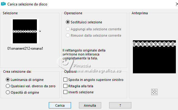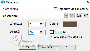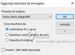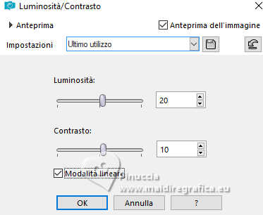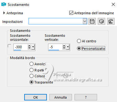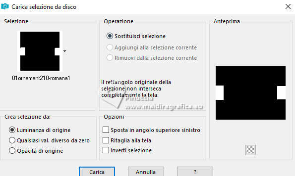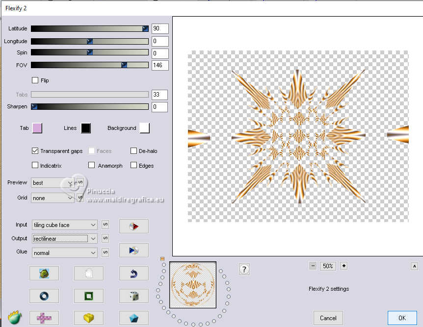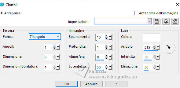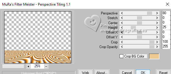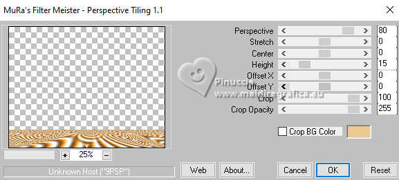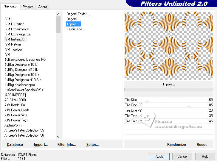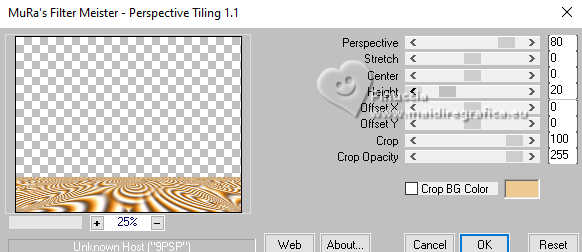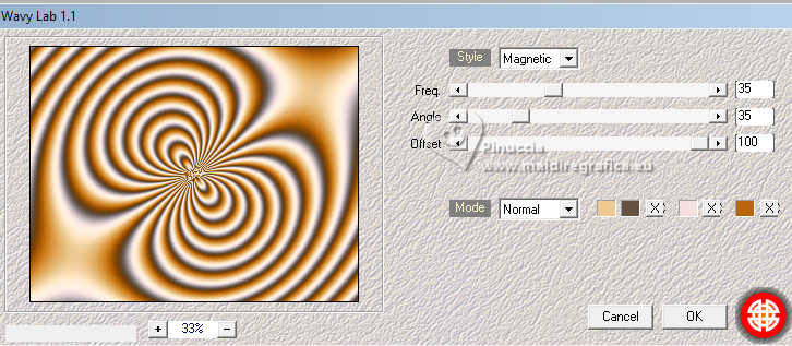 qui puoi trovare qualche risposta ai tuoi dubbi. Se l'argomento che ti interessa non è presente, ti prego di segnalarmelo. Questo tutorial è stato realizzato con PSP2020 e tradotto con PSPX9, ma può essere realizzato anche con le altre versioni di PSP. Dalla versione X4, il comando Immagine>Rifletti è stato sostituito con Immagine>Capovolgi in orizzontale, e il comando Immagine>Capovolgi con Immagine>Capovolgi in verticale. Nelle versioni X5 e X6, le funzioni sono state migliorate rendendo disponibile il menu Oggetti. Con la nuova versione X7, sono tornati Rifletti>Capovolgi, ma con nuove varianti. Vedi la scheda sull'argomento qui Occorrente: Tubes a scelta: 1 tube principale 1 tube accessorio Il resto del materiale qui (in questa pagina trovi i links ai siti dei creatori di tubes) Filtri: in caso di dubbi, ricorda di consultare la mia sezione filtri qui Filters Unlimited 2.0 qui Flaming Pear - Flexify 2 qui Mehdi - Wavy lab 1.1 qui VM Instant Art - Tripolis qui Mura's Meister - Perspective Tiling qui I filtri VM Instant Art si possono usare da soli o importati in Filters Unlimited (come fare vedi qui) Se un filtro fornito appare con questa icona ![]() non esitare a cambiare modalità di miscelatura e opacità secondo i colori utilizzati. ![]() Metti le selezioni nella cartella Selezioni. Apri la maschera in PSP e minimizzala con il resto del materiale. 1. Apri una nuova immagine trasparente 900 x 700 pixels. Scegli due colori dal tuo tube Per l'esempio: Imposta il colore di primo piano con #645142 e il colore di sfondo con #eec992 ![]() 2. Effetti>Plugins>Mehdi - Wavy Lab 1.1. Questo filtro crea gradienti con i colori della paletta; il primo è il colore di sfondo, il secondo quello di primo piano. Cambia gli ultimi due colori creati dal filtro con colori scelti dal tuo materiale; per l'esempio: colore 3 #f4e1dd - colore 4 #b766aa ![]() 3. Effetti>Effetti di immagine>Motivo unico, con i settaggi standard. ![]() 4. Eventualmente, se trovi l'immagine troppo scura: Regola>Luminosità e contrasto>Luminosità e contrasto ![]() 5. Livelli>Duplica. Immagine>Ridimensiona, al 60%, tutti i livelli non selezionato. ![]() 6. Effetti>Plugins>Filters Unlimited 2.0 - VM Instant Art - Tripolis ![]() 7. Effetti>Plugins>Flaming Pear - Flexify 2. ![]() 8. Rimani su questo livello. Selezione>Carica/Salva selezione>Carica selezione da disco. Cerca e carica la selezione 01ornament210-romana1 ![]() Premi sulla tastiera il tasto CANC ![]() Selezione>Deseleziona. 9. Immagine>Ridimensiona, al 55%, tutti i livelli non selezionato. ![]() 10. Rimani su questo livello. Selezione>Carica/Salva selezione>Carica selezione da disco. Cerca e carica la selezione 01ornament211-romana1 ![]() Premi sulla tastiera il tasto CANC. Selezione>Deseleziona. 11 Effetti>Effetti 3D>Sfalsa ombra, colore nero. ![]() 12. Livelli>Duplica. Effetti>Effetti di immagine>Scostamento. ![]() 13. Livelli>Duplica. Immagine>Rifletti>Rifletti orizzontalmente. Effetti>Effetti di immagine>Scostamento. ![]() 14. Livelli>Nuovo livello raster. Riempi il livello con il colore di primo piano.Livelli>Nuovo livello maschera>Da immagine. Apri il menu sotto la finestra di origine e vedrai la lista dei files aperti. Seleziona la mashera Silvie_Mask_Magic84F ![]() Livelli>Unisci>Unisci gruppo. 15. Effetti>Effetti 3D>Sfalsa ombra, colore chiaro. ![]() Livelli>Disponi>Sposta giù - 3 volte. 16. Attiva il livello superiore. Livelli>Nuovo livello raster. Selezione>Carica/Salva selezione>Carica selezione da disco. Cerca e carica la selezione 01ornament212-romana1 ![]() Riempi la selezione con il colore di primo piano.17. Effetti>Effetti di trama>Ciottoli. ![]() 18. Selezione>Modifica>Seleziona bordature selezione. ![]() Riempi la selezione con il colore di sfondo.19. Effetti>Effetti di trama>Veneziana, colore scuro. ![]() 20. Effetti>Effetti 3D>Sfalsa ombra, colore nero. ![]() Selezione>Deseleziona. 21. Attiva il livello Raster 1. Livelli>Duplica. Effetti>Plugins>Mura's Meister - Perspective Tiling. ![]() 22. Attiva il livello Raster 1. Livelli>Duplica. Effetti>Plugins>Mura's Meister - Perspective Tiling. ![]() Effetti>Effetti 3D>Sfalsa ombra, colore nero. ![]() Livelli>Disponi>Sposta su. 23. Attiva il livello Raster 1. Livelli>Duplica. Effetti>Plugins>Mura's Meister - Perspective Tiling. ![]() Effetti>Effetti 3D>Sfalsa ombra, con i settaggi precedenti. ![]() Livelli>Disponi>Sposta su - 2 volte. 24. Attiva il livello superiore. Attiva lo strumento Testo ![]() Scegli un font e scrivi il tuo testo. Io ho scritto Afrika Girl Sposta correttamente il testo, ridimensionalo se necessario.Effetti>Effetti 3D>Sfalsa ombra, colore nero. ![]() 25. Immagine>Aggiungi bordatura, 2 pixels, simmetriche, colore #645142. Selezione>Seleziona tutto. Immagine>Aggiungi bordatura, 10 pixels, simmetriche, colore #eec992. Selezione>Inverti. Effetti>Effetti di trama>Ciottoli, con i settaggi precedenti. ![]() Selezione>Deseleziona. 26. Immagine>Aggiungi bordatura, 2 pixels, simmetriche, colore #645142. Selezione>Seleziona tutto. Immagine>Aggiungi bordatura, 15 pixels, simmetriche, colore #eec992. Selezione>Inverti. Effetti>Effetti di trama>Ciottoli, con i settaggi precedenti. Selezione>Deseleziona. 27. Immagine>Aggiungi bordatura, 2 pixels, simmetriche, colore #645142. Selezione>Seleziona tutto. Immagine>Aggiungi bordatura, 20 pixels, simmetriche, colore #eec992. Selezione>Inverti. Effetti>Effetti di trama>Ciottoli, con i settaggi precedenti. Selezione>Deseleziona. 28. Apri il tube accessorio e vai a Modifica>Copia. Torna al tuo lavoro e vai a Modifica>Incolla come nuovo livello. Immagine>Ridimensiona, se e quanto necessario. Regola>Messa a fuoco>Metti a fuoco. Sposta il tube a sinistra, vedi il mio esempio.Effetti>Effetti 3D>Sfalsa ombra, colore nero. ![]() 29. Apri il tube principale e vai a Modifica>Copia. Torna al tuo lavoro e vai a Modifica>Incolla come nuovo livello. Immagine>Ridimensiona, se e quanto necessario. Regola>Messa a fuoco>Metti a fuoco. Sposta il tube a destra, vedi il mio