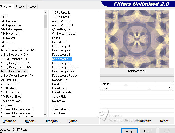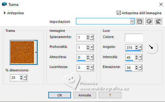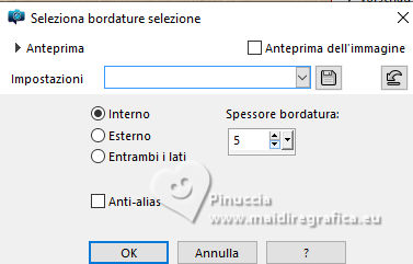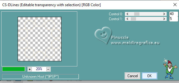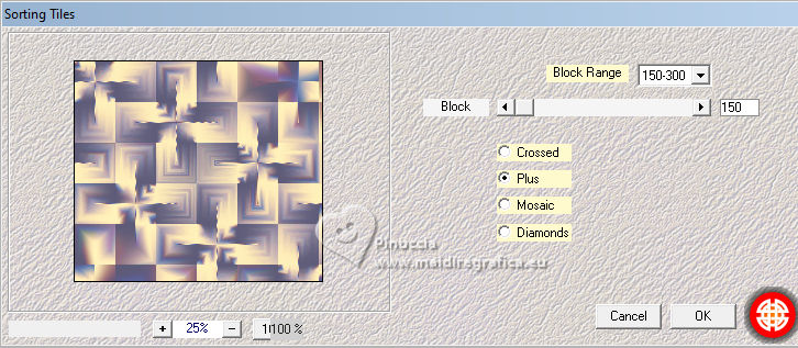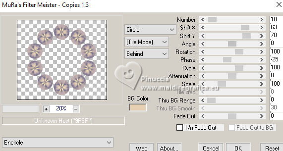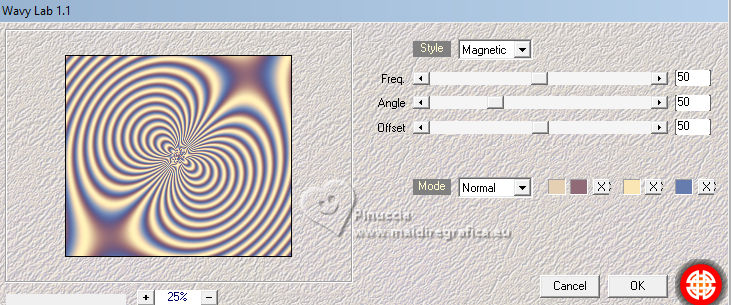 qui puoi trovare qualche risposta ai tuoi dubbi. Se l'argomento che ti interessa non è presente, ti prego di segnalarmelo. Questo tutorial è stato realizzato con PSP2020 e tradotto con PSPX9, ma può essere realizzato anche con le altre versioni di PSP. Dalla versione X4, il comando Immagine>Rifletti è stato sostituito con Immagine>Capovolgi in orizzontale, e il comando Immagine>Capovolgi con Immagine>Capovolgi in verticale. Nelle versioni X5 e X6, le funzioni sono state migliorate rendendo disponibile il menu Oggetti. Con la nuova versione X7, sono tornati Rifletti>Capovolgi, ma con nuove varianti. Vedi la scheda sull'argomento qui Occorrente: Tubes a scelta: 1 tube principale 2 tubes accessori Il resto del materiale qui Filtri: in caso di dubbi, ricorda di consultare la mia sezione filtri qui Filters Unlimited 2.0 qui &<Bkg Kaleidoscope> - Kaleidoscope 4 (da importare in Unlimited) qui Mehdi - Wavy Lab 1.1 qui Mehdi - Sorting Tiles qui Carolaine and Sensibility - CS-DLines qui AAA Frames - Texture Frame qui Mura's Meister - Perspective Tiling qui ![]() non esitare a cambiare modalità di miscelatura e opacità secondo i colori utilizzati. ![]() Metti la trama misc 173 nella cartella Trame. Metti le selezioni nella cartella Selezioni. 1. Apri una nuova immagine trasparente 900 x 800 pixels. Scegli due colori dal tuo tube Per l'esempio: Imposta il colore di primo piano con #916a78 e il colore di sfondo con #e5d0b4 ![]() 2. Effetti>Plugins>Mehdi - Wavy Lab 1.1. Questo filtro crea gradienti con i colori della paletta: il primo è il colore di sfondo, il secondo quello di primo piano. Cambia gli ultimi due colori creati dal filtro con due colori del tuo tube: per l'esempio il terzo con #fae6b4 e il quarto con #667cae. ![]() 3. Effetti>Plugins>Mehdi - Sorting Tile. ![]() 4. Effetti>Plugins>Filters Unlimited 2.0- &<Bkg Kaleidoscope> - Kaleidoscope 4. ![]() 5. Rimani su questo livello. Selezione>Carica/Salva selezione>Carica selezione da disco. Cerca e carica la selezione 01ornament243-romana1 ![]() Selezione>Innalza selezione a livello. Selezione>Deseleziona. 6. Immagine>Ridimensiona, al 40%, tutti i livelli non selezionato. ![]() 7. Effetti>Plugins>Mura's Meister - Copies. ![]() Effetti>Effetti di bordo>Aumenta. 8. Livelli>Nuovo livello raster. Selezione>Carica/Salva selezione>Carica selezione da disco. Cerca e carica la selezione 01ornament244-romana1 ![]() 9. Selezione>Modifica>Seleziona bordature selezione. ![]() Riempi la selezione con il colore di sfondo.10. Effetti>Plugins>Carolaine and Sensibility - CS-DLines. ![]() 11. Effetti>Effetti 3D>Sfalsa ombra. ![]() Livelli>Unisci>Unisci giù. Selezione>Deseleziona. 12. Effetti>Effetti di immagine>Scostamento. ![]() 13. Attiva il livello raster 1. Livelli>Nuovo livello raster. Selezione>Carica/Salva selezione>Carica selezione da disco. Cerca e carica nuovamente la selezione 01ornament243-romana1 ![]() Riempi la selezione con il colore di primo piano.14. Effetti>Effetti di trama>Trama - seleziona la trama misc173 ![]() 15. Apri il tuo primo tube accessorio e vai a Modifica>Copia. Torna al tuo lavoro e vai a Modifica>Incolla nella selezione. Regola>Messa a fuoco>Accentua Messa a fuoco. Livelli>Nuovo livello raster. Selezione>Modifica>Seleziona bordature selezione, con i settaggi precedenti. ![]() Riempi la selezione con il colore di sfondo.Effetti>Plugins>Carolaine and Sensibility - CS-DLines, con i settaggi precedenti. Effetti>Effetti 3D>Sfalsa ombra. ![]() Selezione>Deseleziona. Livelli>Unisci>Unisci giù - 2 volte. 16. Effetti>Effetti di immagine>Scostamento, con i settaggi precedenti. ![]() 17. Attiva lo strumento Testo ![]() scegli un font e scrivi il tuo testo; io ho scritto Autumn Fairy Posiziona il testo come preferisci.18. Effetti>Effetti 3D>Sfalsa ombra. ![]() ho usato questo Sfalsa ombra nel mio secondo esempio; per il primo esempio, ho usato un altro Sfalsa ombra adatto al mio testo Regola>Messa a fuoco>Accentua Messa a fuoco. 19. Selezione>Seleziona tutto. Immagine>Aggiungi bordatura, 25 pixels, simmetriche, colore di primo piano #916a78. Immagine>Aggiungi bordatura, 25 pixels, simmetriche, colore di sfondo #e5d0b4. Selezione>Inverti. Effetti>Plugins>Carolaine and Sensibility - CS-DLines, con i settaggi precedenti. 20. Effetti>Plugins>AAA Frames - Texture Frame. ![]() Selezione>Inverti. Effetti>Effetti 3D>Sfalsa ombra. ![]() Selezione>Seleziona tutto. Selezione>Modifica>Contrai - 25 pixels. Ripeti Effetti>Effetti 3D>Sfalsa ombra. ![]() Selezione>Deseleziona. 21. Apri il tuo secondo tube accessorio e vai a Modifica>Copia. Torna al tuo lavoro e vai a Modifica>Incolla come nuovo livello. Immagine>Ridimensiona, se e quanto necessario, tutti i livelli non selezionato. Regola>Messa a fuoco>Metti a fuoco. Sposta il tube in basso a destra.Effetti>Effetti 3D>Sfalsa ombra, colore nero. ![]() 22. Apri il tuo tube principale e vai a Modifica>Copia. Torna al tuo lavoro e vai a Modifica>Incolla come nuovo livello. Immagine>Ridimensiona, se e quanto necessario, tutti i livelli non selezionato. Regola>Messa a fuoco>Metti a fuoco. Sposta il tube a destra.Effetti>Effetti 3D>Sfalsa ombra, colore nero. ![]() 23. Attiva lo strumento Testo ![]() e scrivi il tuo nome o aggiungi il tuo watermark. Effetti>Effetti 3D>Sfalsa ombra, a scelta. 24. Livelli>Unisci>Unisci tutto e salva in formato jpg. Per i tubes di questo esempio grazie ElFairy . ![]() ![]() Le vostre versioni. Grazie ![]() Tosca dei gatti ![]() Irene ![]() Se hai problemi o dubbi, o trovi un link non funzionante, o anche soltanto per un saluto, scrivimi. |