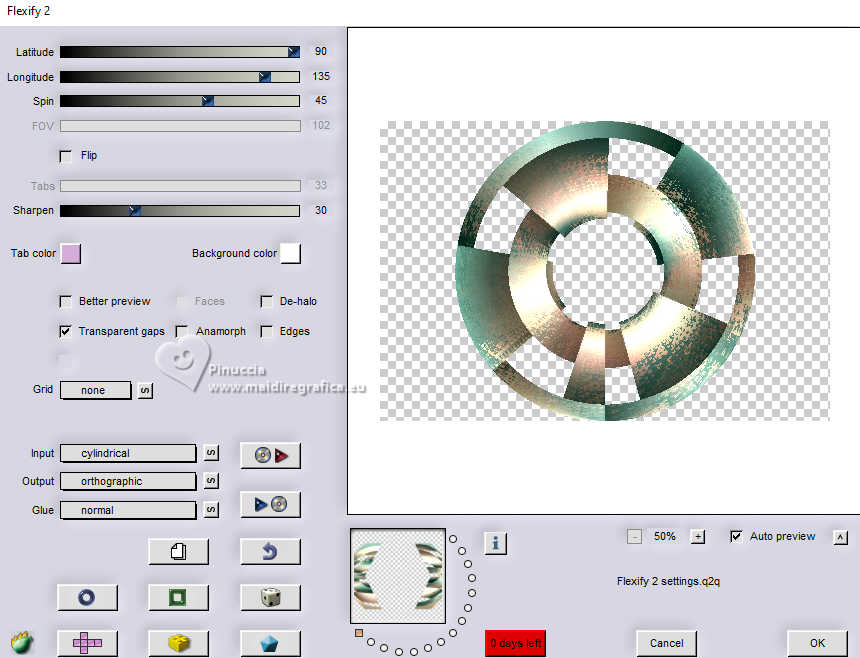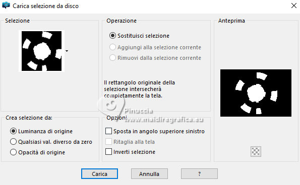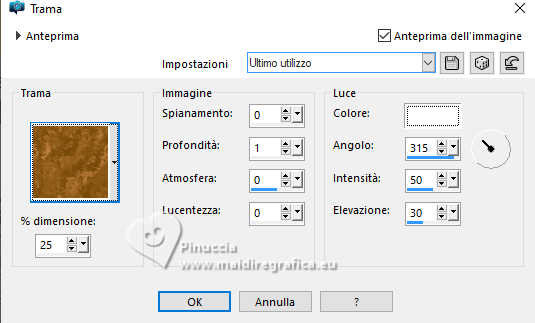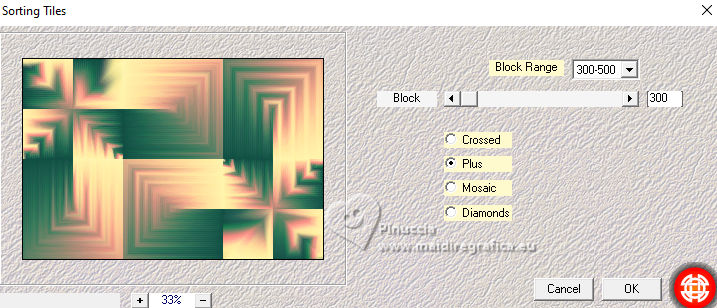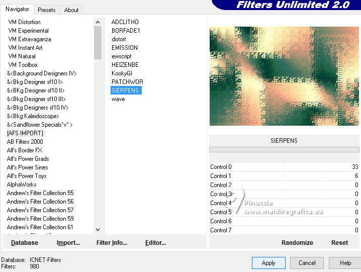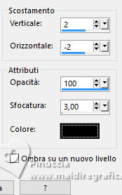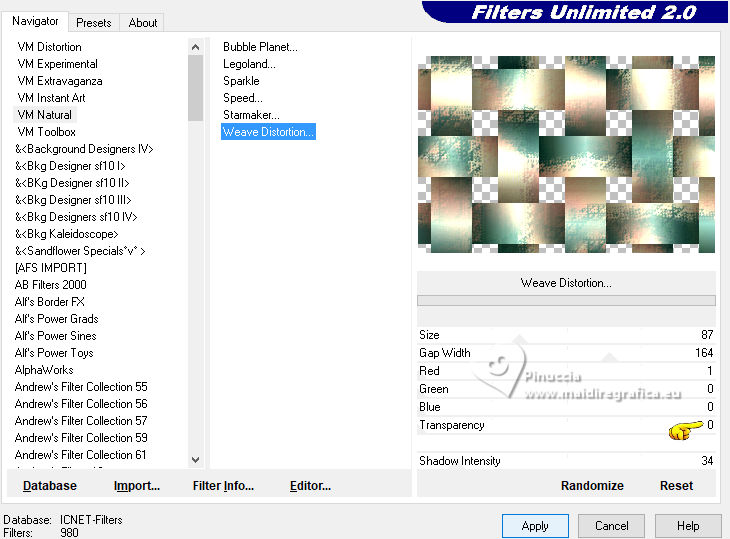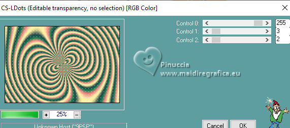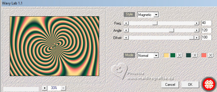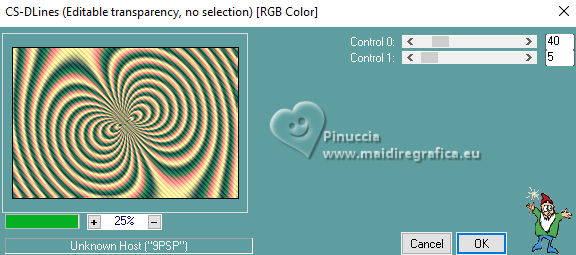 qui puoi trovare qualche risposta ai tuoi dubbi. Se l'argomento che ti interessa non è presente, ti prego di segnalarmelo. Questo tutorial è stato realizzato con PSP2020 e tradotto con PSPX9, ma può essere realizzato anche con le altre versioni di PSP. Dalla versione X4, il comando Immagine>Rifletti è stato sostituito con Immagine>Capovolgi in orizzontale, e il comando Immagine>Capovolgi con Immagine>Capovolgi in verticale. Nelle versioni X5 e X6, le funzioni sono state migliorate rendendo disponibile il menu Oggetti. Con la nuova versione X7, sono tornati Rifletti>Capovolgi, ma con nuove varianti. Vedi la scheda sull'argomento qui Occorrente: Tubes a scelta: 1 tube principale 1 tube accessorio 1 immagine di sfondo Il resto del materiale qui Per il tube del mio esempio grazie Wieske (in questa pagina trovi i links ai siti dei creatori di tubes) Filtri: in caso di dubbi, ricorda di consultare la mia sezione filtri qui Filters Unlimited 2.0 qui Mehdi - Wavy Lab 1.1. qui Mehdi - Sorting Tiles qui Flaming Pear - Flexify 2 qui AFS IMPORT - SIERPENS qui Carolaine and Sensibility - CS-LDots CS-DLines qui VM Natural - Weave Distortion qui AAA Frames - Texture Frame qui I filtri AFS IMPORT e VM Natural si possono usare da soli o importati in Filters Unlimited (come fare vedi qui) Se un filtro fornito appare con questa icona ![]() Metti la trama Natural 7 nella cartella Trame. Metti la selezione nella cartella Selezioni. 1. Apri una nuova immagine trasparente 900 x 600 pixels. Scegli due colori dal tuo tube Per l'esempio: Imposta il colore di primo piano con il colore #0d683d, e il colore di sfondo con il colore #ffda88. ![]() 2. Riempi l'immagine trasparente con il colore di sfondo.Effetti>Plugins>Mehdi - Wavy Lab 1.1. Questo filtro crea gradienti con i colori della paletta: il primo è il colore di sfondo, il secondo quello di primo piano. Cambia gli ultimi due colori creati dal filtro: il terzo con il colore #20453e, e il quarto con il colore #ff796e. ![]() 3. Effetti>Plugins>Carolaine and Sensibility - CS-DLines. ![]() 4. Effetti>Plugins>Carolaine and Sensibility - CS-LDots. ![]() 5. Effetti>Plugins>Mehdi - Sorting Tiles ![]() 6. Effetti>Plugins>Filters Unlimited 2.0 - AFS IMPORT - SIERPENS. ![]() 7. Effetti>Effetti di immagine>Motivo unico, con i settaggi standard. ![]() 8. Livelli>Duplica. Effetti>Effetti geometrici>Prospettiva orizzontale. ![]() Livelli>Duplica. Immagine>Rifletti>Rifletti orizzontalmente. Livelli>Unisci>Unisci giù. 9. Effetti>Plugins>Flaming Pear - Flexify 2 ![]() la versione usata nel tutorial originale è una vecchia versione e a volte può dare risultati differenti dalle nuove versioni; in questo caso, con questi settaggi, il risultato con le versioni più recenti non cambia. 10. Immagine>Ridimensiona, al 95%, tutti i livelli non selezionato. ![]() 11. Effetti>Effetti 3D>Sfalsa ombra, colore nero. ![]() 12. Attiva il livello inferiore, Raster 1. Livelli>Duplica. Livelli>Disponi>Porta in alto. 13. Effetti>Plugins>Filters Unlimited 2.0 - VM Natural - Weave Distortion. ![]() 14. Effetti>Plugins>Flaming Pear - Flexify 2. ![]() 15. Livelli>Nuovo livello raster. Selezione>Carica/Salva selezione>Carica selezione da disco. Cerca e carica la selezione 01ornament48-romana1 ![]() Apri la tua immagine di sfondo e vai a Modifica>Copia. Torna al tuo lavoro e vai a Modifica>Incolla nella selezione. Selezione>Deseleziona. Livelli>Disponi>Sposta giù. Attiva il livello superiore. Effetti>Effetti 3D>Sfalsa ombra, colore nero, con i settaggi precedenti. ![]() Livelli>Unisci>Unisci giù. 16. Immagine>Ridimensiona, all'80%, tutti i livelli non selezionato. ![]() 17. Apri il tuo tube accessorio (per il mio esempio un cagnolino), e vai a Modifica>Copia. Torna al tuo lavoro e vai a Modifica>Incolla come nuovo livello. Spostalo in basso a destra.Ripeti Effetti>Effetti 3D>Sfalsa ombra, con i settaggi precedenti. ![]() 18. Apri il tube principale e vai a Modifica>Copia. Torna al tuo lavoro e vai a Modifica>Incolla come nuovo livello. Immagine>Ridimensiona, quanto necessario, tutti i livelli non selezionato. Regola>Messa a fuoco>Metti a fuoco. Sposta il tube a sinistra.Effetti>Effetti 3D>Sfalsa ombra, con i settaggi precedenti. ![]() 19. Attiva lo strumento Testo ![]() con un font a scelta scrivi il testo Autumn love Livelli>Converti in livello raster. Effetti>Effetti 3D>Sfalsa ombra, colore nero. ![]() Scrivi il tuo nome o aggiungi il tuo watermark. 20. Immagine>Aggiungi bordatura, 5 pixels, simmetriche, colore di primo piano #0d683d. Immagine>Aggiungi bordatura, 5 pixels, simmetriche, colore di sfondo #ffda88. Immagine>Aggiungi bordatura, 2 pixels, simmetriche, colore di primo piano #0d683d. 21. Selezione>Seleziona tutto. Immagine>Aggiungi bordatura, 40 pixels, simmetriche, colore di primo piano #ffda88. Selezione>Inverti. Effetti>Effetti di trama>Trama, seleziona la trama Natural 7 ![]() 22. Effetti>Plugins>AAA Frames - Texture Frame. ![]() Selezione>Deseleziona. 23. Effetti>Effetti 3D>sfalsa ombra, colore nero. ![]() Selezione>Deseleziona. 24. Selezione>Seleziona tutto. Selezione>Modifica>Contrai - 20 pixels. Ripeti Effetti>Effetti 3D>sfalsa ombra, colore nero. ![]() Selezione>Deseleziona. 25. mmagine>Aggiungi bordatura, 1 pixel, simmetriche, colore di primo piano #0d683d. Immagine>Aggiungi bordatura, 1 pixel, simmetriche, colore di sfondo #ffda88. Immagine>Aggiungi bordatura, 1 pixel, simmetriche, colore di primo piano #0d683d. Salva in formato jpg. ![]() Se hai problemi o dubbi, o trovi un link non funzionante, o anche soltanto per un saluto, scrivimi. 28 Ottobre 2024 |