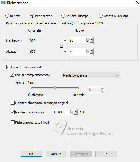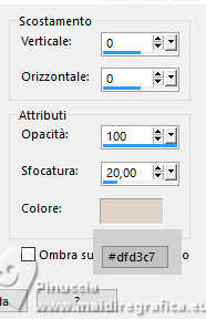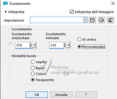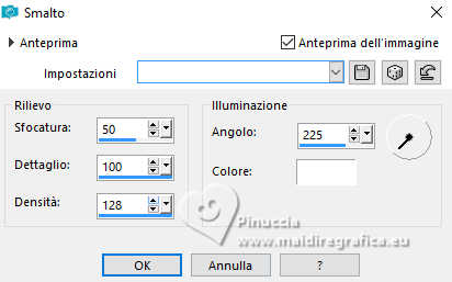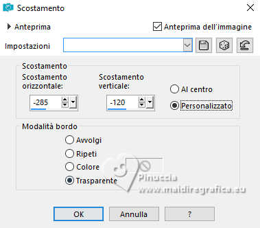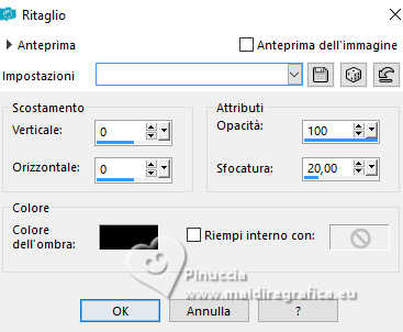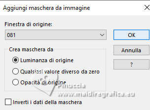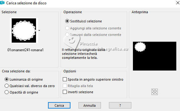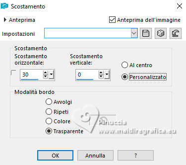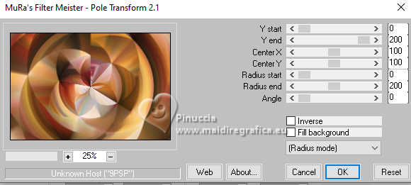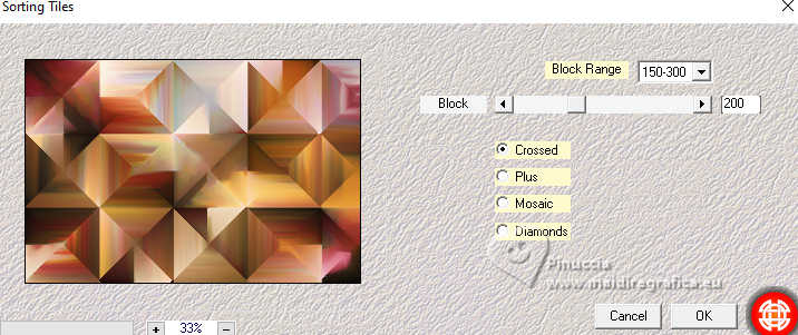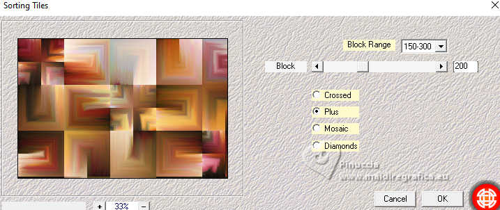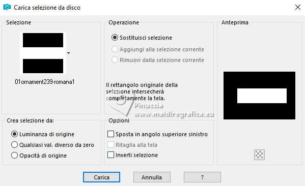 qui puoi trovare qualche risposta ai tuoi dubbi. Se l'argomento che ti interessa non è presente, ti prego di segnalarmelo. Questo tutorial è stato realizzato con PSP2020 e tradotto con PSPX9, ma può essere realizzato anche con le altre versioni di PSP. Dalla versione X4, il comando Immagine>Rifletti è stato sostituito con Immagine>Capovolgi in orizzontale, e il comando Immagine>Capovolgi con Immagine>Capovolgi in verticale. Nelle versioni X5 e X6, le funzioni sono state migliorate rendendo disponibile il menu Oggetti. Con la nuova versione X7, sono tornati Rifletti>Capovolgi, ma con nuove varianti. Vedi la scheda sull'argomento qui Occorrente: Tubes a scelta: 1 immagine 1 tube principale 1 tube accessori Il resto del materiale qui Per i tubes del mio esempio grazie Tammy's Welt (in questa pagina trovi i links ai siti dei creatori di tubes) Filtri: in caso di dubbi, ricorda di consultare la mia sezione filtri qui Mehdi - Sorting Tiles qui Flaming Pear - Flexify 2 qui Mura's Meister - Pole Transform qui ![]() non esitare a cambiare modalità di miscelatura e opacità secondo i colori utilizzati. ![]() Metti le selezioni nella cartella Selezioni. Apri la maschera 081 in PSP e minimizzala con il resto del materiale. 1. Apri una nuova immagine trasparente 900 x 600 pixels. Scegli due colori dal tuo tube Per l'esempio: Imposta il colore di primo piano con #b74133 e il colore di sfondo con #faf5ef ![]() 2. Selezione>Seleziona tutto. Apri la tua immagine di sfondo e vai a Modifica>Copia. Torna al tuo lavoro e vai a Modifica>Incolla nella selezione. Selezione>Deseleziona. 3. Effetti>Plugins>Mehdi - Sorting Tiles ![]() 4. Effetti>Plugins>Mehdi - Sorting Tiles. ![]() 5. Effetti>Plugins>Mura's Meister - Pole Transform. ![]() 6. Effetti>Effetti di riflesso>Specchio rotante. ![]() Livelli>Duplica. Immagine>Rifletti>Rifletti verticalmente (Immagine>Capovolgi). Abbassa l'opacità di questo livello al 50%. Livelli>Unisci>Unisci giù. 7. Selezione>Carica/Salva selezione>Carica selezione da disco. Cerca e carica la selezione 01ornament239-romana1 ![]() Selezione>Innalza selezione a livello. Selezione>Deseleziona. 8. Effetti>Plugins>Flaming Pear - Flexify 2. ![]() 9. Effetti>Effetti di immagine>Scostamento. ![]() 10. Effetti>Effetti 3D>Sfalsa ombra. ![]() 11. Livelli>Duplica. Immagine>Ridimensiona, all'85%, tutti i livelli non selezionato. ![]() 12. Effetti>Effetti di immagine>Scostamento. ![]() 13. Livelli>Duplica. Effetti>Effetti di immagine>Scostamento. ![]() 14. Livelli>Nuovo livello raster. Riempi il livello con il colore di sfondo.Livelli>Nuovo livello maschera>Da immagine. Apri il menu sotto la finestra di origine e vedrai la lista dei files aperti. Seleziona la maschera 081 ![]() Livelli>Unisci>Unisci gruppo. 15. Effetti>Effetti 3D>Sfalsa ombra, con un colore chiaro dell'immagine, per l'esempio #dfd3c7 ![]() Regola>Messa a fuoco>Metti a fuoco. 16. Livelli>Nuovo livello raster. Selezione>Carica/Salva selezione>Carica selezione da disco. Cerca e carica la selezione 01ornament240-romana1 ![]() Riempi la selezione con il colore di primo piano.Effetti>Effetti 3D>Sfalsa ombra. ![]() Selezione>Deseleziona. 17. Livelli>Nuovo livello raster. Selezione>Carica/Salva selezione>Carica selezione da disco. Cerca e carica la selezione 01ornament241-romana1 ![]() Modifica>Incolla nella selezione - la tua immagine di sfondo è ancora in memoria. Regola>Messa a fuoco>Accentua Messa a fuoco. Livelli>Disponi>Sposta giù. Selezione>Deseleziona. 18. Attiva il livello superiore. Apri il tuo tube accessorio e vai a Modifica>Copia. Torna al tuo lavoro e vai a Modifica>Incolla come nuovo livello. Immagine>Ridimensiona, se e quanto necessario. Regola>Messa a fuoco>Metti a fuoco. Sposta il tube in basso a sinistra.Effetti>Effetti 3D>Sfalsa ombra. ![]() 19. Selezione>Seleziona tutto. Immagine>Aggiungi bordatura, 1 pixel, simmetriche, colore di sfondo #faf5ef. Immagine>Aggiungi bordatura, 15 pixels, simmetriche, colore di primo piano #b74133. Immagine>Aggiungi bordatura, 15 pixels, simmetriche, colore di sfondo #faf5ef. Immagine>Aggiungi bordatura, 1 pixel, simmetriche, colore di primo piano #b74133. Selezione>Inverti. 20. Effetti>Effetti artistici>Smalto. ![]() 21. Effetti>Effetti 3D>Ritaglio ![]() Selezione>Deseleziona. 22. Apri il tuo tube principale e vai a Modifica>Copia. Torna al tuo lavoro e vai a Modifica>Incolla come nuovo livello. Immagine>Ridimensiona, se e quanto necessario, tutti i livelli non selezionato. Regola>Messa a fuoco>Metti a fuoco. Sposta il tube a destra.Effetti>Effetti 3D>Sfalsa ombra, colore nero. ![]() 23. Attiva lo strumento Testo ![]() scegli un font e scrivi il tuo testo; io ho scritto Autumn Love Posiziona il testo a tuo piacimento. 24. Effetti>Effetti 3D>Sfalsa ombra. ![]() 25. Attiva nuovamente lo strumento Testo e scrivi il tuo nome o aggiungi il tuo watermark. Effetti>Effetti 3D>Sfalsa ombra, a scelta. 26. Immagine>Aggiungi bordatura, 1 pixel, simmetriche, colore di primo piano #b74133. Salva in formato jpg. Per i tubes di questo esempio grazie Additive Pleasures. ![]() ![]() Le vostre versioni. Grazie ![]() Diana ![]() Se hai problemi o dubbi, o trovi un link non funzionante, o anche soltanto per un saluto, scrivimi. |