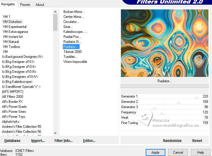 qui puoi trovare qualche risposta ai tuoi dubbi. Se l'argomento che ti interessa non è presente, ti prego di segnalarmelo. Questo tutorial è stato realizzato con PSP2020 e tradotto con PSPX9, ma può essere realizzato anche con le altre versioni di PSP. Dalla versione X4, il comando Immagine>Rifletti è stato sostituito con Immagine>Capovolgi in orizzontale, e il comando Immagine>Capovolgi con Immagine>Capovolgi in verticale. Nelle versioni X5 e X6, le funzioni sono state migliorate rendendo disponibile il menu Oggetti. Con la nuova versione X7, sono tornati Rifletti>Capovolgi, ma con nuove varianti. Vedi la scheda sull'argomento qui Occorrente: Tubes a scelta: 1 tube principale 6 tube accessori 2 immagini di sfondo Il resto del materiale qui Per il tube e gli elementi scrap del mio esempio grazie MyTaggingAddiction. (in questa pagina trovi i links ai siti dei creatori di tubes) Filtri: in caso di dubbi, ricorda di consultare la mia sezione filtri qui Filters Unlimited 2.0 qui Flaming Pear - Flexify 2 qui VM Distortion - Radiator qui VM Toolbox - Tiler qui Texturizer - Raw Canvas qui Mura's Meister - Perspective Tiling qui I filtri VM Distortion e VM Toolbox si possono usare da soli o importati in Filters Unlimited (come fare vedi qui) Se un filtro fornito appare con questa icona ![]() non esitare a cambiare modalità di miscelatura e opacità secondo i colori utilizzati. ![]() Metti la trama nella cartella Trame. Metti le selezioni nella cartella Selezioni. 1. Apri una nuova immagine trasparente 900 x 700 pixels. Scegli due colori dal tuo tube Per l'esempio: Imposta il colore di primo piano con #3dd3f6 e il colore di sfondo con #fdc334 ![]() 2. Selezione>Seleziona tutto. Apri la tua immagine di sfondo e vai a Modifica>Copia. Torna al tuo lavoro e vai a Modifica>Incolla nella selezione. Selezione>Deseleziona. 3. Effetti>Plugins>Filters Unlimited 2.0 - VM Distortion - Radiator. ![]() 4. Effetti>Plugins>Filters Unlimited 2.0 - VM Toolbox - Tiler. ![]() 5. Effetti>Effetti di trama>Manto. ![]() Effetti>Effetti di bordo>Aumenta. 6. Livelli>Nuovo livello raster. Selezione>Carica/Salva selezione>Carica selezione da disco. Cerca e carica la selezione 01ornament178-romana1 ![]() Riempi la selezione con il colore di primo piano.7. Effetti>Plugins>Filters Unlimited 2.0 - Texturizer - Raw Canvas. ![]() 8. Selezione>Modifica>Contrai - 2 pixels. Riempi la selezione con il colore di sfondo.Effetti>Plugins>Filters Unlimited 2.0 - Texturizer - Raw Canvas, con i settaggi precedenti. ![]() 9. Effetti>Effetti 3D>Sfalsa ombra, colore nero. ![]() Selezione>Deseleziona. 10. Effetti>Plugins>Flaming Pear - Flexify 2. ![]() 11. Immagine>Ruota per gradi - 40 gradi a sinistra ![]() Livelli>Duplica. Immagine>Rifletti>Rifletti orizzontalmente. Livelli>Unisci>Unisci giù. 12. Immagine>Ridimensiona, all'80%, tutti i livelli non selezionato. ![]() 13. Livelli>Nuovo livello raster. Selezione>Carica/Salva selezione>Carica selezione da disco. Cerca e carica la selezione 01ornament179-romana1 ![]() Apri la tua seconda immagine di sfondo e vai a Modifica>Copia. Torna al tuo lavoro e vai a Modifica>Incolla nella selezione. Regola>Messa a fuoco>Metti a fuoco. Livelli>Disponi>Sposta giù. 14. Attiva nuovamente il livello superiore. Effetti>Effetti 3D>Sfalsa ombra, colore nero. ![]() Selezione>Deseleziona. 15. Livelli>Nuovo livello raster. Selezione>Carica/Salva selezione>Carica selezione da disco. Cerca e carica la selezione 01ornament180-romana1 ![]() Riempi la selezione con il colore di primo piano.16. Selezione>Modifica>Contrai - 2 pixels. Riempi la selezione con il colore di sfondo.Selezione>Deseleziona. Effetti>Plugins>Filters Unlimited 2.0 - Texturizer - Raw Canvas, con i settaggi precedenti. ![]() 17. Livelli>Nuovo livello raster. Selezione>Carica/Salva selezione>Carica selezione da disco. Cerca e carica la selezione 01ornament181-romana1 ![]() Riempi la selezione con il colore di sfondo.18. Effetti>Effetti di trama>Trama - seleziona la trama misc 8. ![]() Livelli>Disponi>Sposta giù. Selezione>Deseleziona. 19. Attiva nuovamente il livello superiore. Effetti>Effetti 3D>Sfalsa ombra, colore nero. ![]() Copia/Incolla come nuovo livello i 4 tubes accessori da inserire nei rombi (per l'esempio pappagalli). Immagine>Ridimensiona, quanto necessario . Regola>Messa a fuoco>Metti a fuoco. Effetti>Effetti 3D>Sfalsa ombra, con i settaggi precedenti. ![]() 20. Attiva il livello Raster 1. Livelli>Duplica. Effetti>Plugins>Mura's Meister - Perspective Tiling. ![]() 21. Attiva il livello superiore. Apri un altro tube accessorio (per l'esempio ho usato una radio) Immagine>Ridimensiona, quanto necessario. Regola>Messa a fuoco>Metti a fuoco. Sposta il tube in basso a sinistra.Effetti>Effetti 3D>Sfalsa ombra, colore nero. ![]() 22. Apri l'ultimo tube accessorio (un testo) e vai a Modifica>Copia. Torna al tuo lavoro e vai a Modifica>incolla come nuovo livello. immagine>Ridimensiona, quanto necessario. Regola>Messa a fuoco>Metti a fuoco. Spostalo in alto a sinistra.Effetti>Effetti 3D>Sfalsa ombra, colore nero. ![]() 23. Immagine>Aggiungi bordarura, 3 pixels, simmetriche, colore di sfondo #fdc334. Immagine>Aggiungi bordatura, 3 pixels, simmetriche, colore di primo piano #3dd3f6. Immagine>Aggiungi bordatura, 3 pixels, simmetriche, colore di sfondo #fdc334. Immagine>Aggiungi bordatura, 15 pixels, simmetriche, colore di primo piano #3dd3f6. Immagine>Aggiungi bordatura, 3 pixels, simmetriche, colore di sfondo #fdc334. Immagine>Aggiungi bordatura, 3 pixels, simmetriche, colore di primo piano #3dd3f6. Immagine>Aggiungi bordatura, 3 pixels, simmetriche, colore di sfondo #fdc334. 24. Apri il tuo tube principale e vai a Modifica>Copia. Torna al tuo lavoro e vai a Modifica>incolla come nuovo livello. immagine>Ridimensiona, quanto necessario. Regola>Messa a fuoco>Metti a fuoco. Spostalo a destra.Effetti>Effetti 3D>Sfalsa ombra, colore nero. ![]() 25. Attiva lo strumento Testo ![]() Scrivi il tuo nome o, se preferisci, aggiungi il tuo watermark. Effetti
