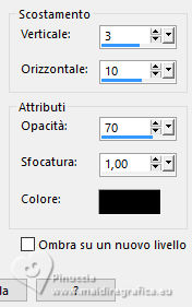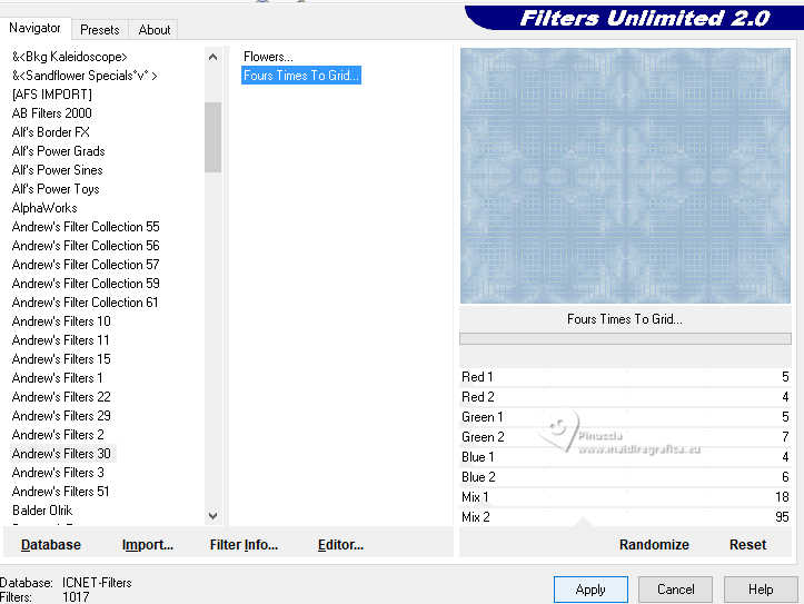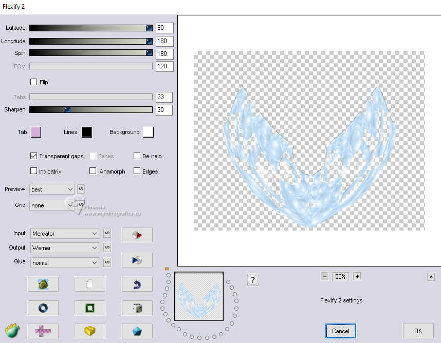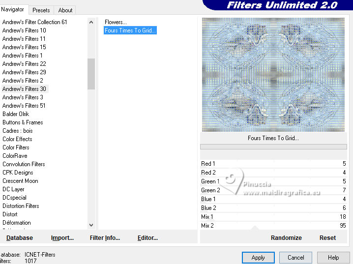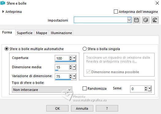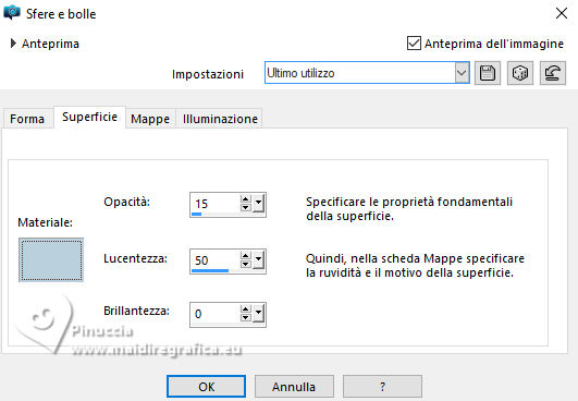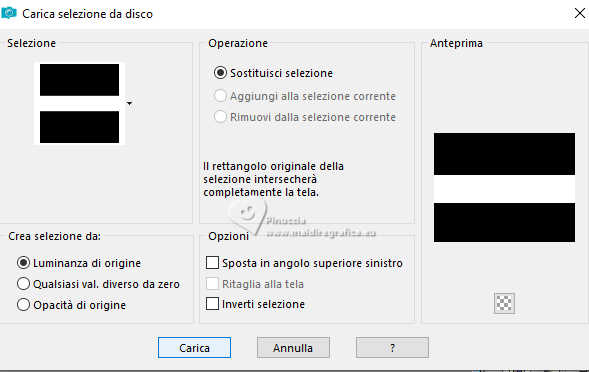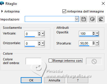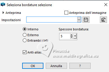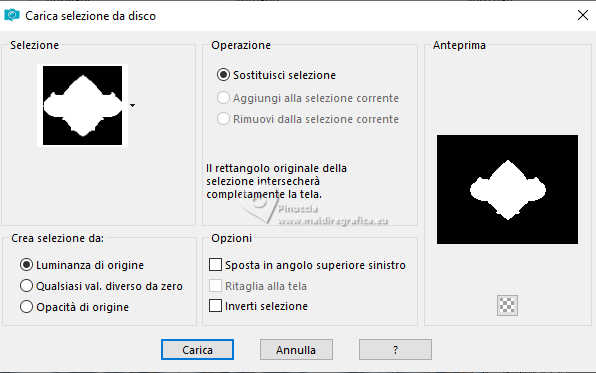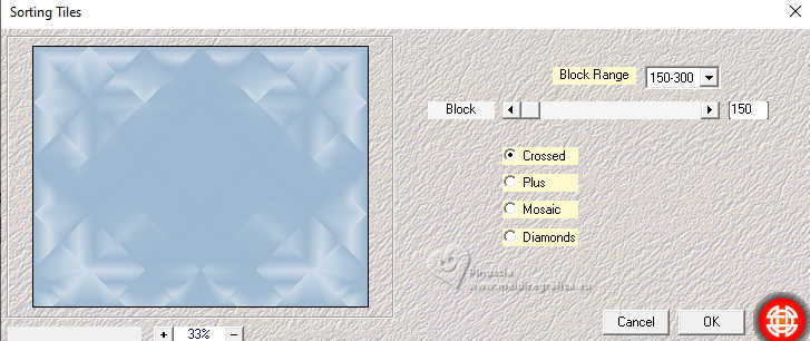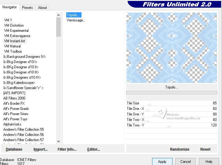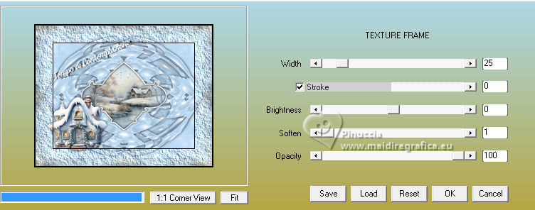 qui puoi trovare qualche risposta ai tuoi dubbi. Se l'argomento che ti interessa non è presente, ti prego di segnalarmelo. Questo tutorial è stato realizzato con PSP2020 e tradotto con PSPX9, ma può essere realizzato anche con le altre versioni di PSP. Dalla versione X4, il comando Immagine>Rifletti è stato sostituito con Immagine>Capovolgi in orizzontale, e il comando Immagine>Capovolgi con Immagine>Capovolgi in verticale. Nelle versioni X5 e X6, le funzioni sono state migliorate rendendo disponibile il menu Oggetti. Con la nuova versione X7, sono tornati Rifletti>Capovolgi, ma con nuove varianti. Vedi la scheda sull'argomento qui Occorrente: Tubes a scelta: 1 tube principale 1 tube accessorio 1 immagine di sfondo Il resto del materiale qui (in questa pagina trovi i links ai siti dei creatori di tubes) Filtri: in caso di dubbi, ricorda di consultare la mia sezione filtri qui Filters Unlimited 2.0 qui Mehdi - Sorting Tiles qui VM Instant Art - Tripolis qui Flaming Pear - Flexify 2 qui Andrew's Filter 30 - Fours Times to Grid qui AAA Frames - Texture Frame qui I filtri Andrew's e VM Instant Art si possono usare da soli o importati in Filters Unlimited (come fare vedi qui) Se un filtro fornito appare con questa icona ![]() non esitare a cambiare modalità di miscelatura e opacità secondo i colori utilizzati. Nelle ultime versioni di PSP non c'è il gradiente di primo piano/sfondo (Corel_06_029) Puoi usare i gradienti delle versioni precedenti. Trovi qui i gradienti Corel X. ![]() Metti le selezioni nella cartella Selezioni. 1. Apri una nuova immagine trasparente 900 x 700 pixels. Scegli due colori dal tuo tube Per l'esempio: Imposta il colore di primo piano con #9eb8d0, e il colore di sfondo con #ffffff ![]() 2. Passa il colore di primo piano a Gradiente di primo piano/sfondo, stile Rettangolare. ![]() Riempi l'immagine trasparente con il gradiente.3. Effetti>Effetti di immagine>Motivo unico, con i settaggi standard. ![]() 4. Effetti>Effetti di riflesso>Specchio rotante. ![]() Livelli>Duplica. Immagine>Rifletti>Rifletti verticalmente (Immagine>Capovolgi). Abbassa l'opacità di questo livello al 50%. Livelli>Unisci>Unisci giù. 5. Effetti>Plugins>Mehdi - Sorting Tiles. ![]() 6. Effetti>Plugins>Filters Unlimited 2.0 - Andrew's Filter 30 - Fours Times To Grid, con i settaggi standard. ![]() 7. Eventualmente, se trovi che la tua immagine è troppo scura: Regola>Luminosità e contrasto>Luminosità e contrasto ![]() 8. Copia questo livello di sfondo: Modifica>Copia. Livelli>Nuovo livello raster. Selezione>Carica/Salva selezione>Carica selezione da disco. Cerca e carica la selezione 01ornament52-romana1 ![]() Modifica>Incolla nella selezione. Selezione>Deseleziona. 9. Effetti>Effetti geometrici>Inclina. ![]() Livelli>Duplica. Immagine>Rifletti>Rifletti orizzontalmente (Immagine>Rifletti). Livelli>Unisci>Unisci giù. 10. Effetti>Plugins>Filters Unlimited 2.0 - VM Instant Art - Tripolis. ![]() 11. Effetti>Effetti artistici>Sfere e Bolle. ![]() Superficie: imposta il tuo colore di primo piano. ![]() 12. Immagine>Ridimensiona, al 60%, tutti i livelli non selezionato. ![]() 13. Effetti>Plugins>Flaming Pear - Flexify 2. ![]() 14. Immagine>Ruota per gradi - 90 gradi a destra. ![]() 15. Effetti>Effetti di immagine>Scostamento. ![]() Livelli>Duplica. Immagine>Rifletti>Rifletti orizzontalmente (Immagine>Rifletti). Livelli>Unisci>Unisci giù. 16. Effetti>Effetti 3D>Sfalsa ombra, colore nero. ![]() 17. Livelli>Nuovo livello raster. Selezione>Carica/Salva selezione>Carica selezione da disco. Cerca e carica la selezione 01ornament63-romana1 ![]() 18. Apri la tua immagine di sfondo e vai a Modifica>Copia. Torna al tuo lavoro e vai a Modifica>Incolla nella selezione. Selezione>Modifica>Seleziona bordature selezione. ![]() Riempi la selezione con il colore di sfondo.Effetti>Effetti 3D>Sfalsa ombra, colore nero. ![]() 19. Effetti>Effetti 3D>Smusso a incasso. ![]() Selezione>Deseleziona. 20. Attiva lo strumento Testo ![]() scegli un font e scrivi il tuo testo tutorial originale: Besinnliche-Zeit per il mio esempio ho scritto Tempo di Contemplazione Posiziona il testo a tuo piacimento.Effetti>Effetti 3D>Sfalsa ombra, colore nero. ![]() 21. Apri il tuo tube accessorio, per il mio esempio una casetta. Modifica>Copia. Torna al tuo lavoro e vai a Modifica>Incolla come nuovo livello. Immagine>Ridimensiona, quanto necessario, tutti i livelli non selezionato. Regola>Messa a fuoco>Metti a fuoco. Sposta il tube in basso a sinistra.Effetti>Effetti 3D>Sfalsa ombra, colore nero. ![]() 22. Immagine>Aggiungi bordatura, 50 pixels, simmetriche, colore #ffffff. Selezione>Seleziona tutto. Immagine>Aggiungi bordatura, 50 pixels, simmetriche, colore di primo piano #9eb8d0 Effetti>Effetti di immagine>Motivo unico, con i settaggi standard. ![]() Selezione>Inverti. 23. Regola>Sfocatura>Sfocatura gaussiana - raggio 20. ![]() 24. Effetti>Plugins>Filters Unlimited 2.0 - Andrew's Filter 30 - Four Times To Grid, con i settaggi precedenti. ![]() Effetti>Plugins>AAA Frames - Texture Frame. ![]() 25. Effetti>Effetti 3D>Ritaglio, colore bianco. ![]() Selezione>Deseleziona. 26. Apri il tuo tube Modifica>Copia. Torna al tuo lavoro e vai a Modifica>Incolla come nuovo livello. Immagine>Ridimensiona, quanto necessario, tutti i livelli non selezionato. Regola>Messa a fuoco>Metti a fuoco. Sposta il tube a destra.Effetti>Effetti 3D>Sfalsa ombra, colore nero. ![]() 27. Attiva lo strumento Testo ![]() Scrivi il tuo nome o, se preferisci, aggiungi il tuo watermark. Effetti>Effetti 3D>Sfalsa ombra, a scelta. 28. Livelli>Unisci>Unisci tutto e salva in formato jpg. ![]() Se hai problemi o dubbi, o trovi un link non funzionante, o anche soltanto per un saluto, scrivimi. 16 Dicembre 2024 |