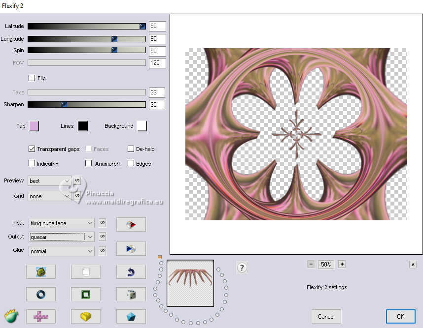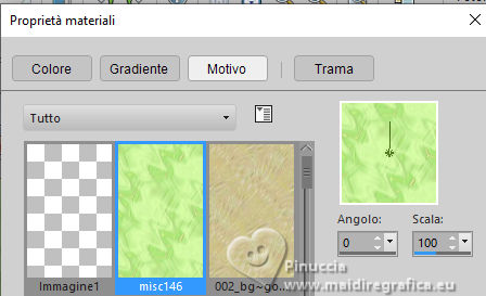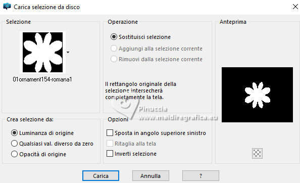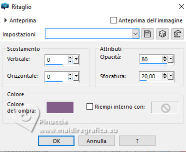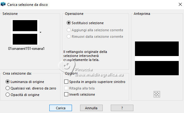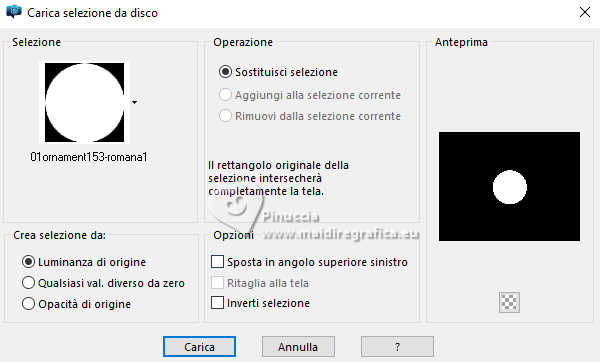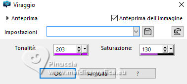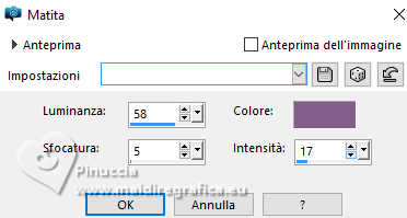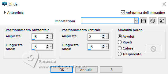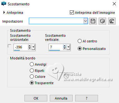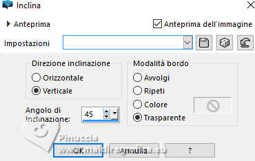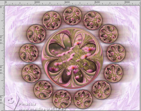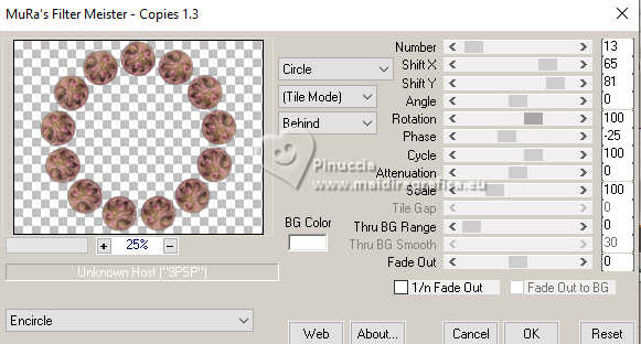 qui puoi trovare qualche risposta ai tuoi dubbi. Se l'argomento che ti interessa non è presente, ti prego di segnalarmelo. Questo tutorial è stato realizzato con PSP2020 e tradotto con PSPX9, ma può essere realizzato anche con le altre versioni di PSP. Dalla versione X4, il comando Immagine>Rifletti è stato sostituito con Immagine>Capovolgi in orizzontale, e il comando Immagine>Capovolgi con Immagine>Capovolgi in verticale. Nelle versioni X5 e X6, le funzioni sono state migliorate rendendo disponibile il menu Oggetti. Con la nuova versione X7, sono tornati Rifletti>Capovolgi, ma con nuove varianti. Vedi la scheda sull'argomento qui Occorrente: Tubes a scelta: 1 tube principale 1 immagine di sfondo. 1 tubes accessorio Il resto del materiale qui Per il mio esempio ho usato elementi scrap Aprilshareables. Grazie. (in questa pagina trovi i links ai siti dei creatori di tubes) Filtri: in caso di dubbi, ricorda di consultare la mia sezione filtri qui Flaming Pear - Flexify 2 qui Mura's Meister - Copies, Pole Transform qui ![]() non esitare a cambiare modalità di miscelatura e opacità secondo i colori utilizzati. ![]() Se non hai la maschera 20-20, metti quella fornita nella cartella Maschere. Metti le selezioni nella cartella Selezioni. Apri il motivo misc146 in PSP e minimizzalo con il resto del materiale. 1. Apri una nuova immagine trasparente 900 x 700 pixels. Scegli due colori dal tuo tube Per l'esempio: Imposta il colore di primo piano con #835e8b, e il colore di sfondo con #ffffff ![]() 2. Passa il colore di primo piano a Motivo e seleziona il motivo misc146 ![]() Riempi l'immagine trasparente con il motivo di primo piano.3. Regola>Tonalità e saturazione>Viraggio. ![]() 4. Effetti>Plugins>Mura's Meister - Pole Transform. ![]() 5. Effetti>Effetti di riflesso>Specchio rotante. ![]() 6. Livelli>Nuovo livello raster. Selezione>Carica/Salva selezione>Carica selezione da disco. Cerca e carica la selezione 01ornament151-romana1 ![]() Apri la tua immagine di sfondo. Modifica>Copia. Torna al tuo lavoro e vai a Modifica>Incolla nella selezione. Selezione>Deseleziona. 7. Effetti>Effetti geometrici>Inclina. ![]() Livelli>Duplica. Immagine>Rifletti>Rifletti orizzontalmente. Livelli>Unisci>Unisci giù. 8. Livelli>Duplica. Immagine>Ruota per gradi - 45 gradi a sinistra. ![]() Livelli>Unisci>Unisci giù. 9. Immagine>Ridimensiona, al 60%, tutti i livelli non selezionato. ![]() 10. Effetti>Plugins>Flaming Pear - Flexify 2 ![]() 11. Rimani su questo livello. Selezione>Carica/Salva selezione>Carica selezione da disco. Cerca e carica la selezione 01ornament152-romana1 ![]() Selezione>Inverti. Premi sulla tastiera il tasto CANC ![]() Selezione>Deseleziona. 12. Rimani sempre su questo livello. Selezione>Carica/Salva selezione>Carica selezione da disco. Cerca e carica la selezione 01ornament153-romana1 ![]() Premi sulla tastiera il tasto CANC. Selezione>Deseleziona. 13. Immagine>Ridimensiona, al 60%, tutti i livelli non selezionato. ![]() 14. Selezione>Carica/Salva selezione>Carica selezione da disco. Cerca e carica la selezione 01ornament154-romana1 ![]() Modifica>Incolla come nuovo livello - l'immagine di sfondo è sempre in memoria. 15. Eventualmente, se necessario, ridimensiona. Regola>Messa a fuoco>Metti a fuoco. Posiziona correttamente l'image.Selezione>Inverti. Premi sulla tastiera il tasto CANC. Selezione>Deseleziona. Livelli>Disponi>Sposta giù. 16. Attiva il livello superiore. Effetti>Effetti 3D>Sfalsa ombra, colore nero. ![]() Livelli>Unisci>Unisci giù. 17. Livelli>Duplica. Immagine>Ridimensiona, al 30%, tutti i livelli non selezionato. ![]() 18. Effetti>Plugins>Mura's Meister - Copies. ![]() Effetti>Effetti3 D>Sfalsa ombra, con i settaggi precedenti. ![]() Livelli>Duplica - 2 volte. 19. Attiva il livello originale dei piccoli cerchi. Effetti>Effetti di distorsione>Vento - da sinistra, intensità 100. ![]() 20. Attiva il livello soprastante della prima copia. Effetti>Effetti di distorsione>Vento - da destra, intensità 100. ![]() 21. Attiva il livello del grande cerchio centrale. Livelli>Disponi>Porta in alto. Dovresti avere questo: ![]() 22. Livelli>Nuovo livello raster. Selezione>Carica/Salva selezione>Carica selezione da disco. Cerca e carica la selezione 01ornament60-romana1 ![]() Passa il colore di primo piano a Colore. Riempi la selezione con il colore di primo piano.Selezione>Deseleziona. 23. Effetti>Effetti di distorsione>Onda. ![]() 24. Immagine>Ruota per gradi - 90 gradi a sinistra. ![]() 25. Effetti>Effetti di immagine>Scostamento. ![]() Livelli>Duplica. Immagine>Rifletti>Rifletti orizzontale. 26. Apri il tuo tube accessorio e vai a Modifica>Copia. Torna al tuo lavoro e vai a Modifica>Incolla come nuovo livello. Immagine>Ridimensiona, se necessario. Regola>Messa a fuoco>Metti a fuoco. Sposta il tube in basso a destra.Effetti>Effetti 3D>Sfalsa ombra, con i settaggi precedenti. ![]() 27. Selezione>Seleziona tutto. Immagine>Aggiungi bordatura, 10 pixels, simmetriche, colore #835e8b. Immagine>Aggiungi bordatura, 5 pixels, simmetriche, colore #ffffff. Immagine>Aggiungi bordatura, 10 pixels, simmetriche, colore #835e8b. Immagine>Aggiungi bordatura, 5 pixels, simmetriche, colore #ffffff. Immagine>Aggiungi bordatura, 10 pixels, simmetriche, colore #835e8b. Selezione>Inverti. 28. Effetti>Effetti tecniche di disegno>Matita. ![]() Selezione>Inverti. 29. Effetti>Effetti 3D>Ritaglio. ![]() Selezione>Deseleziona. 30. Apri il tuo tube principale e vai a Modifica>Copia. Torna al tuo lavoro e vai a Modifica>Incolla come nuovo livello. Immagine>Ridimensiona, se necessario. Regola>Messa a fuoco>Metti a fuoco. Sposta il tube a sinistra.Effetti>Effetti 3D>Sfalsa ombra, colore nero. ![]() 31. Attiva lo strumento Testo ![]() Scrivi il tuo nome o, se preferisci, aggiungi il tuo watermark. Effetti>Effetti 3D>Sfalsa ombra, a scelta. 32. Immagine>Aggiungi bordatura, 1 pixel, simmetriche, colore bianco #ffffff. Salva in formato jpg. Per il tube di questo esempio grazie Virginia ![]() ![]() Le vostre versioni.