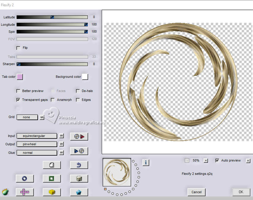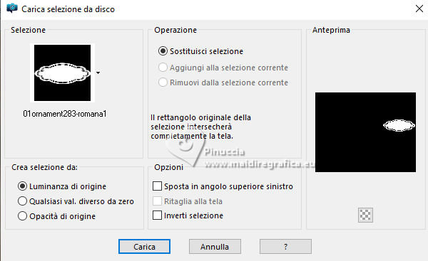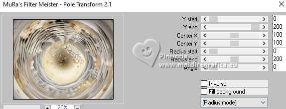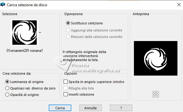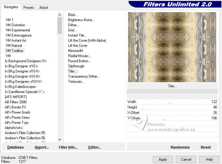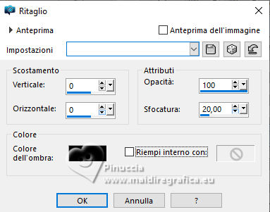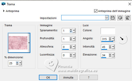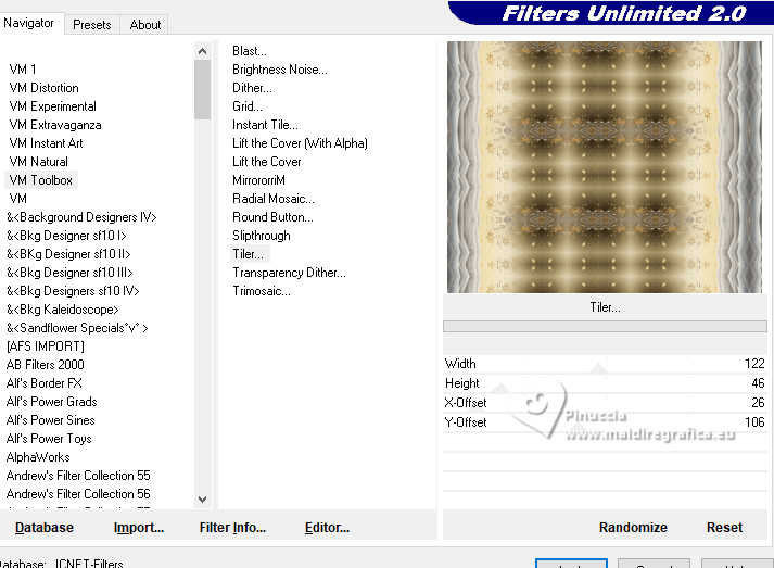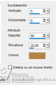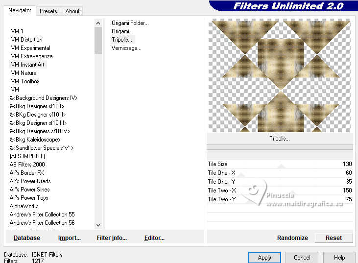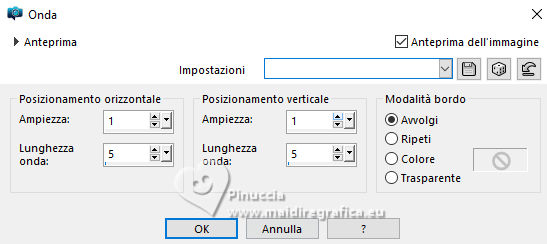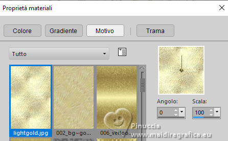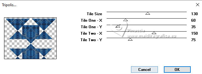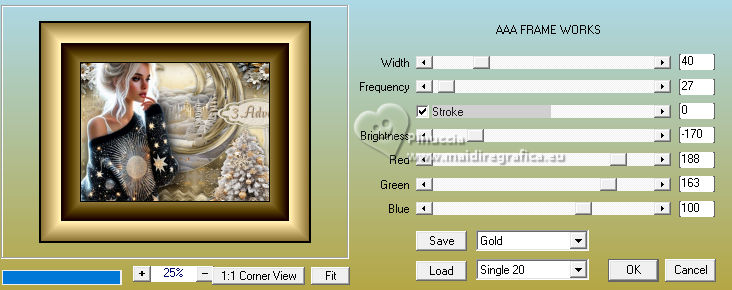 qui puoi trovare qualche risposta ai tuoi dubbi. Se l'argomento che ti interessa non è presente, ti prego di segnalarmelo. Questo tutorial è stato realizzato con PSP2020 e tradotto con PSPX9, ma può essere realizzato anche con le altre versioni di PSP. Dalla versione X4, il comando Immagine>Rifletti è stato sostituito con Immagine>Capovolgi in orizzontale, e il comando Immagine>Capovolgi con Immagine>Capovolgi in verticale. Nelle versioni X5 e X6, le funzioni sono state migliorate rendendo disponibile il menu Oggetti. Con la nuova versione X7, sono tornati Rifletti>Capovolgi, ma con nuove varianti. Vedi la scheda sull'argomento qui Occorrente: Tubes a scelta: 1 immagine di sfondo 1 tube principale 2 tubes accessori Il resto del materiale qui Esempi con miei tubes da immagini Pinterest Elementi scrap Blaque Heart Designz. Grazie. Filtri: in caso di dubbi, ricorda di consultare la mia sezione filtri qui Filters Unlimited 2.0 qui Flaming Pear - Flexify 2 qui Mura's Meister - Pole Transform, Perspective Tiling qui VM Toolbox - Instant Tile qui VM Instant Art - Tripolis qui AAA Frames - Texture Frame qui I filtri VM Toolbox e VM Instant Art si possono usare da soli o importati in Filters Unlimited (come fare vedi qui) Se un filtro fornito appare con questa icona ![]() non esitare a cambiare modalità di miscelatura e opacità secondo i colori utilizzati. ![]() Metti la trama nella cartella Trame. Metti le selezioni nella cartella Selezioni. Apri il motivo oro lightgold in PSP e minimizzalo con il resto del materiale. 1. Apri una nuova immagine trasparente 1000 x 800 pixels. Scegli due colori dal tuo tube. Per l'esempio: Imposta il colore di primo piano con #b38547. e il colore di sfondo con #e4dccf. ![]() 2. Selezione>Seleziona tutto. Apri la tua immagine di sfondo e vai a Modifica>Copia. Torna al tuo lavoro e vai a Modifica>Incolla nella selezione. Selezione>Deseleziona. 3. Effetti>Plugins>Mura's Meister - Pole Transform. ![]() 4. Effetti>Effetti di riflesso>Specchio rotante. ![]() 5. Effetti>Plugins>Filters Unlimited 2.0 - VM Toolbox - Tiler ![]() Ripeti l'Effetto una seconda volta. ![]() 6. Effetti>Effetti di immagine>Motivo unico, con i settaggi standard. ![]() 7. Livelli>Duplica. Immagine>Ridimensiona, al 50%, tutti i livelli non selezionato. ![]() 8. Effetti>Plugins>Filters Unlimited 2.0 - VM Instant Art - Tripolis ![]() nota: Unlimited non tiene in memoria i settaggi; se pensi di voler ripetere il tutorial, ti consiglio di usare il filtro da solo ![]() 9. Effetti>Plugins>Flaming Pear - Flexify 2 ![]() 10. Immagine>Ridimensiona, al 70%, tutti i livelli non selezionato. ![]() 11. Livelli>Nuovo livello raster. Selezione>Carica/Salva selezione>Carica selezione da disco. Cerca e carica la selezione 01ornament281-romana1 ![]() Se tutto è andato bene dovresti avere questo: ![]() Modifica>Incolla nella selezione - la tua immagine di sfondo è sempre in memoria. Regola>Messa a fuoco>Metti a fuoco. Livelli>Disponi>Sposta giù. Selezione>Deseleziona. 12. Attiva il livello superiore. Effetti>Effetti 3D>Sfalsa ombra, colore nero. ![]() Livelli>Unisci>Unisci giù. 13. Effetti>Effetti di immagine>Scostamento. ![]() 14. Attiva il livello Raster 1. Livelli>Duplica. Effetti>Plugins>Mura's Meister - Perspective Tiling ![]() Effetti>Effetti 3D>Sfalsa ombra, colore nero. ![]() 15. Passa il colore di primo piano a Motivi e seleziona il motivo lightgold con i seguenti settaggi: ![]() 16. Livelli>Nuovo livello raster. Selezione>Carica/Salva selezione>Carica selezione da disco. Cerca e carica la selezione 01ornament282-romana1 ![]() Riempi la selezione con il motivo oro.Selezione>Deseleziona. 17. Effetti>Effetti di distorsione>Onda. ![]() 18. Effetti>Effetti 3D>Sfalsa ombra, colore di primo piano. ![]() 19. Attiva il livello superiore. Livelli>Nuovo livello raster. Selezione>Carica/Salva selezione>Carica selezione da disco. Cerca e carica la selezione 01ornament283-romana1 ![]() Riempi la selezione con il motivo oro.20. Selezione>Modifica>Contrai - 1 pixel. Riempi la selezione con il colore di sfondo.Effetti>Effetti 3D>Sfalsa ombra, colore nero. ![]() 21. Effetti>Effetti di trama>Trama - seleziona la trama misc338 ![]() selezione>Deseleziona. 22. Attiva lo strumento testo ![]() scegli un font e scrivi il tuo testo. Io ho scritto 3.Advent Effetti>Effetti 3D>Sfalsa ombra, a scelta. Posiziona correttamente il testo nel banner.Livelli>Unisci>Unisci giù. Se necessario, puoi ancora spostare il banner a tuo piacimento.23. Apri il tuo primo tube accessorio (per me fiori) Modifica>Copia. Torna al tuo lavoro e vai a Modifica>Incolla come nuovo livello. Immagine>Ridimensiona, se necessario. Regola>Messa a fuoco>Metti a fuoco. Sposta il tube in alto a sinistra.Effetti>Effetti 3D>Sfalsa ombra, colore nero. ![]() Livelli>Duplica Immagine>Rifletti>Rifletti orizzontalmente. 24. Apri il tuo secondo tube accessorio (per me il libro) Modifica>Copia. Torna al tuo lavoro e vai a Modifica>Incolla come nuovo livello. Immagine>Ridimensiona, se necessario. Regola>Messa a fuoco>Metti a fuoco. Sposta il tube in basso a destra.Effetti>Effetti 3D>Sfalsa ombra, colore nero. ![]() 25. Apri il tuo tube principale e vai a Modifica>Copia. Torna al tuo lavoro e vai a Modifica>Incolla come nuovo livello. Immagine>Ridimensiona, se necessario. Regola>Messa a fuoco>Metti a fuoco. Sposta il tube a sinistra.Effetti>Effetti 3D>Sfalsa ombra, colore nero. ![]() 26. Selezione>Seleziona tutto. Immagine>Aggiungi bordatura, 40 pixels, simmetriche, colore di primo piano #b38547. Selezione>Inverti. Effetti>Plugins>AAA Frames - Frame Works ![]() regola i colori in base ai tuoi - vedi le mie versioni 27. Selezione>Inverti. Effetti>Effetti 3D>Ritaglio. ![]() Selezione>Deseleziona. 28. Attiva lo strumento Testo , scegli un font,Scrivi il tuo nome, o aggiungi il tuo watermark. Effetti>Effetti 3D>Sfalsa ombra, a scelta. 29. Immagine>Aggiungi bordatura, 1 pixel, simmetriche, colore di primo piano #b38547. Firma il tuo lavoro e salva in formato jpg. ![]() ![]()