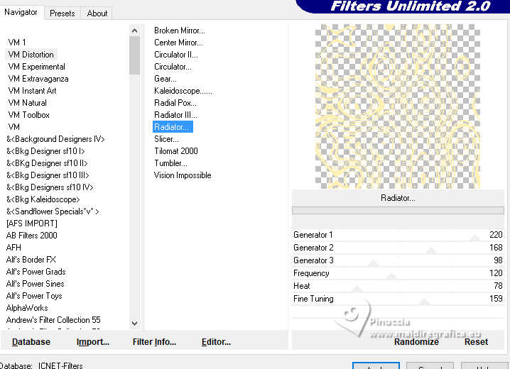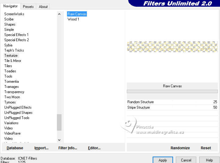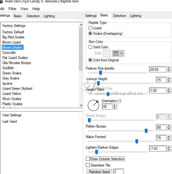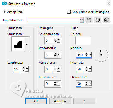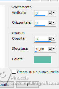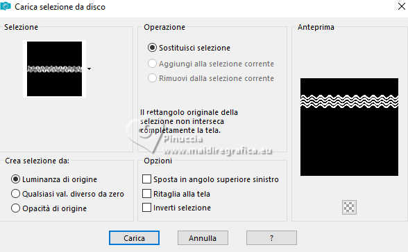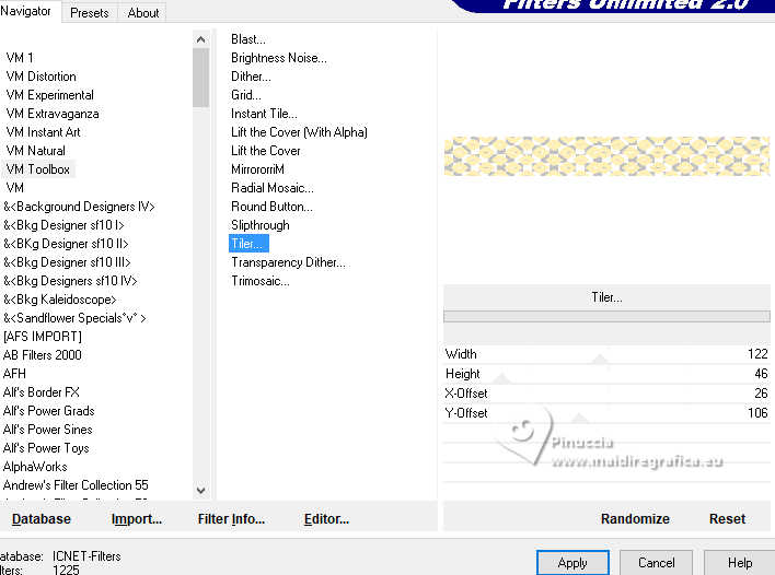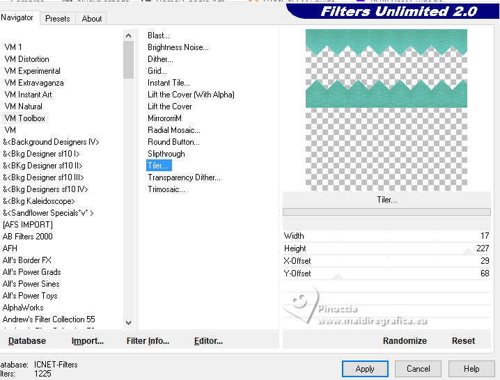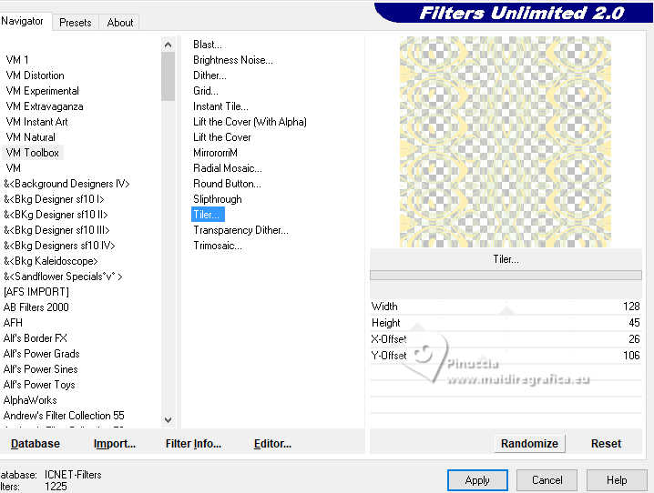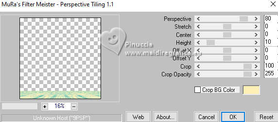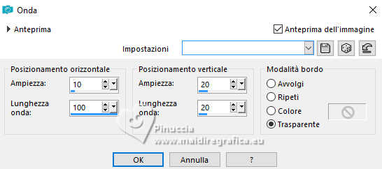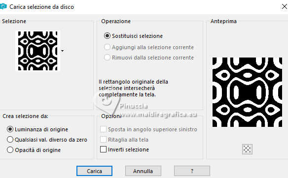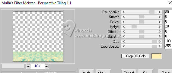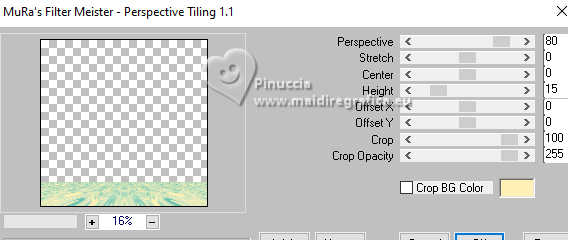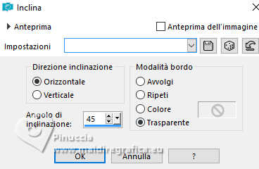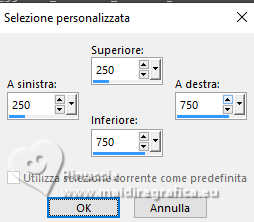 qui puoi trovare qualche risposta ai tuoi dubbi. Se l'argomento che ti interessa non è presente, ti prego di segnalarmelo. Questo tutorial è stato realizzato con PSP2020 e tradotto con PSPX9, ma può essere realizzato anche con le altre versioni di PSP. Dalla versione X4, il comando Immagine>Rifletti è stato sostituito con Immagine>Capovolgi in orizzontale, e il comando Immagine>Capovolgi con Immagine>Capovolgi in verticale. Nelle versioni X5 e X6, le funzioni sono state migliorate rendendo disponibile il menu Oggetti. Con la nuova versione X7, sono tornati Rifletti>Capovolgi, ma con nuove varianti. Vedi la scheda sull'argomento qui Occorrente: 1 Immagine 1 tube 2-3 tubes accessori Il resto del materiale ![]() Per il tube del mio esempio grazie Virginia. In questa pagina trovi i links ai siti dei creatori di tubes) Filtri: in caso di dubbi, ricorda di consultare la mia sezione filtri qui Filters Unlimited 2.0 qui VM Toolbox - Tiler qui VM Distortion - Radiator qui Alien Skin Eye Candy 5 Textures - Reptile Skin qui Texturizer - Raw Canvas qui Mura's Meister - Perspective Tiling qui I filtri VM Instant Art si possono usare da soli o importati in Filters Unlimited (come fare vedi qui) Se un filtro fornito appare con questa icona ![]() non esitare a cambiare modalità di miscelatura e opacità secondo i colori utilizzati. ![]() Metti le selezioni nella cartella Selezioni. 1. Apri una nuova immagine trasparente 1000 x 1000 pixels. Scegli due colori dal tuo tube, per l'esempio colore di primo piano #60bba9 colore di sfondo #fff0b5. ![]() 2. Selezione>Seleziona tutto. Apri la tua immagine di sfondo o usa lo sfondo rom-hin-11 (che puoi colorizzare) Modifica>Copia. Torna al tuo lavoro e vai a Modifica>Incolla nella selezione. Selezione>Deseleziona. 3. Livelli>Nuovo livello raster. Selezione>Carica/Salva selezione>Carica selezione da disco. Cerca e carica la selezione 01ornament337-romana1 ![]() Riempi la selezione con il colore di primo piano.Selezione>Inverti. Riempi la selezione con il colore di sfondo.Selezione>Deseleziona. 4. Effetti>Effetti di immagine>Motivo unico, con i settaggi standard. ![]() Abbassa l'opacità di questo livello al 50%. Livelli>Unisci>Unisci giù. Regola>Messa a fuoco>Metti a fuoco. 5. Livelli>Nuovo livello raster. Selezione>Carica/Salva selezione>Carica selezione da disco. Carica nuovamente la selezione 01ornament337-romana1 ![]() Riempi con il colore di sfondo.Selezione>Deseleziona. 6. Effetti>Effetti di distorsione>Onda. ![]() 7. Effetti>Plugins>Filters Unlimited 2.0 - VM Distortion - Radiator. ![]() 8. Effetti>Effetti 3D>Sfalsa ombra, colore di primo piano. ![]() 9. Effetti>Plugins>Filters Unlimited 2.0 - VM Toolbox - Tiler ![]() Livelli>Unisci>Unisci giù. 10. Livelli>Nuovo livello raster. Attiva lo strumento Selezione ![]() (non importa il tipo di selezione impostato, perchè con la selezione personalizzata si ottiene sempre un rettangolo) clicca sull'icona Selezione personalizzata ![]() e imposta i seguenti settaggi. ![]() Riempi la selezione con il colore di primo piano.11. Effetti>Plugins>Alien Skin Eye Candy 5 Textures - Reptile Skin. ![]() Selezione>Deseleziona. Livelli>Duplica. Immagine>Rifletti>Rifletti orizzontalmente. Abbassa l'opacità di questo livello al 50%. Livelli>Unisci>Unisci giù. Effetti>Effetti di bordo>Aumenta. 12. Effetti>Effetti geometrici>Inclina. ![]() Livelli>Duplica. Immagine>Rifletti>Rifletti orizzontalmente. Livelli>Unisci>Unisci giù. 13. Effetti>Plugins>Filters Unlimited 2.0 - VM Toobox - Tiler. ![]() Effetti>Effetti 3D>Sfalsa ombra, colore nero. ![]() 14. Livelli>Nuovo livello raster. Selezione>Carica/Salva selezione>Carica selezione da disco. Cerca e carica la selezione 01ornament338-romana1 ![]() Riempi la selezione con il colore di sfondo.15. Effetti>Plugins>Filters Unlimited 2.0 - VM Toolbox - Tiler ![]() 16. Effetti>Plugins>Filters Unlimited 2.0 - Texturize - Raw Canvas. ![]() Effetti>Effetti 3D>Sfalsa ombra, colore nero. ![]() 17. Attiva il livello Raster 1. Livelli>Duplica. Effetti>Plugins>Mura's Meister - Perspective Tiling. ![]() Effetti>Effetti 3D>Sfalsa ombra, colore nero. ![]() 18. Attiva nuovamente il livello Raster 1. Livelli>Duplica. Effetti>Plugins>Mura's Meister - Perspective Tiling. ![]() Livelli>Disponi>Sposta su. Effetti>Effetti 3D>Sfalsa ombra, con i settaggi precedenti. ![]() 19. Attiva nuovamente il livello Raster 1. Livelli>Duplica. Effetti>Plugins>Mura's Meister - Perspective Tiling. ![]() Livelli>Disponi>Sposta su - 2 volte. Effetti>Effetti 3D>Sfalsa ombra, con i settaggi precedenti. ![]() 20. Attiva il livello superiore. Copia/Incolla come nuovo livello i tuoi 2-3 tubes accessori. Ridimensiona e posiziona a tuo piacimento. Regola>Messa a fuoco>Metti a fuoco. Effetti>Effetti 3D>Sfalsa ombra, colore nero. ![]() 21. Apri il tuo tube principale e vai a Modifica>Copia. Torna al tuo lavoro e vai a Modifica>Incolla come nuovo livello. Immagine>Ridimensiona, se necessario. Posiziona il tube al centro.Regola>Messa a fuoco>Metti a fuoco. Effetti>Effetti 3D>Sfalsa ombra, colore nero. ![]() 22. Attiva lo strumento Testo , scegli un font,scrivi il tuo testo e posizionalo a tuo piacimento. Effetti>Effetti 3D>Sfalsa ombra, a scelta. 23. Selezione>Seleziona tutto. Immagine>Aggiungi bordatura, 30 pixels, simmetriche, colore di #60bba9. Selezione>Inverti. Effetti>Plugins>Alien Skin Eye Candy 5 Textures - Reptile Skin, con i settaggi precedenti. ![]() Effetti>Effetti di bordo>Aumenta. 24. Copia questa cornice: Modifica>Copia. Livelli>Nuovo livello raster. Modifica>Incolla nella selezione. Selezione>Deseleziona. Immagine>Rifletti>Rifletti orizzontalmente. Abbassa l'opacità di questo livello al 50%. Livelli>Unisci>Unisci giù. Effetti>Effetti di bordo>Aumenta. 25. Selezione>Seleziona tutto. Selezione>Modifica>Contrai - 30 pixels. Selezione>Inverti. Effetti>Effetti 3D>Smusso a incasso. ![]() Selezione>Inverti. 26. Effetti>Effetti 3D>Ritaglio. ![]() Selezione>Deseleziona. 27. Attiva lo strumento Testo ![]() Scrivi il tuo nome