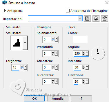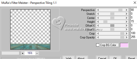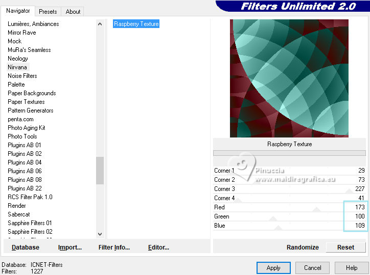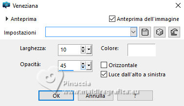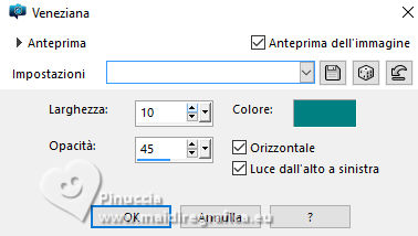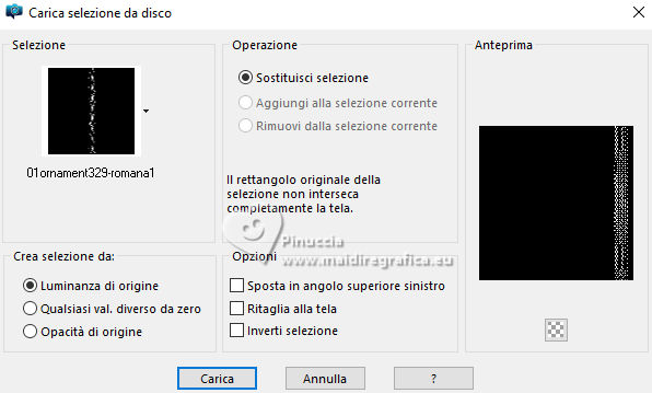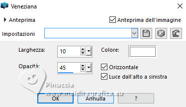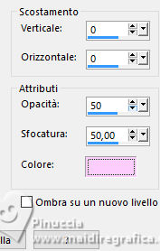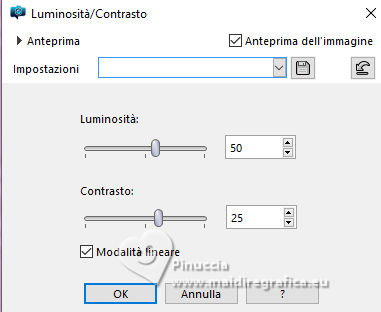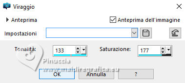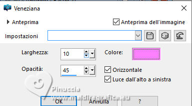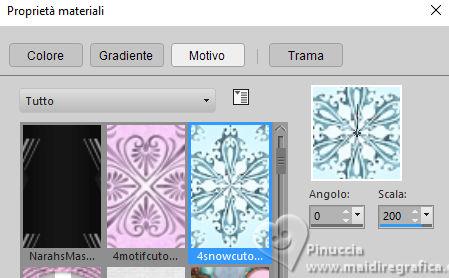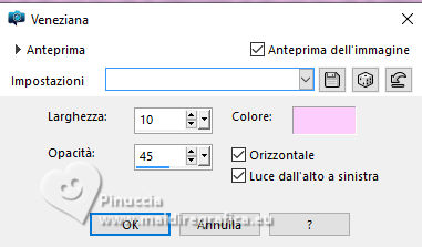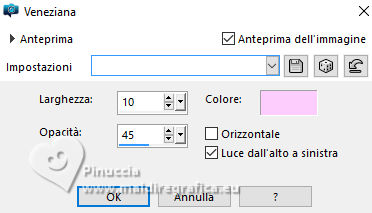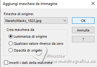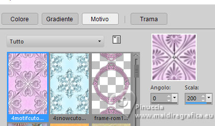 qui puoi trovare qualche risposta ai tuoi dubbi. Se l'argomento che ti interessa non è presente, ti prego di segnalarmelo. Questo tutorial è stato realizzato con PSP2020 e tradotto con PSPX9, ma può essere realizzato anche con le altre versioni di PSP. Dalla versione X4, il comando Immagine>Rifletti è stato sostituito con Immagine>Capovolgi in orizzontale, e il comando Immagine>Capovolgi con Immagine>Capovolgi in verticale. Nelle versioni X5 e X6, le funzioni sono state migliorate rendendo disponibile il menu Oggetti. Con la nuova versione X7, sono tornati Rifletti>Capovolgi, ma con nuove varianti. Vedi la scheda sull'argomento qui Occorrente: 1 tube 1 tube accessorio Eventualmente una immagine di sfondo Il resto del materiale ![]() Per i tubes del mio esempio grazie Virginia In questa pagina trovi i links ai siti dei creatori di tubes) Filtri: in caso di dubbi, ricorda di consultare la mia sezione filtri qui Filters Unlimited 2.0 qui Nirvana - Raspberry Texture qui Mura's Meister - Perspective Tiling qui I filtri Nirvana si possono usare da soli o importati in Filters Unlimited (come fare vedi qui) Se un filtro fornito appare con questa icona ![]() non esitare a cambiare modalità di miscelatura e opacità secondo i colori utilizzati. ![]() Metti la selezione nella cartella Selezione. Apri le maschere e le trame in PSP e minimizzale con il resto del materiale. 1. Apri una nuova immagine trasparente 1000 x 1000 pixels. Scegli due colori dal tuo tube, per l'esempio colore di primo piano #9de3ed colore di sfondo #fccefc. ![]() 2. Selezione>Seleziona tutto. Per creare lo sfondo ho usato un'immagine: Apri la tua immagine e vai a Modifica>Copia. Torna al tuo lavoro e vai a Modifica>Incolla nella selezione. Se preferisci puoi usare una delle due trama fornite: ![]() ![]() Riempi l'immagine trasparente con la trama sceltaSelezione>Deselezione. 3. Livelli>Duplica. Effetti>Plugins>Filters Unlimited 2.0 - Nirvana - Raspberry Texture ![]() Se usi colori diversi, sperimenta con le combinazioni di colori. 4. Regola>Tonalità e saturazione>Viraggio ![]() 5. Eventualmente, se trovi l'immagine troppo scura: Regola>Luminosità e contrasto>Luminosità e contrasto ![]() 6. Livelli>Duplica. Immagine>Rifletti>Rifletti orizzontalmente. Abbassa l'opacità di questo livello al 50%. Livelli>Unisci>Unisci giù. Livelli>Duplica. Immagine>Rifletti>Rifletti verticalmente (Immagine>Capovolgi). Abbassa l'opacità di questo livello al 50%. Livelli>Unisci>Unisci giù. Abbassa l'opacità di questo livello al 50%. Livelli>Unisci>Unisci giù. Effetti>Effetti di bordo>Aumenta. Ora hai un solo livello ![]() 7. Livelli>Nuovo livello raster. Riempi il livello con il colore di primo piano.Livelli>Nuovo livello maschera>Da immagine. Apri il menu sotto la finestra di origine e vedrai la lista dei files aperti. Seleziona la maschera Narah_Mask_1443 ![]() Livelli>Unisci>Unisci gruppo. Livelli>Duplica. Livelli>Unisci>Unisci giù. 8. Effetti>Effetti di trama>Veneziana, con un colore più scuro del colore di sfondo; per l'esempio #008080. ![]() 9. Effetti>Effetti 3D>Sfalsa ombra, colore di primo piano. ![]() Effetti>Effetti di bordo>Aumenta. 10. Livelli>Nuovo livello raster. Riempi il livello con il colore di sfondo.Livelli>Nuovo livello maschera>Da immagine. Apri il menu sotto la finestra di origine e seleziona la maschera NarahsMask_1822 ![]() Livelli>Unisci>Unisci gruppo. Livelli>Duplica. Livelli>Unisci>Unisci giù. 11. Effetti>Effetti di trama>Veneziana, con i settaggi precedenti, ma con un colore più scuro del colore di primo piano; per l'esempio #fe80fe ![]() 12. Effetti>Effetti 3D>Sfalsa ombra, con i settaggi precedenti, ma colore di sfondo. ![]() Effetti>Effetti di bordo>Aumenta. 13. Livelli>Nuovo livello raster. Selezione>Carica/Salva selezione>Carica selezione da disco. Cerca e carica la selezione 01ornament329-romana1 ![]() Riempi la selezione con il colore di primo piano.14. Effetti>Effetti 3D>Sfalsa ombra, colore nero. ![]() Selezione>Deseleziona. Livelli>Duplica. Immagine>Rifletti>Rifletti orizzontalmente. 15. Attiva il livello Raster 1. Livelli>Duplica. Effetti>Plugins>Mura's Meister - Perspective Tiling. ![]() Effetti>Effetti 3D>Sfalsa ombra, colore nero. ![]() Livelli>Disponi>Porta in alto 16. Apri frame-rom1 ![]() Modifica>Copia. Torna al tuo lavoro e vai a Modifica>Incolla come nuovo livello. Posiziona la cornice dove preferisci, o vedi il mio esempio.Puoi anche cambiarne il colore, se lo desideri. Attiva lo strumento Bacchetta magica ![]() e clicca all'interno della cornice per selezionarla. Effetti>Effetti 3D>Sfalsa ombra, colore nero. ![]() Selezione>Modifica>Espandi - 12 pixels. Riempi la selezione con il colore di sfondo.Livelli>Disponi>Sposta giù. 17. Effetti>Effetti di trama>Veneziana - colore bianco. ![]() Ripeti l'Effetto Veneziana, orizzontale non selezionato. ![]() Regola>Messa a fuoco>Accentua messa a fuoco. Selezione>Deseleziona. 18. Attiva lo strumento Testo ![]() scegli un font e scrivi il tuo testo Io ho scritto Pasqua Sposta il testo nella cornice.Ridimensiona se necessario. Effetti>Effetti 3D>Sfalsa ombra, a scelta. 19. Apri il tuo tube accessorio e vai a Modifica>Copia. Torna al tuo lavoro e vai a Modifica>Incolla come nuovo livello. Immagine>Ridimensiona, se necessario. Posiziona il tube a tuo piacimento, o vedi il mio esempio.Regola>Messa a fuoco>Accentua messa a fuoco. Effetti>Effetti 3D>Sfalsa ombra, colore nero. ![]() 20. Apri il tuo tube principale e vai a Modifica>Copia. Torna al tuo lavoro e vai a Modifica>Incolla come nuovo livello. Immagine>Ridimensiona, se necessario. Regola>Messa a fuoco>Metti a fuoco. Sposta il tube a sinistra.Effetti>Effetti 3D>Sfalsa ombra, colore nero. ![]() 21. Selezione>Seleziona tutto. Immagine>Aggiungi bordatura, 30 pixels, simmetriche, colore #9de3ed. Selezione>Inverti. Effetti>Effetti di trama>Veneziana - colore di primo piano. ![]() Ripeti l'Effetto Veneziana, orizzontale non selezionato ![]() Effetti>Effetti di bordo>Aumenta. 22. Effetti>Effetti 3D>Sm