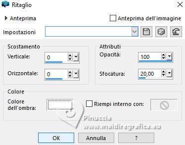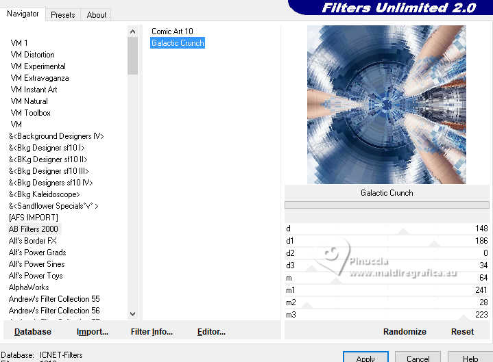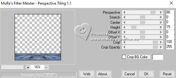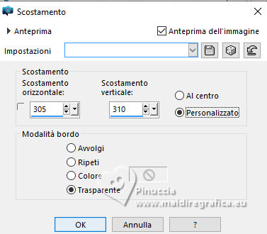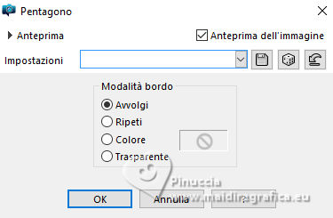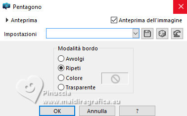 qui puoi trovare qualche risposta ai tuoi dubbi. Se l'argomento che ti interessa non è presente, ti prego di segnalarmelo. Questo tutorial è stato realizzato con PSP2020 e tradotto con PSPX9, ma può essere realizzato anche con le altre versioni di PSP. Dalla versione X4, il comando Immagine>Rifletti è stato sostituito con Immagine>Capovolgi in orizzontale, e il comando Immagine>Capovolgi con Immagine>Capovolgi in verticale. Nelle versioni X5 e X6, le funzioni sono state migliorate rendendo disponibile il menu Oggetti. Con la nuova versione X7, sono tornati Rifletti>Capovolgi, ma con nuove varianti. Vedi la scheda sull'argomento qui Occorrente: Tubes a scelta: 1 tube principale 1 immagine di sfondo Nient'altro Filtri: in caso di dubbi, ricorda di consultare la mia sezione filtri qui Filters Unlimited 2.0 qui AB Filters 2000 - Galactic Crunch (da importare in Unlimited) qui Mura's Meister - Perspective Tiling qui ![]() non esitare a cambiare modalità di miscelatura e opacità secondo i colori utilizzati. ![]() 1. Apri una nuova immagine trasparente 900 x 900 pixels. Scegli due colori dal tuo tube. Per l'esempio: Imposta il colore di primo piano con #2d5a9e. e il colore di sfondo con #ffffff. ![]() 2. Selezione>Seleziona. Apri la tua immagine di sfondo e vai a Modifica>Copia. Torna al tuo lavoro e vai a Modifica>Incolla nella selezione. Apri il tuo tube e vai a Modifica>Copia. Torna al tuo lavoro e vai a Modifica>Incolla nella selezione. Selezione>Deseleziona. 3. Effetti>Plugins>Filters Unlimited 2.0 - AB Filters 2000 - Galactic Crunch, con i settaggi standard ![]() Livelli>Duplica. Immagine>Rifletti>Rifletti orizzontalmente. Abbassa l'opacità di questo livello al 50%. Livelli>Unisci>Unisci giù. 4. Livelli>Duplica. Immagine>Ruota per gradi - 90 gradi a sinistra. ![]() Abbassa l'opacità di questo livello al 50%. Livelli>Unisci>Unisci giù. Modifica>Copia. Modifica>Incolla come nuova immagine e minimizza questa immagine. 5. Torna al tuo lavoro. Effetti>Effetti di immagine>Motivo unico, con i settaggi standard. ![]() 6. Livelli>Duplica. Effetti>Effetti geometrici>Inclina. ![]() 7. Effetti>Effetti geometrici>Cerchio. ![]() 8. Effetti>Effetti geometrici>Pentagono. ![]() 9. Effetti>Effetti geometrici>Pentagono. ![]() 10. Effetti>Effetti geometrici>Cerchio. ![]() 11. Effetti>Effetti 3D>Sfalsa ombra, colore bianco. ![]() Regola>Messa a fuoco>Metti a fuoco. Livelli>Duplica. Immagine>Rifletti>Rifletti orizzontalmente. Livelli>Unisci>Unisci giù. Livelli>Duplica. Immagine>Rifletti>Rifletti verticalmente. Abbassa l'opacità di questo livello al 50%. Livelli>Unisci>Unisci giù. 12. Livelli>Duplica. Immagine>Ridimensiona, al 50%, tutti i livelli non selezionato. Regola>Messa a fuoco>Metti a fuoco 13. Livelli>Duplica. Immagine>Ridimensiona, al 50%, tutti i livelli non selezionato. Regola>Messa a fuoco>Metti a fuoco. Livelli>Unisci>Unisci giù - 2 volte. 14. Livelli>Duplica. Immagine>Ridimensiona, al 30%, tutti i livelli non selezionato. Regola>Messa a fuoco>Metti a fuoco. 15. Effetti>Effetti di immagine>Scostamento. ![]() Livelli>Duplica. Immagine>Rifletti>Rifletti orizzontalmente. 16. Attiva il livello Raster 1. Livelli>Duplica. Effetti>Plugins>Mura's Meister - Perspective Tiling. ![]() Effetti>Effetti 3D>Sfalsa ombra, con i settaggi precedenti. ![]() 17. Attiva il livello superiore. Apri il tube principale e vai a Modifica>Copia. Torna al tuo lavoro e vai a Modifica>Incolla come nuovo livello. Immagine>Ridimensione, se necessario, tutti i livelli non selezionato. Regola>Messa a fuoco>Metti a fuoco. Posiziona correttamente il tube.Effetti>Effetti 3D>Sfalsa ombra, con i settaggi precedenti. ![]() 18. Attiva lo strumento Testo , scegli un font,e scrivi il tuo testo; io ho scritto Eulen Prinzessin Effetti>Effetti 3D>Sfalsa ombra, a scelta. Posiziona il testo a tuo piacimento.19. Selezione>Seleziona tutto. Immagine>Aggiungi bordatura, 50 pixels, simmetriche, colore #ffffff. Selezione>Inverti. Attiva l'immagine che hai minimizzato al punto 4 (se vuoi, puoi anche usare un'altra immagine). Modifica>Copia. Torna al tuo lavoro e vai a Modifica>Incolla nella selezione. Effetti>Effetti 3D>Smusso a incasso ![]() 20. Selezione>Inverti. Effetti>Effetti 3D>Ritaglio, colore bianco. ![]() 21. Attiva lo strumento Testo , scegli un font,Scrivi il tuo nome, o aggiungi il tuo watermark. Effetti>Effetti 3D>Sfalsa ombra, a scelta. 22. Livelli>Unisci>Unisci tutto e salva in formato jpg. ![]() ![]() Le vostre versioni. Grazie ![]() Se hai problemi o dubbi, o trovi un link non funzionante, o anche soltanto per un saluto, scrivimi. |