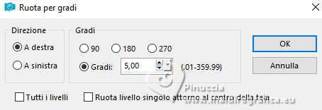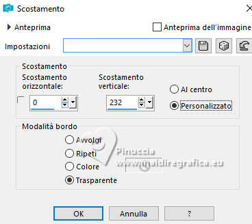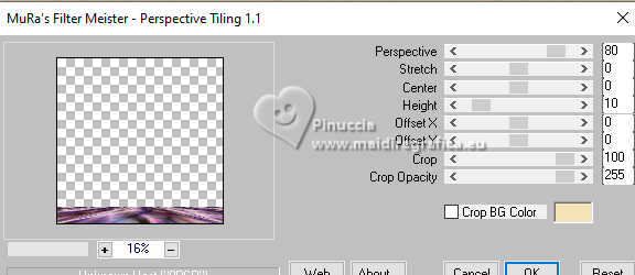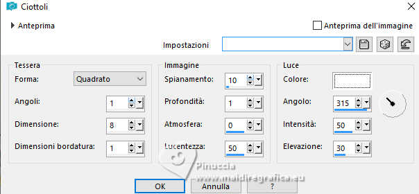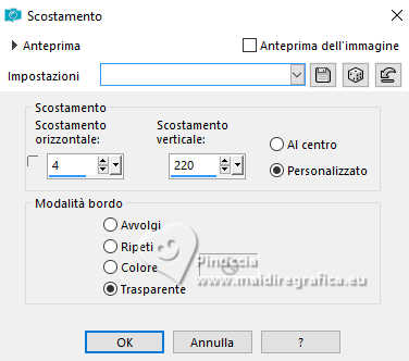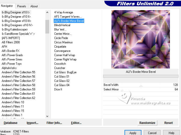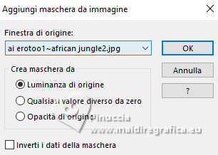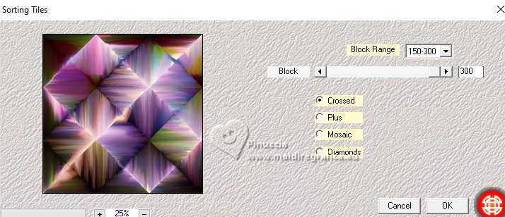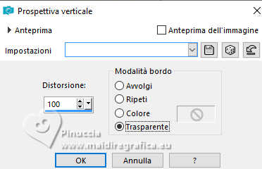 qui puoi trovare qualche risposta ai tuoi dubbi. Se l'argomento che ti interessa non è presente, ti prego di segnalarmelo. Questo tutorial è stato realizzato con PSP2020 e tradotto con PSPX9, ma può essere realizzato anche con le altre versioni di PSP. Dalla versione X4, il comando Immagine>Rifletti è stato sostituito con Immagine>Capovolgi in orizzontale, e il comando Immagine>Capovolgi con Immagine>Capovolgi in verticale. Nelle versioni X5 e X6, le funzioni sono state migliorate rendendo disponibile il menu Oggetti. Con la nuova versione X7, sono tornati Rifletti>Capovolgi, ma con nuove varianti. Vedi la scheda sull'argomento qui Occorrente: 1 tube 1 tube accessorio 1 immagine di sfondo Il resto del materiale (una maschera) ![]() in questa pagina trovi i links ai siti dei creatori di tubes) Filtri: in caso di dubbi, ricorda di consultare la mia sezione filtri qui Filters Unlimited 2.0 qui &<Bkg Designer sf10I> - ALFs Border Mirror Bevel (da importare in Unlimited) qui Mehdi - Sorting Tiles qui Mura's Meister - Perspective Tiling qui Flaming Pear - Flexify 2 qui Carolaine and Sensibility - CS_LDots, CS_DLines qui ![]() non esitare a cambiare modalità di miscelatura e opacità secondo i colori utilizzati. ![]() Apri la maschera in PSP e minimizzala con il resto del materiale. 1. Apri una nuova immagine trasparente 900 x 900 pixels. Scegli due colori dal tuo tube, per l'esempio colore di primo piano #8c7091 colore di sfondo #f6e3b5. ![]() 2. Selezione>Seleziona tutto. Apri la tua immagine di sfondo e vai a Modifica>Copia. Torna al tuo lavoro e vai a Modifica>Incolla nella selezione. Apri il tuo tube e vai a Modifica>Copia. Torna al tuo lavoro e vai a Modifica>Incolla nella selezione. Selezione>Deseleziona. 3. Effetti>Plugins>Mehdi - Sorting Tiles. ![]() 4. Effetti>Effetti di immagine>Motivo unico, con i settaggi standard. ![]() 5. Effetti>Plugins>&<Bkg Designer sf10I> - ALFs Border Mirror Bevel ![]() Regola>Messa a fuoco>Metti a fuoco. Modifica>Copia. Modifica>Incolla come nuova immagine, e minimizza questa immagine, che ti servirà più tardi. 6. Livelli>Duplica. Effetti>Effetti geometrici>Prospettiva verticale. ![]() Livelli>Duplica. Immagine>Rifletti>Rifletti verticalmente (Immagine>Capovolgi). Livelli>Unisci>Unisci giù. 7. Effetti>Plugins>Flaming Pear - Flexify 2 ![]() 8. Immagine>Ruota per gradi - 5 gradi a destra ![]() 9. Effetti>Effetti di immagine>Scostamento. ![]() 10. Effetti>Plugins>Caroline and Sensibility - CS DLines ![]() Livelli>Duplica. Immagine>Rifletti>Rifletti verticalmente (Immagine>Capovolgi). 11. Effetti>Effetti 3D>Sfalsa ombra, colore nero. ![]() 12. Effetti>Effetti di immagine>Scostamento. ![]() 13. Livelli>Nuovo livello raster. Riempi il livello con il colore di sfondo.Livelli>Nuovo livello maschera>Da immagine. Apri il menu sotto la finestra di origine e vedrai la lista dei files aperti. Seleziona la maschera ai erotoo1-african jungle ![]() Livelli>Duplica. Livelli>Unisci>Unisci gruppo. Regola>Messa a fuoco>Metti a fuoco. 14. Effetti>Effetti 3D>Sfalsa ombra, colore nero. ![]() 15. Attiva il livello Raster 1. Livelli>Duplica. Effetti>Plugins>Mura's Meister - Perspective Tiling ![]() Effetti>Effetti 3D>Sfalsa ombra, colore nero. ![]() 16. Attiva il livello superiore. Apri il tuo primo tube accessorio e vai a Modifica>Copia. Torna al tuo lavoro e vai a Modifica>Incolla come nuovo livello. Immagine>Ridimensiona, se necessario. Regola>Messa a fuoco>Metti a fuoco. Sposta il tube a destra.Effetti>Effetti 3D>Sfalsa ombra, colore nero. ![]() 17. Apri il tuo tube e vai a Modifica>Copia. Torna al tuo lavoro e vai a Modifica>Incolla come nuovo livello. Immagine>Ridimensiona, se necessario. Regola>Messa a fuoco>Metti a fuoco. Sposta il tube a destra.Effetti>Effetti 3D>Sfalsa ombra, colore nero. ![]() 18. Selezione>Seleziona tutto. Immagine>Aggiungi bordatura, 50 pixels, simmetriche, colore di primo piano #8c7091. Selezione>Inverti. Attiva l'immagine di sfondo che hai minimizzato al punto 5 e vai a Modifica>Copia. Torna al tuo lavoro e vai a Modifica>Incolla nella selezione. Regola>Sfocatura>Sfocatura gaussiana - raggio 20. ![]() 19. Effetti>Effetti di trama>Ciottoli ![]() 20. Effetti>Effetti 3D>Ritaglio. ![]() Selezione>Deseleziona. 21. Attiva lo strumento Testo ![]() Scrivi il tuo nome o il tuo watermark. Effetti>Effetti 3D>Sfalsa ombra, a scelta. 22. Livelli>Unisci>Unisci tutto e salva in formato jpg. ![]() Le vostre versioni. Grazie ![]() Irene ![]() Se hai problemi o dubbi, o trovi un link non funzionante, o anche soltanto per un saluto, scrivimi. |